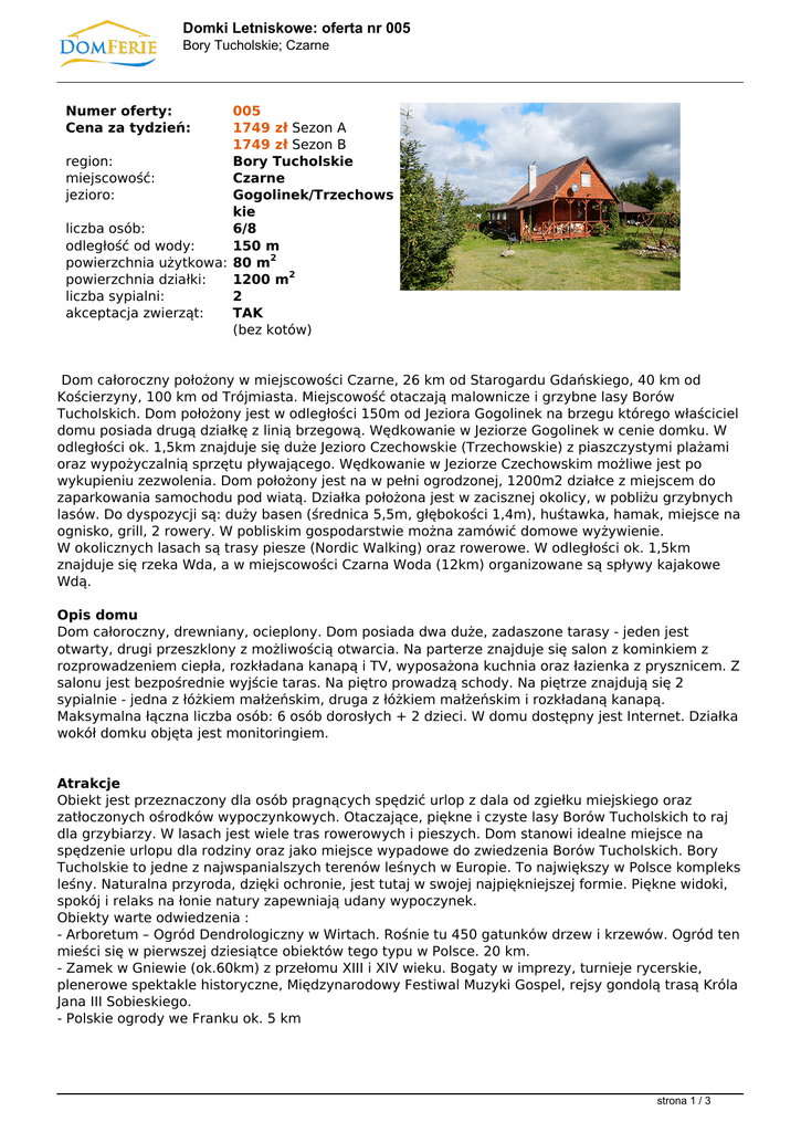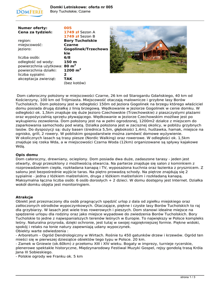 Domki Letniskowe: oferta nr 005 Bory Tucholskie; Czarne Numer oferty: Cena za tydzień: 005 1749 zł Sezon A 1749 zł Sezon B region: Bory Tucholskie miejscowość: Czarne jezioro: Gogolinek/Trzechows kie liczba osób: 6/8 odległość od wody: 150 m powierzchnia użytkowa: 80 m2 powierzchnia działki: 1200 m2 liczba sypialni: 2 akceptacja zwierząt: TAK (bez kotów) Dom całoroczny położony w miejscowości Czarne, 26 km od Starogardu Gdańskiego, 40 km od Kościerzyny, 100 km od Trójmiasta. Miejscowość otaczają malownicze i grzybne lasy Borów Tucholskich. Dom położony jest w odległości 150m od Jeziora Gogolinek na brzegu którego właściciel domu posiada drugą działkę z linią brzegową. Wędkowanie w Jeziorze Gogolinek w cenie domku. W odległości ok. 1,5km znajduje się duże Jezioro Czechowskie (Trzechowskie) z piaszczystymi plażami oraz wypożyczalnią sprzętu pływającego. Wędkowanie w Jeziorze Czechowskim możliwe jest po wykupieniu zezwolenia. Dom położony jest na w pełni ogrodzonej, 1200m2 działce z miejscem do zaparkowania samochodu pod wiatą. Działka położona jest w zacisznej okolicy, w pobliżu grzybnych lasów. Do dyspozycji są: duży basen (średnica 5,5m, głębokości 1,4m), huśtawka, hamak, miejsce na ognisko, grill, 2 rowery. W pobliskim gospodarstwie można zamówić domowe wyżywienie. W okolicznych lasach są trasy piesze (Nordic Walking) oraz rowerowe. W odległości ok. 1,5km znajduje się rzeka Wda, a w miejscowości Czarna Woda (12km) organizowane są spływy kajakowe Wdą. Opis domu Dom całoroczny, drewniany, ocieplony. Dom posiada dwa duże, zadaszone tarasy - jeden jest otwarty, drugi przeszklony z możliwością otwarcia. Na parterze znajduje się salon z kominkiem z rozprowadzeniem ciepła, rozkładana kanapą i TV, wyposażona kuchnia oraz łazienka z prysznicem. Z salonu jest bezpośrednie wyjście taras. Na piętro prowadzą schody. Na piętrze znajdują się 2 sypialnie - jedna z łóżkiem małżeńskim, druga z łóżkiem małżeńskim i rozkładaną kanapą. Maksymalna łączna liczba osób: 6 osób dorosłych + 2 dzieci. W domu dostępny jest Internet. Działka wokół domku objęta jest monitoringiem. Atrakcje Obiekt jest przeznaczony dla osób pragnących spędzić urlop z dala od zgiełku miejskiego oraz zatłoczonych ośrodków wypoczynkowych. Otaczające, piękne i czyste lasy Borów Tucholskich to raj dla grzybiarzy. W lasach jest wiele tras rowerowych i pieszych. Dom stanowi idealne miejsce na spędzenie urlopu dla rodziny oraz jako miejsce wypadowe do zwiedzenia Borów Tucholskich. Bory Tucholskie to jedne z najwspanialszych terenów leśnych w Europie. To największy w Polsce kompleks leśny. Naturalna przyroda, dzięki ochronie, jest tutaj w swojej najpiękniejszej formie. Piękne widoki, spokój i relaks na łonie natury zapewniają udany wypoczynek. Obiekty warte odwiedzenia : - Arboretum – Ogród Dendrologiczny w Wirtach. Rośnie tu 450 gatunków drzew i krzewów. Ogród ten mieści się w pierwszej dziesiątce obiektów tego typu w Polsce. 20 km. - Zamek w Gniewie (ok.60km) z przełomu XIII i XIV wieku. Bogaty w imprezy, turnieje rycerskie, plenerowe spektakle historyczne, Międzynarodowy Festiwal Muzyki Gospel, rejsy gondolą trasą Króla Jana III Sobieskiego. - Polskie ogrody we Franku ok. 5 km strona 1 / 3 Domki Letniskowe: oferta nr 005 Bory Tucholskie; Czarne - Odry – cmentarzysko z IV wieku składające się z kamiennych kręgów i kurhanów. Ok. 30 km - Akwedukt w Fojutowie – unikatowy zabytek architektury hydrotechnicznej wzorowany na antycznych rzymskich budowlach - ok. 35km - Malbork z największym zamkiem Krzyżackim – 65 km - Trójmiasto – 100 km Charakterystyka obiektu: - Maksymalna liczba osób: 6/8* - 1 Sypialnia: łóżko 2 os.: parter - 2 Sypialnia: łóżko 2 os. + kanapa 2 os.: piętro - Dodatkowe spanie: kanapa, salon - Bielizna pościelowa: 10zł/os/pobyt - Lodówka: tak - Kuchnia: parter - Kuchenka: gazowa 4 palniki + piekarnik elektryczny - Mikrofala: tak - Łazienka: z prysznicem + WC: parter Charakterystyka obiektu, c.d.: - TV: Polsat Cyfrowy/naziemna - Grill ogrodowy: tak - Meble ogrodowe: tak - Kąpiel w jeziorze: 150m/1,5km - Rowery: 2 szt. - Wypożyczalnia rowerów i sprzętu pływającego: Iwiczno, 1,5km - Wędkowanie: w cenie - J. Gogolinek/ pozostałe jeziora wykup zezwolenia (Iwiczno) - Restauracja/bar: domowe posiłki 100m/bar 1,5km - Pralka: tak - Lekarz, ośr. zdrowia: Kaliska, 7km - Sklep spożywczy: 1,5km/3km - Ogrzewanie: kominek z rozprowadzeniem - Bankomat: Kaliska, 7km - Spływy kajakowe: Czarna Woda, 12km - Ciepła woda: podgrzewacz przepływowy - Zwierzęta: bez kotów * Maksymalnie łącznie 8 osób: 6 osób dorosłych + 2 dzieci CENNIK: Podana poniżej i wyróżniona na pomarańczowo cena jest całkowitą ceną wynajmu domu na 1 tydzień - od soboty do soboty (zawiera w sobie kwotę rezerwacji i zaliczki). Dodatkowo dolicza się podane niżej opłady obowiązkowe i/lub nieobowiązkowe. Sezon A Sezon B TYLKO Weekendy: 25.06. - 20.08.2011. Poza sezonem A 29.04 - 03.05 (4 doby) wynajem za 1 tydzień w tym: 1749 zł/tydz --- --- - rezerwacja 349 zł/tydz --- --- - zaliczka 200 zł/tydz --- --- strona 2 / 3 Domki Letniskowe: oferta nr 005 Bory Tucholskie; Czarne OPŁATY DODATKOWE: 1. Zużycie energii elekt. wg wskazań licznika; koszt 80 gr. za 1 kWh 2. Zużycie wody wg licznika 10zł/m3 3. Sprzątanie domu po zakończeniu turnusu 150 zł jeżeli najemca nie chce sam wykonać tej pracy 4. Drewno do kominka 1 wsad gratis, dodatkowa wiązka 30 zł 5. Bielizna pościelowa 10 zł/osoba/pobyt 6. Każde zwierzę: 50 zł/tydz. (bez kotów) KAUCJA 300 zł Kaucja, pobierana przez właściciela w momencie przekazania kluczy, jest zwracana najemcy po potrąceniu kwoty opłat dodatkowych oraz ewentualnych uzasadnionych kosztów szkód powstałych z jego winy. strona 3 / 3 Powered by TCPDF (www.tcpdf.org)