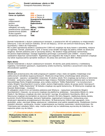 Domki Letniskowe: oferta nr 094 Szwajcaria Kaszubska; Sikorzyno Numer oferty: Cena za tydzień: 094 999 zł Sezon A 849 zł Sezon B region: Szwajcaria Kaszubska miejscowość: Sikorzyno jezioro: Dąbrowskie liczba osób: 6 odległość od wody: 800m / 1500m powierzchnia użytkowa: 40 m2 powierzchnia działki: 1300 m2 liczba sypialni: 3 akceptacja zwierząt: TAK Domek holenderski z dużym zadaszonym tarasem, o powierzchni 40 m2 położony w miejscowości Sikorzyno, 3 km od centrum Gołubia, 10 km od Stężycy, 10 km od centrum Kościerzyny, 8km do Szymbarku i 50km do Trójmiasta. Na w pełni ogrodzonej działce o powierzchni 1300 m2 znajduje się duży basen z plandeką, miejsce na ognisko, hamak, piaskownic i grill. Z tarasu oraz działki rozciąga się piękny widok na okoliczne wzgórza. Domek położony jest w zacisznej okolicy. Na działce mogą parkować samochody. Do Jeziora Dąbrowskiego i dużego kąpieliska gminnego z pomostem jest 1500m - można także swobodnie dojechać samochodem. Kąpielisko jest dogodne dla małych dzieci. Nad jeziorem znajduje się także wypożyczalnia sprzętów wodnych. Do plaży bez pomostu jest 800 metrów. Opis domu Domek holenderski z dużym zadaszonym tarasem. W domku jest pokój dzienny z rozkładaną rogówką i kominkiem gazowym, wyposażony aneks kuchenny, łazienka z prysznicem oraz dwie, dwuosobowe sypialnie. Atrakcje Obiekt jest przeznaczony dla osób pragnących spędzić urlop z dala od zgiełku miejskiego oraz zatłoczonych ośrodków wypoczynkowych. Okoliczne drogi leśne umożliwiają także aktywny wypoczynek - spacery i przejażdżki rowerowe. W okolicy około 7km znajdują się kurhany w leśnictwie Uniradze - polecamy spacer i odwiedzenie tego miejsca. Pobliskie Gołubie położone jest na terenie Kaszubskiego Parku Krajobrazowego, przy szlaku wodnym "Kółko Raduńskie" i na turystycznym szlaku Wzgórz Szymbarskich (czarny szlak). Jezioro Dąbrowskie należy do grupy jezior tworzących szlak wodny "Kółko Raduńskie" W Gołubiu znajduje się ogród botaniczny. W Sikorzynie znajduje się Dworek Wybickiego – muzeum. W odległości około 8 km od Gołubia położona jest Wieżyca - najwyższe wzniesienie Wzgórz Szymbarskich i Kaszub, na szczycie znajduje się platforma widokowa – Kaszubska Wieża im. Jana Pawła II. Na Wieżycy znajduje się stok narciarski i wyciąg. W pobliskim Szymbarku (8km od Sikorzyna) znajduje się kompleks ze słynnym Domem Do Góry Nogami, najdłuższą deską świata, bunkrem Gryfa Pomorskiego, domami Sybiraków, regionalnym browarem, restauracją oraz atrakcjami specjalnie przygotowanymi dla dzieci. W Kościerzynie (10km) jest aquapark, kino, dyskoteki, puby, sieciowe sklepy spożywcze i odzieżowe oraz pełne zaopatrzenie. Dodatkowo można zwiedzić skansen, sanktuaria, muzea i organizowane są imprezy sezonowe i okolicznościowe. Do Trójmiasta jest zaledwie 50km, więc można wybrać się na całodniową wycieczkę do Gdańska, na sopockie plaże czy do Gdyni. Charakterystyka obiektu: - Maksymalna liczba osób: 6 - 1 Sypialnia: łóżko 2 os. Charakterystyka obiektu, c.d.: - Ogrzewanie: kominek gazowy + grzejnik elektryczny - 2 Sypialnia: 2 łóżka 1 os. - Zwierzęta: tak - TV: "Na Kartę" strona 1 / 3 Domki Letniskowe: oferta nr 094 Szwajcaria Kaszubska; Sikorzyno - Dodatkowe spanie: salon, rogówka, 2 os. - Bielizna pościelowa: 15zł/os/pobyt - Lodówka: tak - Aneks kuchenny: tak - Kuchenka: gaz, 4 palniki, piekarnik gazowy i elektryczny - Czajnik: tak - Łazienka: z prysznic + WC - Ognisko na działce: tak - Grill ogrodowy: tak - Kąpiel w jeziorze: 800m kąpielisko bez pomostów i 1500m plaża z pomostami - Wypożyczalnia sprzętu wodnego: 1500 m - Wędkowanie: wykup zezwolenia w Gołubiu - Restauracja: 1,5 km/8km - Lekarz, ośr. zdrowia: 10 km - Sklep spożywczy: 1500 m - Lekarz: 10 km, Kościerzyna - Ciepła woda: Junkers CENNIK: Podana poniżej i wyróżniona na pomarańczowo cena jest całkowitą ceną wynajmu domu na 1 tydzień - od soboty do soboty (zawiera w sobie kwotę rezerwacji i zaliczki). Dodatkowo dolicza się podane niżej opłady obowiązkowe i/lub nieobowiązkowe. Sezon A Sezon B TYLKO Weekendy: 25.06. - 20.08.2011. Poza sezonem A 29.04 - 03.05 (4 doby) wynajem za 1 tydzień w tym: 999 zł/tydz 849 zł/tydz nie jest wynajmowany - rezerwacja 199 zł/tydz 149 zł/tydz ---- - zaliczka 200 zł/tydz 200 zł/tydz ---- OPŁATY DODATKOWE: 1. Zużycie energii elekt. wg wskazań licznika; koszt 80 gr. za 1 kWh. 2. Sprzątanie domu po zakończeniu turnusu 100 zł jeżeli najemca nie chce sam wykonać tej pracy. 3. Drewno do ogniska: spora wiązka 30 zł. 4. Bielizna pościelowa 15 zł osoba/pobyt 5. Każde zwierzę 50 zł/tydzień KAUCJA 300 zł Kaucja, pobierana przez właściciela w momencie przekazania kluczy, jest zwracana najemcy po strona 2 / 3 Domki Letniskowe: oferta nr 094 Szwajcaria Kaszubska; Sikorzyno potrąceniu kwoty opłat dodatkowych oraz ewentualnych uzasadnionych kosztów szkód powstałych z jego winy. strona 3 / 3 Powered by TCPDF (www.tcpdf.org)