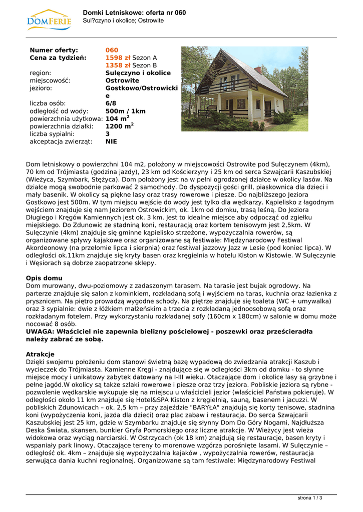 Domki Letniskowe: oferta nr 060 Sul?czyno i okolice; Ostrowite Numer oferty: Cena za tydzień: 060 1598 zł Sezon A 1358 zł Sezon B region: Sulęczyno i okolice miejscowość: Ostrowite jezioro: Gostkowo/Ostrowicki e liczba osób: 6/8 odległość od wody: 500m / 1km powierzchnia użytkowa: 104 m2 powierzchnia działki: 1200 m2 liczba sypialni: 3 akceptacja zwierząt: NIE Dom letniskowy o powierzchni 104 m2, położony w miejscowości Ostrowite pod Sulęczynem (4km), 70 km od Trójmiasta (godzina jazdy), 23 km od Kościerzyny i 25 km od serca Szwajcarii Kaszubskiej (Wieżyca, Szymbark, Stężyca). Dom położony jest na w pełni ogrodzonej działce w okolicy lasów. Na działce mogą swobodnie parkować 2 samochody. Do dyspozycji gości grill, piaskownica dla dzieci i mały basenik. W okolicy są piękne lasy oraz trasy rowerowe i piesze. Do najbliższego Jeziora Gostkowo jest 500m. W tym miejscu wejście do wody jest tylko dla wędkarzy. Kąpielisko z łagodnym wejściem znajduje się nam Jeziorem Ostrowickim, ok. 1km od domku, trasą leśną. Do Jeziora Długiego i Kręgów Kamiennych jest ok. 3 km. Jest to idealne miejsce aby odpocząć od zgiełku miejskiego. Do Zdunowic ze stadniną koni, restauracją oraz kortem tenisowym jest 2,5km. W Sulęczynie (4km) znajduje się gminne kąpielisko strzeżone, wypożyczalnia rowerów, są organizowane spływy kajakowe oraz organizowane są festiwale: Międzynarodowy Festiwal Akordeonowy (na przełomie lipca i sierpnia) oraz festiwal jazzowy Jazz w Lesie (pod koniec lipca). W odległości ok.11km znajduje się kryty basen oraz kręgielnia w hotelu Kiston w Kistowie. W Sulęczynie i Węsiorach są dobrze zaopatrzone sklepy. Opis domu Dom murowany, dwu-poziomowy z zadaszonym tarasem. Na tarasie jest bujak ogrodowy. Na parterze znajduje się salon z kominkiem, rozkładaną sofą i wyjściem na taras, kuchnia oraz łazienka z prysznicem. Na piętro prowadzą wygodne schody. Na piętrze znajduje się toaleta (WC + umywalka) oraz 3 sypialnie: dwie z łóżkiem małżeńskim a trzecia z rozkładaną jednoosobową sofą oraz rozkładanym fotelem. Przy wykorzystaniu rozkładanej sofy (160cm x 180cm) w salonie w domu może nocować 8 osób. UWAGA: Właściciel nie zapewnia bielizny pościelowej - poszewki oraz prześcieradła należy zabrać ze sobą. Atrakcje Dzięki swojemu położeniu dom stanowi świetną bazę wypadową do zwiedzania atrakcji Kaszub i wycieczek do Trójmiasta. Kamienne Kręgi - znajdujące się w odległości 3km od domku - to słynne miejsce mocy i unikatowy zabytek datowany na I-III wieku. Otaczające dom i okolice lasy są grzybne i pełne jagód.W okolicy są także szlaki rowerowe i piesze oraz trzy jeziora. Pobliskie jeziora są rybne pozwolenie wędkarskie wykupuje się na miejscu u właścicieli jezior (właściciel Państwa pokieruje). W odległości około 11 km znajduje się Hotel&SPA Kiston z kręgielnią, sauną, basenem i jacuzzi. W pobliskich Zdunowicach – ok. 2,5 km – przy zajeździe "BARYŁA" znajdują się korty tenisowe, stadnina koni (wypożyczenia koni, jazda dla dzieci) oraz plac zabaw i restauracja. Do serca Szwajcarii Kaszubskiej jest 25 km, gdzie w Szymbarku znajduje się słynny Dom Do Góry Nogami, Najdłuższa Deska Świata, skansen, bunkier Gryfa Pomorskiego oraz liczne atrakcje. W Wieżycy jest wieża widokowa oraz wyciąg narciarski. W Ostrzycach (ok 18 km) znajdują się restauracje, basen kryty i wspaniały park linowy. Otaczające tereny to morenowe wzgórza porośnięte lasami. W Sulęczynie – odległość ok. 4km – znajduje się wypożyczalnia kajaków , wypożyczalnia rowerów, restauracja serwująca dania kuchni regionalnej. Organizowane są tam festiwale: Międzynarodowy Festiwal strona 1 / 3 Domki Letniskowe: oferta nr 060 Sul?czyno i okolice; Ostrowite Akordeonowy (na przełomie lipca i sierpnia) oraz festiwal jazzowy Jazz w Lesie (pod koniec lipca) a także Rock w Rok Festiwal. Bogata infrastruktura turystyczna okolicy pozwala na aktywny wypoczynek. Dodatkowo, w Kościerzynie i w Bytowie znajdują się Aqua Parki oraz zabytki. W Tuchlinie, odległość 10km, znajduje się mini ZOO, a w Stryszej Budzie, 30km, znajduje się Park Miniatur z dodatkowymi atrakcjami dla dzieci. W Gołubiu, odległym o ok.10km znajduje się ogród botaniczny oraz kurhany w pobliskich lasach leśnictwa Uniradze. Polecamy także całodniową wycieczkę do Trójmiasta (70km) lub całodzienny wypad do Łeby na ruchome wydmy i Parku Dinozaurów (75km). Charakterystyka obiektu: - Maksymalna liczba osób 6/8*: Charakterystyka obiektu, c.d.: - Lodówka: mała - TV: naziemna - 1 Sypialnia: łóżko małżeńskie: piętro - 2 Sypialnia: łóżko małżeńskie piętro - 3 sypialnia: sofa 1 os. + rozkładany fotel 1os.: piętro - Dodatkowe spanie: sofa 2 os.: parter, salon - Bielizna pościelowa: we własnym zakresie - Łazienka z prysznicem: parter - WC + umywalka: piętro - Salon z kominkiem: parter - Kuchnia: parter - Kuchenka: 2 palniki, elektryczna - Mikrofala: tak - Ciepła woda: bojler elektryczny - Ogrzewanie: kominek + grzejniki elektryczne - Zwierzęta domowe: nie Grill przenośny: tak Ognisko na działce: nie Kąpiel w jeziorze: 1 km Meble tarasowe: bujak Restauracja/bar: 4km/3 km Lekarz: 4 k, Sulęczyno Sklep spożywczy: 4,5 km Stadnina koni: 2,5 km Kamienne Kręgi: 3 km CENNIK: Podana poniżej i wyróżniona na pomarańczowo cena jest całkowitą ceną wynajmu domu na 1 tydzień - od soboty do soboty (zawiera w sobie kwotę rezerwacji i zaliczki). Dodatkowo dolicza się podane niżej opłady obowiązkowe i/lub nieobowiązkowe. Sezon A Sezon B TYLKO Weekendy: 25.06. - 20.08.2011. Poza sezonem A 29.04 - 03.05 (4 doby) wynajem za 1 tydzień w tym: 1598 zł/tydz 1358 zł/tydz nie jest wynajmowany - rezerwacja 299 zł/tydz 299 zł/tydz --- - zaliczka 300 zł/tydz 300 zł/tydz --- OPŁATY DODATKOWE: strona 2 / 3 Domki Letniskowe: oferta nr 060 Sul?czyno i okolice; Ostrowite 1. Zużycie energii elekt. wg wskazań