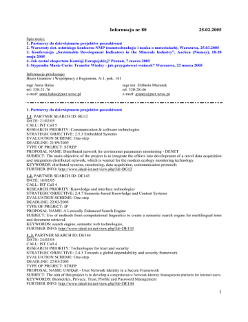 Informacja nr 80 25.02.2005 Spis treści: 1. Partnerzy do dziewiętnastu projektów poszukiwani 2. Warsztaty dot. ostatniego konkursu NMP (nanotechnologie i nauka o materiałach), Warszawa, 25.03.2005 3. Konferencja „Sustainable Development Indicators in the Minerals Industry”, Aachen (Niemcy), 18-20 maja 2005 4. Jak zostać ekspertem Komisji Europejskiej? Poznań, 7 marca 2005 5. Stypendia Marie Curie: Transfer Wiedzy - jak przygotować wniosek? Warszawa, 22 marca 2005 Informacje przekazuje: Biuro Grantów i Współpracy z Regionem, A-1, pok. 141 mgr Anna Hałas tel: 320-21-76 e-mail: [email protected] mgr inż. Elżbieta Mazurek tel. 320-28-46 e-mail: [email protected] 1. Partnerzy do dziewiętnastu projektów poszukiwani 1.1. PARTNER SEARCH ID: BG12 DATE: 21/02/05 CALL: IST Call 5 RESEARCH PRIORITY: Communication & software technologies STRATEGIC OBJECTIVE: 2.5.3 Embedded Systems EVALUATION SCHEME: One-step DEADLINE: 21/09/2005 TYPE OF PROJECT: STREP PROPOSAL NAME: Distributed network for environmet parameters monitoring - DENET SUBJECT: The main objective of the project is to integrate the efforts into development of a novel data acquisition and integration distributed network, which is wanted for the modern ecology monitoring technology. KEYWORDS: disributed systems, monitoring, data acquisition, communication protocols FURTHER INFO: http://www.ideal-ist.net/view.php?id=BG12 1.2. PARTNER SEARCH ID: DE143 DATE: 16/02/05 CALL: IST Call 4 RESEARCH PRIORITY: Knowledge and interface technologies STRATEGIC OBJECTIVE: 2.4.7 Semantic-based Knowledge and Content Systems EVALUATION SCHEME: One-step DEADLINE: 22/03/2005 TYPE OF PROJECT: IP PROPOSAL NAME: A Lexically Enhanced Search Engine SUBJECT: Use of methods from computational linguistics to create a semantic search engine for multilingual term and document retrieval. KEYWORDS: search engine, semantic web technologies, FURTHER INFO: http://www.ideal-ist.net/view.php?id=DE143 1. 3. PARTNER SEARCH ID: DE144 DATE: 24/02/05 CALL: IST Call 4 RESEARCH PRIORITY: Technologies for trust and security STRATEGIC OBJECTIVE: 2.4.3 Towards a global dependability and security framework EVALUATION SCHEME: One-step DEADLINE: 22/03/2005 TYPE OF PROJECT: STREP PROPOSAL NAME: UNIQuE - User Network Identity in a Secure Framework SUBJECT: The aim of this project is to develop a comprehensive Network Identity Management platform for Internet users. KEYWORDS: Biometrics, Privacy, Trust, Profile and Password Management FURTHER INFO: http://www.ideal-ist.net/view.php?id=DE144 1 1. 4. PARTNER SEARCH ID: DK23 DATE: 27/01/05 CALL: IST Call 4 RESEARCH PRIORITY: Knowledge and interface technologies STRATEGIC OBJECTIVE: 2.4.6 Network Audio Visual Systems and Home Platforms EVALUATION SCHEME: One-step DEADLINE: 22/03/2005 TYPE OF PROJECT: STREP PROPOSAL NAME: HQ, anytime and interactive Multilanguage audio/video distribution over wireless connections. SUBJECT:Development of advanced audio/visual digital platform/protocol with build-in memory/hard disc for personal services within digital broadcasting and broadband communication. This protocol will give the end-users access to content and interactive services at anytime, and the possibility to use the mobile phone as a remote control from anywhere in the World. KEYWORDS: Digital home; networked audio visual systems; broadband; streaming, high-quality; interactive, Multilanguage; HTML; MPEG-4; KML. FURTHER INFO: http://www.ideal-ist.net/view.php?id=DK23 1. 5. PARTNER SEARCH ID: DK24 DATE: 24/02/05 CALL: IST Call 5 RESEARCH PRIORITY: Communication & software technologies STRATEGIC OBJECTIVE: 2.5.5 Software and Services EVALUATION SCHEME: One-step DEADLINE: 21/09/2005 TYPE OF PROJECT: STREP PROPOSAL NAME: Intellimus-Intelligent Music Production SUBJECT: The objective of this project is to develop intelligent software components for music production. The main focus of the project is to develop components which will be able to predefine levels, dynamics, equalization, room simulation and leakage between microphones, so that ordinary users will be able to produce a semi professional mix. The components will support plug in facilities in the market leading software packages for music production. KEYWORDS: Music, multimedia FURTHER INFO: http://www.ideal-ist.net/view.php?id=DK24 1. 6. PARTNER SEARCH ID: DK25 DATE: 25/02/05 CALL: IST Call 4 RESEARCH PRIORITY: Research Addressing Work and Business Challenges STRATEGIC OBJECTIVE: 2.4.11 Integrated biomedical information for better health EVALUATION SCHEME: One-step DEADLINE: 22/03/2005 TYPE OF PROJECT: STREP PROPOSAL NAME: SIME - Security for Individuals and Management in Europe SUBJECT:The aim of this proposal is to develop product specifications for an instrument measuring blood and urine, establish a large knowledge database and to make extensive measurements on large amount of blood samples. The objective is to provide individuals in EU with a simple measurement instrument that can give reliable information, together with the database, on basic health parameters and indicators related to cancer, diabetes and rheumatism. KEYWORDS: IR Spectroscopy, personal health care, knowledge databases FURTHER INFO: http://www.ideal-ist.net/view.php?id=DK25 1. 7. PARTNER SEARCH ID: ES229 DATE: 17/02/05 CALL: IST Call 4 RESEARCH PRIORITY: Research Addressing Work and Business Challenges STRATEGIC OBJECTIVE: 2.4.13 Strengthening the Integration of the ICT research effort in an Enlarged Europe EVALUATION SCHEME: One-step 2 DEADLINE: 22/03/2005 TYPE OF PROJECT: STREP PROPOSAL NAME: ODISEA: Open Distance Inter-university Synergies in the EnlArged Europe SUBJECT: ODISEA is an Educational Technology project which will aim to address the critical success factors of the previous ODISEAME project for the design of an optimum e-learning environment taking into account technical factors as well as educative factors. KEYWORDS: eLearning, educational technology, educational methodologies, knowledge manage