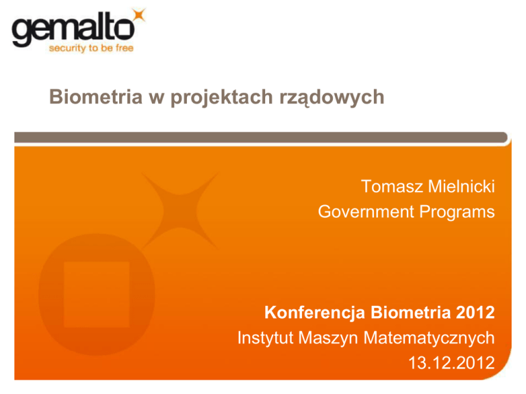Biometria w projektach rządowych Tomasz Mielnicki Government Programs Konferencja Biometria 2012 Instytut Maszyn Matematycznych 13.12.2012 Biometria – dwa cele Identyfikacja porównanie wzorca cechy biometrycznej osoby deklarującej (identyfikowanej) z istniejącym, znanym (przypisanym do jakiejś osoby) wzorcem cechy biomterycznej uzyskanym wcześniej porównanie 1 do N (wielu), „Mach on Terminal” niezbędna baza z danym biometrycznymi Uwierzytelnienie udowodnienie, że określony wzorzec cechy biometrycznej należy do określonej osoby porównanie 1 do 1, „Match on Card” lub „Match on Terminal” baza niepotrzebna jeśli wzorzec na bezpiecznym nośniku (MoC) uwierzytelnienie do usług tradycyjnych i elektronicznych do aplikacji na karcie W szczególnym przypadku identyfikacja i uwierzytelnienie to może być jedna czynność 11/12/2012 Presentation title – Security Level (Arial 10pt) 2 Biometria w projektach rządowych 1/2 Paszporty biometryczne biometria bardziej do identyfikacji, np. sprawdzenie w bazach typu AFIS do uwierzytelnienia: sprawdzenie czy posiadacz jest właścicielem, ale biometria nie dla posiadacza dostęp ma tylko wydawca paszportu i instytucje przez niego uprawnione korzyści raczej nie dla obywatela przymus nieodpowiednie dla e-usług Dowody osobiste biometria jak w paszporcie biometria do uwierzytelnienia (MoC) dla obywatela jako opcja korzyści obywatela odpowiednie dla e-usług może zastąpić PIN 11/12/2012 Presentation title – Security Level (Arial 10pt) 3 Biometria w projektach rządowych 2/2 Karty zdrowia biometria do uwierzytelnienia w systemie ochrony zdrowia raczej poza Europą E-głosowanie stworzenie bazy uprawnionych (rejestracja) identyfikacja i uwierzytelnienie podczas głosowania z użyciem karty bez użycia karty 11/12/2012 Presentation title – Security Level (Arial 10pt) 4 Biometria w dokumencie tożsamości Ogólne przypadki użycia: dodatkowa metoda weryfikacji tożsamości posiadacza karty mechanizm udowodnienia, że posiadacz karty jest jej prawnym właścicielem pomaga zwalczać przestępstwa i kradzież tożsamości dowód obecności obywatela zautomatyzowana lokalna lub zdalna weryfikacja tożsamości – zminimalizowany udział personelu dowód zgody obywatela przed udzieleniem dostępu do usługi ułatwienie dla obywatela, przy jednoczesnym zwiększeniu bezpieczeństwa systemu, ulepszenie mechanizmów niezaprzeczalności, minimalizowanie ryzyka bezprawnego transferu uprawnień. (mitigating risks of unlawful transfer of rights). biometryczny PUK wygodny i tani mechanizm odblokowywania kodu PIN dowód powiązań rodzinnych np. dołączanie odcisków palców niepełnoletnich dzieci do dokumentu tożsamości rodzica 11/12/2012 11 December 2012 Government Programs - Confidential 5 Przypadek użycia – uwierzytelnienie biometryczne 1. Terminal wyposażony w czytnik kart i skaner odcisku palca 2. Terminal inicjuje komunikację, karta i terminal uwierzytelniają się wzajemnie 3. Odcisk palca jest przesyłany do karty celem porównania 4. Jeśli wzorzec na karcie pasuje do odcisku pobranego, karta odpowiada pozytywnym komunikatem 5. Pozytywna weryfikacja nie uruchamia żadnych innych funkcji karty Uwierzytelnienie biometryczne jest używane w przypadku potrzeby silniejszego uwierzytelnienia (np. otwieranie konta w banku, otrzymania hipoteki, etc.), ale wymaga zgody obywatela. 6 Biometria w dokumencie tożsamości Uwierzytelnienie, BioPIN, e-usługi Biometria dla ludzi Aplikacje Biometria dla organów państwowych Aplikacja ID/ e-paszport Aplikacja PKI MSWiA Aplikacja podpisu kwal. Aplikacja karty zdrowia Aplikacja M-on-C Miejsce na inne aplikacje Aplet karty zdrowia Aplet M-on-C Miejsce na inne aplety Aplety Aplet ID Aplet PKI CC Wirtualna maszyna Java Identyfikacja Mikroprocesor 11/12/2012 7 Biometria: bezpieczne głosowanie Rejestracja wyborcy Samodzielna rejestracja Kampania rejestracji wyborców Identyfikacja wyborcy Match-on-card (MoC) Match-on-terminal (MoT) Weryfikacja w AFIS System głosowania Pieczęć w eID Znakowanie czasem Usage of biometry in e-voting 8 Odcisk palca jest dominującą cechą biometryczną w programach rządowych Biometric usage per application 100% 50% wdrożeń z biometrią to programy rządowe 90% 80% 70% Surveillance 60% Consumer ID 50% Device /System access 40% Access Control 30% 20% 39% 42% 44% 2009 2010 2011 47% 49% 51% Criminal ID Civil ID 10% 0% 2013 Biometric usage by technology 2014 Odcisk palca używany w 67% wszystkich projektów biometrycnzych (1:1 i 1:N). Match on card (1:1) z użyciem odcisku palca wzrost o 24% od 2009 Źródło: International Biometric Group 2009 11/12/2012 Billion $ 2012 10 9 8 7 6 5 4 3 2 1 0 Other Hand geometry Vein 1 1,5 1,8 2 2,5 2,9 Voice Face Face Fingerprint AFIS-live scan 2009 2010 2011 2012 2013 2014 9 Studium przypadku: Gabon Dwa projekty biometryczne narodowy program identyfikacji biomterycznej (IBOGA) biometryczna karta zdrowia IBOGA narodowy cywilny rejestr biometryczny rejestr wyborczy Karta zdrowia zawiera dwa odciski palców Match on Terminal 11/12/2012 Presentation title – Security Level (Arial 10pt) 10 Gabon – projekt IBOGA Cele: biometryczna baza danych nadrzędnym rejestrem przy wydawania wszelkich dokumentów dla obywateli, m.in. świadectw urodzenia, dowodów tożsamości, paszportów i praw jazdy rozszerzenie dostępnych metod identyfikacji obywatela podczas wyborów Rozwiązanie stworzenie nowej, elektronicznej listy połączonej z rejestrem biometrycznym. 11/12/2012 wyborców Presentation title – Security Level (Arial 10pt) 11 Gabon – karta zdrowia Cele: stworzenie systemu opieki zdrowotnej - w pierwszej kolejności dla osób niezamożnych, a następnie rozszerzenie na całą populację zapobieżenie załamania się systemu finansowania poprzez eliminację /minimalizację możliwości nadużyć Wymagania: silne uwierzytelnienie (-> wykorzystanie biometrii i PKI) ochrona prywatności (-> biometria w chipie, offline MoT) Rozwiązanie: