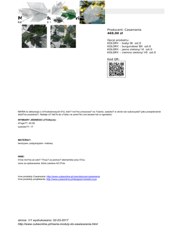 http://www.cubeonline.pl MARIA moduły do zawieszania kategoria: Kategorie > AKCESORIA Producent: Casamania 469,00 zł Opcje produktu: KOLORY: : biały/ BI szt.0 KOLORY: : burgundow/ BX szt.0 KOLORY: : jasno zielony/ VI szt.0 KOLORY: : ciemno zielony/ VS szt.0 Kod QR: MARIA to dekoracja z ró?nokolorowych li?ci, któr? mo?na umocowa? na ?cianie, zawiesi? w oknie lub wykorzysta? jako przepierzenie dziel?ce przestrze?. Nadaje si? tak?e do u?ytku na zewn?trz (na tarasie lub w ogrodzie). WYMIARY JEDNEGO LI?CIA(cm): d?ugo??- 22,50 szeroko??- 17 MATERIA?: tworzywo- polypropylen- matowy INNE: li?cie mo?na ze sob? ??czy? za pomoc? elementów przy li?ciu cena za opkaowanie, które zawiera 42 li?cie Inne produkty Casamania: http://www.cubeonline.pl/manufacturer/casamania Inne produkty projektanta: http://www.cubeonline.pl/designer/nichetto-luca strona: 1/1 wydrukowano: 02-03-2017 http://www.cubeonline.pl/maria-moduly-do-zawieszania.html
