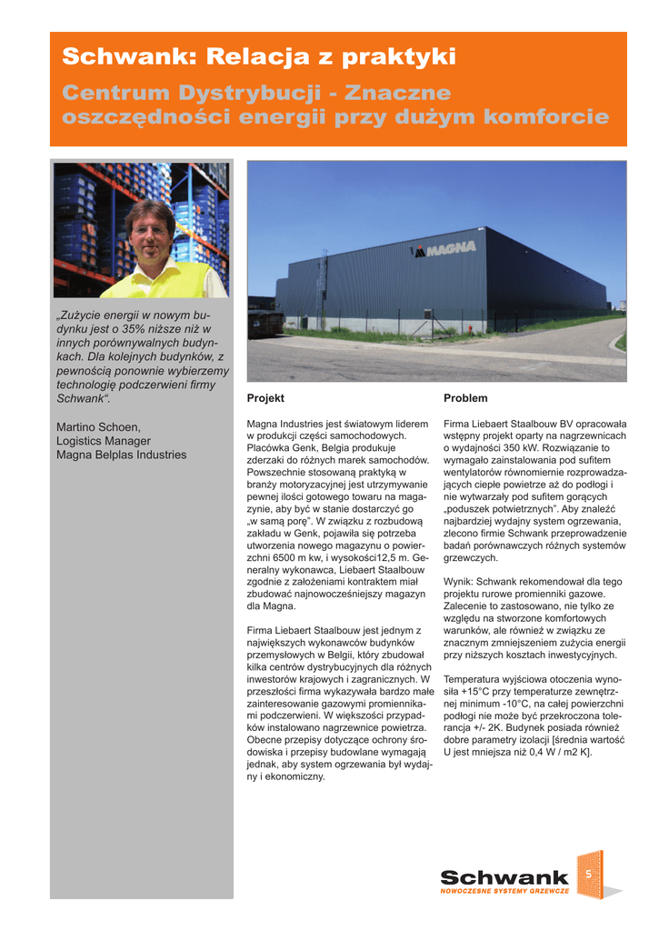 Schwank: Relacja z praktyki Centrum Dystrybucji - Znaczne oszczędności energii przy dużym komforcie „Zużycie energii w nowym budynku jest o 35% niższe niż w innych porównywalnych budynkach. Dla kolejnych budynków, z pewnością ponownie wybierzemy technologię podczerwieni firmy Schwank“. Martino Schoen, Logistics Manager Magna Belplas Industries Projekt Problem Magna Industries jest światowym liderem w produkcji części samochodowych. Placówka Genk, Belgia produkuje zderzaki do różnych marek samochodów. Powszechnie stosowaną praktyką w branży motoryzacyjnej jest utrzymywanie pewnej ilości gotowego towaru na magazynie, aby być w stanie dostarczyć go „w samą porę”. W związku z rozbudową zakładu w Genk, pojawiła się potrzeba utworzenia nowego magazynu o powierzchni 6500 m kw, i wysokości12,5 m. Generalny wykonawca, Liebaert Staalbouw zgodnie z założeniami kontraktem miał zbudować najnowocześniejszy magazyn dla Magna. Firma Liebaert Staalbouw BV opracowała wstępny projekt oparty na nagrzewnicach o wydajności 350 kW. Rozwiązanie to wymagało zainstalowania pod sufitem wentylatorów równomiernie rozprowadzających ciepłe powietrze aż do podłogi i nie wytwarzały pod sufitem gorących „poduszek potwietrznych”. Aby znaleźć najbardziej wydajny system ogrzewania, zlecono firmie Schwank przeprowadzenie badań porównawczych różnych systemów grzewczych. Firma Liebaert Staalbouw jest jednym z największych wykonawców budynków przemysłowych w Belgii, który zbudował kilka centrów dystrybucyjnych dla różnych inwestorów krajowych i zagranicznych. W przeszłości firma wykazywała bardzo małe zainteresowanie gazowymi promiennikami podczerwieni. W większości przypadków instalowano nagrzewnice powietrza. Obecne przepisy dotyczące ochrony środowiska i przepisy budowlane wymagają jednak, aby system ogrzewania był wydajny i ekonomiczny. Wynik: Schwank rekomendował dla tego projektu rurowe promienniki gazowe. Zalecenie to zastosowano, nie tylko ze względu na stworzone komfortowych warunków, ale również w związku ze znacznym zmniejszeniem zużycia energii przy niższych kosztach inwestycyjnych. Temperatura wyjściowa otoczenia wynosiła +15°C przy temperaturze zewnętrznej minimum -10°C, na całej powierzchni podłogi nie może być przekroczona tolerancja +/- 2K. Budynek posiada również dobre parametry izolacji [średnia wartość U jest mniejsza niż 0,4 W / m2 K]. Schwank: Relacja z praktyki Centrum Dystrybucji - Znaczne oszczędności energii przy dużym komforcie Rozwiązanie Wyniki Liebaert zdecydował się na przedstawioną koncepcję z izolowanymi wysokowydajnymi promiennikami [calorSchwank]. Dzięki ich bardzo wysokiej sprawności znacznie mniejsze jest zużycie energii oraz emisja dwutlenku węgla niż w przypadku konwencjonalnych układów ciepłego powietrza. Ten nowoczesny system przy jedynie 245 kW oszczędza ponad 35% kosztów pierwotnie planowanego systemu ciepłego powietrza. Cały personel docenia nie tylko komfortowe ciepło, ale również cichą pracę. Również przeciągi są całkowicie wyeliminowane ze względu na brak nieefektywnych wentylatorów. Nawet podczas pierwszej mroźnej zimy, kiedy temperatury na zewnątrz spadły znacznie poniżej średniej, temperatura w pomieszczeniu była utzrymana. Stałe pomiary temperatury wskazują, że nawet w najzimniejsze dni tolerancja +/- 2K nigdy nie została przekroczona. Urządzenia są zamontowane nad każdymi bramami, gdzie mają miejsce największe straty ciepła. By udowodnić równomierne rozprowadzenie ciepła w budynku zainstalowano kilka czujników temperatury na drugim końcu budynku. System BMS [Building Management System] kontroluje dwie niezależne strefy grzewcze. Pan Martino Schoen potwierdza: „System ogrzewania daje komfortowe ciepło, bez hałasu i przeciągów. Zużycie energii w nowym budynku jest 35% niższe niż w innych porównywalnych budynkach. Dla kolejnych budynków, z pewnością ponownie wybierzemy technologię podczerwieni firmy Schwank“. W ciągu ostatnich 5 lat Schwank ogrzał ponad 12 milionów metrów kwadratowych centrów dystrybucyjnych i magazynów. To doświadczenie z wysoką jakością i efektywnym ciepłem jest doceniane przez klientów, takich jak DHL, TNT, FedEx, Nippon Cargo, UPS, Amazon i wielu innych. Polska Niemcy Schwank Polska Sp.zo.o ul. Targowa 5 41-503 Chorzów Tel.: +48-32-201 05 58 Fax: +48-32-201 05 59 E-mail: [email protected] Internet: www.schwank.pl Schwank GmbH Bremerhavener Str. 43 50735 Cologne Tel.: +49-(0)221-7176 0 Fax: +49-(0)221-7176 288 E-mail: [email protected] Internet: www.schwank.de
