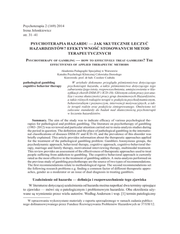 Psychoterapia 2 (169) 2014 Irena Jelonkiewicz str. 31–41 Psychoterapia hazardu — jak skutecznie leczyć hazardzistów? Efektywność stosowanych metod terapeutycznych Psychotherapy of gambling — how to effectively treat gamblers? The effectivenes of applied therapeutic methods Akademia Pedagogiki Specjalnej w Warszawie Katedra Psychologii Klinicznej Człowieka Dorosłego Kierownik: prof. dr hab. Czesław Czabała pathological gambling cognitive behavior therapy W artykule dokonano przeglądu piśmiennictwa dotyczącego psychoterapii hazardu, a także piśmiennictwa dotyczącego tego zaburzenia (jego istoty, rozpowszechnienia, umiejscowienia w klasyfikacji chorób DSM-IV i ICD-10). Głównym celem pracy jest analiza i ocena skuteczności pracy grup Anonimowych Hazardzistów, a także różnych rodzajów terapii w podejściu psychodynamicznym, behawioralnym i poznawczym, interwencji motywacyjnych, a także terapii rodzin oraz podejścia zintegrowanego. Omówiono też zalecane standardy do badań nad skutecznością psychoterapii w leczeniu hazardzistów. Summary. The aim of the study was to indicate efficacy of various psychological therapies for pathological and problem gambling. The literature on psychotherapy of gambling (1983–2012) was reviewed and particular attention carried out to meta-analysis studies during the period in question. The definition and the place of pathological gambling in the international classifications of diseases DSM-IV and ICD-10, and the prevalence of this disorder was briefly explained. This article provides information about the therapeutic approaches applied for the treatment of the pathological gambling problem: Gamblers Anonymous groups, the psychodynamic approach, behavioral therapy, cognitive approach, cognitive-behavioral therapy, marriage and family therapy, motivational interviewing therapy, multimodal treatment. This review provides an assessment of the effectiveness of therapeutic approaches used to treat people suffering from addiction to gambling. The cognitive behavioral approach is currently rated as the most effective in the treatment of gambling addicts. A meta-analysis performed on the previous study of gambling psychotherapy are the source of two types of recommendations. The first recommendations relate to methodological rigour. The second recommendations set the following research problems e.g. finding a common factor of different therapeutic approaches, gender as a moderator or an issue of dual diagnosis in treating gamblers. Uzależnienie od hazardu — definicja i rozpowszechnienie tego zjawiska W literaturze dotyczącej uzależnienia od hazardu można napotkać dwa terminy opisujące to zjawisko — mówi się o patologicznym i problemowym hazardzie. Oba określenia używane są wymiennie przez wielu autorów. Według Anderson i wsp. [1] termin patologiczny W opracowaniu wykorzystano materiały z raportu sporządzonego w ramach zadania publicznego dofinansowywanego przez Fundusz Rozwiązywania Problemów Hazardowych nr 37/I/H/12. 32 Irena Jelonkiewicz hazard jest stosowany w USA, Kanadzie, Europie i opisuje kliniczną formę zaburzonego zachowania, natomiast termin problemowy hazard — subkliniczną manifestację tego zaburzenia. U autorów z Australii i Nowej Zelandii mamy do czynienia z powszechnym użyciem słowa problemowy hazard, które z kolei opisuje zróżnicowany zakres wszelkich trudności hazardzisty. Inne określenia, charakteryzujące zachowanie osoby uzależnionej od hazardu, to: „ryzykowne”, „zaburzone”, „problematyczne”, „kompulsywne”, „ekscesywne”. Rozpowszechnienie problemowego hazardu jest najczęściej szacowane na 0,7% do 2,5% w populacji [1], ale np. w Niemczech na 0,2–0,6% [2], a w Hongkongu na 5,3% [3]. W grupie adolescentów u 4–8% osób można dostrzec zachowania spełniające kryteria patologicznego hazardu. Uzależnienie od hazardu jako odrębna jednostka chorobowa — nazwana kompulsywnym hazardem — pojawiło się w klasyfikacji chorób DSM-III już w 1980 r. W DSM-IV od 1994 r. w grupie zaburzeń kontroli impulsów odnajdziemy patologiczny hazard (312.31). W klasyfikacji ICD-10 Światowej Organizacji Zdrowia (WHO) patologiczny hazard jest umieszczony w dziale zaburzeń osobowości i zachowań dorosłych (F63.0). Odnotowywane jest częste współwystępowanie innych chorób: uzależnienia od substancji psychoaktywnych, zaburzeń osobowości, a zwłaszcza zaburzeń nastroju [4]. W badaniach wykryto wiele zewnętrznych i wewnętrznych korelatów uzależnienia od hazardu, ale nie istnieje jeden ogólnie przyjęty model wyjaśniający etiologię patologicznego hazardu. Korzystając z wypróbowanych metod leczenia uzależnień, dość szybko wyszukano analogie kliniczne między patologicznymi hazardzistami a osobami nadużywającymi alkoholu lub narkotyków i próbowano leczyć ten nowy typ zaburzeń również w placówkach medycznych. Istnieją jednak kontrowersje [5] co do rozumienia problemu patologicznego hazardu: czy jest on w większym stopniu zjawiskiem społecznym czy medycznie diagnozowanym zaburzeniem. Wedgeworth [5] przytacza klasyfikację typów hazardzisty: profesjonalnego, z osobowością antysocjalną, dorywczego, poważnie zaangażowanego, poszukującego ulgi i ucieczki, oraz kompulsywnego, i stwierdza, że tylko ten ostatni typ (kompulsywny) spełniałby kryterium choroby — uzależnienia od hazardu. Niezależnie od tak formułowanych zastrzeżeń diagnostycznych, od kilkudziesięciu lat pacjentom uzależnionym od hazardu przedstawia się ofertę leczenia psychoterapeutycznego. Stosowane metody leczenia Jedną z pierwszych (od 1955 r.) interwencji, które stosowano w leczeniu uzależnienia od hazardu, było kierowanie pacjentów do samopomocowych grup Anonimowych Hazardzistów (GA — Gamblers Anonymous). Zainteresowanie tą formą leczenia niewątpliwie wynikało z popularności ruchu AA. Uzupełnieniem grup GA były grupy dla małżonków hazardzistów — 