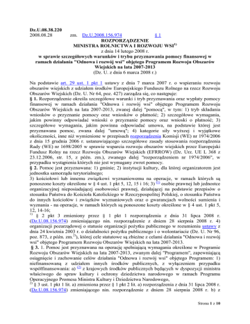 Dz.U.08.38.220 2008.08.28 zm. Dz.U.2008.156.974 §1 ROZPORZĄDZENIE MINISTRA ROLNICTWA I ROZWOJU WSI1) z dnia 14 lutego 2008 r. w sprawie szczegółowych warunków i trybu przyznawania pomocy finansowej w ramach działania "Odnowa i rozwój wsi" objętego Programem Rozwoju Obszarów Wiejskich na lata 2007-2013 (Dz. U. z dnia 6 marca 2008 r.) Na podstawie art. 29 ust. 1 pkt 1 ustawy z dnia 7 marca 2007 r. o wspieraniu rozwoju obszarów wiejskich z udziałem środków Europejskiego Funduszu Rolnego na rzecz Rozwoju Obszarów Wiejskich (Dz. U. Nr 64, poz. 427) zarządza się, co następuje: § 1. Rozporządzenie określa szczegółowe warunki i tryb przyznawania oraz wypłaty pomocy finansowej w ramach działania "Odnowa i rozwój wsi" objętego Programem Rozwoju Obszarów Wiejskich na lata 2007-2013, zwanej dalej "pomocą", w tym: 1) tryb składania wniosków o przyznanie pomocy oraz wniosków o płatność; 2) szczegółowe wymagania, jakim powinny odpowiadać wnioski o przyznanie pomocy oraz wnioski o płatność; 3) szczegółowe wymagania, jakim powinna odpowiadać umowa, na podstawie której jest przyznawana pomoc, zwana dalej "umową"; 4) kategorie siły wyŜszej i wyjątkowe okoliczności, inne niŜ wymienione w przepisach rozporządzenia Komisji (WE) nr 1974/2006 z dnia 15 grudnia 2006 r. ustanawiającego szczegółowe zasady stosowania rozporządzenia Rady (WE) nr 1698/2005 w sprawie wsparcia rozwoju obszarów wiejskich przez Europejski Fundusz Rolny na rzecz Rozwoju Obszarów Wiejskich (EFRROW) (Dz. Urz. UE L 368 z 23.12.2006, str. 15, z późn. zm.), zwanego dalej "rozporządzeniem nr 1974/2006", w przypadku wystąpienia których nie jest wymagany zwrot pomocy. § 2. Pomoc jest przyznawana: 1) gminie; 2) instytucji kultury, dla której organizatorem jest jednostka samorządu terytorialnego; 3) kościołowi lub innemu związkowi wyznaniowemu na operacje, w ramach których są ponoszone koszty określone w § 4 ust. 1 pkt 5, 12, 15 i 16; 3) (1) osobie prawnej lub jednostce organizacyjnej nieposiadającej osobowości prawnej, działającej na podstawie przepisów o stosunku Państwa do Kościoła Katolickiego w Rzeczypospolitej Polskiej, o stosunku Państwa do innych kościołów i związków wyznaniowych oraz o gwarancjach wolności sumienia i wyznania - na operacje, w ramach których są ponoszone koszty określone w § 4 ust. 1 pkt 5, 12, 14-16; 1) § 2 pkt 3 zmieniony przez § 1 pkt 1 rozporządzenia z dnia 31 lipca 2008 r. (Dz.U.08.156.974) zmieniającego nin. rozporządzenie z dniem 28 sierpnia 2008 r. 4) organizacji pozarządowej o statusie organizacji poŜytku publicznego w rozumieniu ustawy z dnia 24 kwietnia 2003 r. o działalności poŜytku publicznego i o wolontariacie (Dz. U. Nr 96, poz. 873, z późn. zm.2)), której cele statutowe są zbieŜne z celami działania "Odnowa i rozwój wsi" objętego Programem Rozwoju Obszarów Wiejskich na lata 2007-2013. § 3. 1. Pomoc jest przyznawana na operację spełniającą wymagania określone w Programie Rozwoju Obszarów Wiejskich na lata 2007-2013, zwanym dalej "Programem", zapewniającą osiągnięcie i zachowanie celów działania "Odnowa i rozwój wsi" objętego Programem: 1) niefinansowaną z udziałem innych środków publicznych, z wyłączeniem przypadku współfinansowania: a) (2) z krajowych środków publicznych będących w dyspozycji ministra właściwego do spraw kultury i ochrony dziedzictwa narodowego w ramach Programu Operacyjnego Promesa Ministra Kultury i Dziedzictwa Narodowego, 2) § 3 ust. 1 pkt 1 lit. a) zmieniona przez § 1 pkt 2 lit. a) rozporządzenia z dnia 31 lipca 2008 r. (Dz.U.08.156.974) zmieniającego nin. rozporządzenie z dniem 28 sierpnia 2008 r. b) z Strona 1 z 10 Funduszu Kościelnego, c) ze środków własnych jednostek samorządu terytorialnego, zgodnie z ustawą z dnia 30 czerwca 2005 r. o finansach publicznych (Dz. U. Nr 249, poz. 2104, z późn. zm.3));, d) (3) z krajowych środków publicznych będących w dyspozycji ministra właściwego do spraw kultury fizycznej i sportu i ministra właściwego do spraw turystyki; 3) § 3 ust. 1 pkt 1 lit. d) dodana przez § 1 pkt 2 lit. b) rozporządzenia z dnia 31 lipca 2008 r. (Dz.U.08.156.974) zmieniającego nin. rozporządzenie z dniem 28 sierpnia 2008 r. 2) realizowaną w miejscowości naleŜącej do: a) gminy wiejskiej lub b) gminy miejsko-wiejskiej, z wyłączeniem miast liczących powyŜej 5.000 mieszkańców, lub c) gminy miejskiej, z wyłączeniem miejscowości liczących powyŜej 5.000 mieszkańców. 2. Pomoc jest przyznawana, jeŜeli: 1) operacja będzie realizowana w jednym albo dwóch etapach; 2) złoŜenie wniosku o płatność pośrednią, będącą refundacją kosztów kwalifikowalnych przyznawaną po zrealizowaniu pierwszego etapu operacji, nastąpi w terminie 24 miesięcy od dnia zawarcia umowy - w przypadku gdy etap ten nie jest etapem końcowym; 3) zakończenie realizacji operacji i złoŜenie wniosku o płatność ostateczną, będącą refundacją kosztów kwalifikowalnych przyznawaną po zrealizowaniu całej operacji, nastąpi w terminie: a) 36 miesięcy od dnia zawarcia umowy - w przypadku operacji realizowanej w dwóch etapach, b) 24 miesięcy od dnia zawarcia umowy - w przypadku operacji realizowanej w jednym etapie - nie później jednak niŜ do dnia 30 czerwca 2015 r.; 4) płatność ostateczna będzie obejmować nie mniej niŜ 25 % łącznej planowanej kwoty pomocy. § 4. 1. Pomoc jest przyznawana w formie refundacji części, związanych z realizacją operacji, kosztów: 1) budowy, przebudowy, remontu lub wyposaŜania budynków pełniących funkcje rekreacyjne, sportowe i społeczno-kulturalne, w tym świetlic i domów kultury, z wyłączeniem szkół, przedszkoli i Ŝłobków; 2) budowy, przebudowy, remontu lub wyposaŜania obiektów małej architektury; 3) budowy, przebudowy lub remontu obiektów sportowych, ścieŜek rowerowych, szlaków pieszych, placów zabaw, miejsc rekreacji, przeznaczonych do uŜytku publiczneg