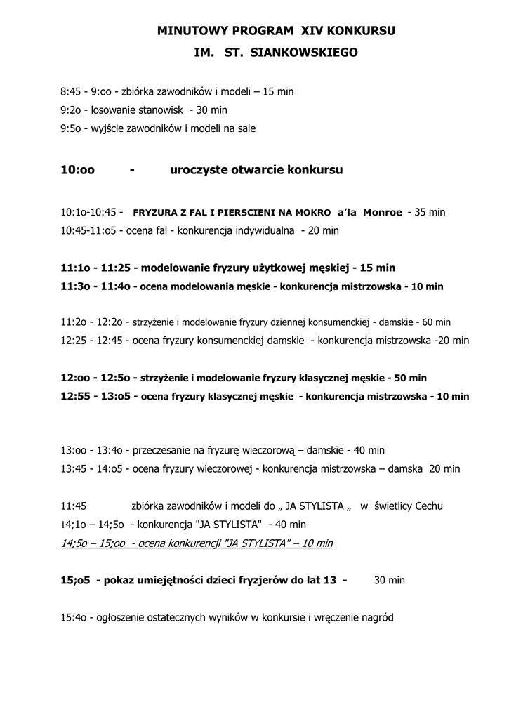 MINUTOWY PROGRAM XIV KONKURSU IM. ST. SIANKOWSKIEGO 8:45 - 9:oo - zbiórka zawodników i modeli – 15 min 9:2o - losowanie stanowisk - 30 min 9:5o - wyjście zawodników i modeli na sale 10:oo - uroczyste otwarcie konkursu 10:1o-10:45 - FRYZURA Z FAL I PIERSCIENI NA MOKRO a’la Monroe - 35 min 10:45-11:o5 - ocena fal - konkurencja indywidualna - 20 min 11:1o - 11:25 - modelowanie fryzury użytkowej męskiej - 15 min 11:3o - 11:4o - ocena modelowania męskie - konkurencja mistrzowska - 10 min 11:2o - 12:2o - strzyżenie i modelowanie fryzury dziennej konsumenckiej - damskie - 60 min 12:25 - 12:45 - ocena fryzury konsumenckiej damskie - konkurencja mistrzowska -20 min 12:oo - 12:5o - strzyżenie i modelowanie fryzury klasycznej męskie - 50 min 12:55 - 13:o5 - ocena fryzury klasycznej męskie - konkurencja mistrzowska - 10 min 13:oo - 13:4o - przeczesanie na fryzurę wieczorową – damskie - 40 min 13:45 - 14:o5 - ocena fryzury wieczorowej - konkurencja mistrzowska – damska 20 min 11:45 zbiórka zawodników i modeli do „ JA STYLISTA „ w świetlicy Cechu 14;1o – 14;5o - konkurencja "JA STYLISTA" - 40 min 14;5o – 15;oo - ocena konkurencji "JA STYLISTA" – 10 min 15;o5 - pokaz umiejętności dzieci fryzjerów do lat 13 - 30 min 15:4o - ogłoszenie ostatecznych wyników w konkursie i wręczenie nagród
