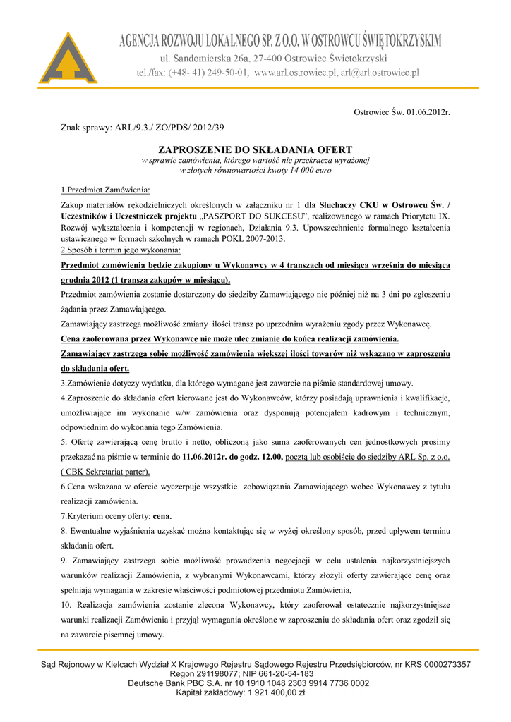 Ostrowiec Św. 01.06.2012r. Znak sprawy: ARL/9.3./ ZO/PDS/ 2012/39 ZAPROSZENIE DO SKŁADANIA OFERT w sprawie zamówienia, którego wartość nie przekracza wyrażonej w złotych równowartości kwoty 14 000 euro 1.Przedmiot Zamówienia: Zakup materiałów rękodzielniczych określonych w załączniku nr 1 dla Słuchaczy CKU w Ostrowcu Św. / Uczestników i Uczestniczek projektu „PASZPORT DO SUKCESU”, realizowanego w ramach Priorytetu IX. Rozwój wykształcenia i kompetencji w regionach, Działania 9.3. Upowszechnienie formalnego kształcenia ustawicznego w formach szkolnych w ramach POKL 2007-2013. 2.Sposób i termin jego wykonania: Przedmiot zamówienia będzie zakupiony u Wykonawcy w 4 transzach od miesiąca września do miesiąca grudnia 2012 (1 transza zakupów w miesiącu). Przedmiot zamówienia zostanie dostarczony do siedziby Zamawiającego nie później niż na 3 dni po zgłoszeniu żądania przez Zamawiającego. Zamawiający zastrzega możliwość zmiany ilości transz po uprzednim wyrażeniu zgody przez Wykonawcę. Cena zaoferowana przez Wykonawcę nie może ulec zmianie do końca realizacji zamówienia. Zamawiający zastrzega sobie możliwość zamówienia większej ilości towarów niż wskazano w zaproszeniu do składania ofert. 3.Zamówienie dotyczy wydatku, dla którego wymagane jest zawarcie na piśmie standardowej umowy. 4.Zaproszenie do składania ofert kierowane jest do Wykonawców, którzy posiadają uprawnienia i kwalifikacje, umożliwiające im wykonanie w/w zamówienia oraz dysponują potencjałem kadrowym i technicznym, odpowiednim do wykonania tego Zamówienia. 5. Ofertę zawierającą cenę brutto i netto, obliczoną jako suma zaoferowanych cen jednostkowych prosimy przekazać na piśmie w terminie do 11.06.2012r. do godz. 12.00, pocztą lub osobiście do siedziby ARL Sp. z o.o. ( CBK Sekretariat parter). 6.Cena wskazana w ofercie wyczerpuje wszystkie zobowiązania Zamawiającego wobec Wykonawcy z tytułu realizacji zamówienia. 7.Kryterium oceny oferty: cena. 8. Ewentualne wyjaśnienia uzyskać można kontaktując się w wyżej określony sposób, przed upływem terminu składania ofert. 9. Zamawiający zastrzega sobie możliwość prowadzenia negocjacji w celu ustalenia najkorzystniejszych warunków realizacji Zamówienia, z wybranymi Wykonawcami, którzy złożyli oferty zawierające cenę oraz spełniają wymagania w zakresie właściwości podmiotowej przedmiotu Zamówienia, 10. Realizacja zamówienia zostanie zlecona Wykonawcy, który zaoferował ostatecznie najkorzystniejsze warunki realizacji Zamówienia i przyjął wymagania określone w zaproszeniu do składania ofert oraz zgodził się na zawarcie pisemnej umowy. 11. Zamawiający zastrzega możliwość udzielenia kolejnego zamówienia do wysokości 50% wartości zamówienia określonego w umowie z Wykonawcą w tym samym roku kalendarzowym, jeżeli zachodzi konieczność udzielenia zamówienia tożsamego z uprzednio udzielonym zamówieniem, a udzielenie zamówienia w ten sposób jest z korzyścią dla Zamawiającego. Prezes Zarządu ARL Sp. z o.o. Magdalena Salwerowicz Załącznik nr 1. Znak sprawy ARL/9.3/ZO/PDS/2012/39 Lp. Przedmiot Preferowany Producent Sznurek woskowy (czerwony ,zielony) 7 m - rolka Drut jubilerski (kolor naturalny ) Szpilki – gwoździe, długość 50 mm Nakładki ozdobne, średnica 8mm ( pakowane 1 woreczek – 20 szt) Bigle otwarte, długość 19mm Koraliki drewniane zielone, średnica 8 mm. Koraliki drewniane żółte, średnica 10 mm. Koraliki drewniane pomarańczowe, średnica 12 mm. Koraliki drewniane czarne, średnica 8 mm. Koraliki drewniane białe, średnica 10 mm. Koraliki drewniane czerwone, średnica 12 mm. Kulki gładkie, średnica 4 mm (1 opakowanie – 180 szt) Zapięcia – karabińczyk, metalowe, kolor srebrny, długość 9 mm Szacunkowa ilość 2 rolki czerwony, 2 rolki zielony 2 szpulki 25 par 2 opakowania 20 par 4 woreczki 5 woreczków 6 woreczków 4 woreczki 5 woreczków 6 woreczków 2 opakowania 18 sztuk Cena netto Cena brutto Wartość brutto Kółka otwarte niklowane, kolor srebrny, średnica 6-8 mm., Kulki zaciskowe, 1 – 1,5 mm. (opakowanie) 2 woreczki Przekładki jubilerskie (opakowanie), rozmiar: 8-10 mm Końcówki do rzemieni i linek o średnicy wnętrza 3,5 mm oraz o średnicy 1,5 mm, 1 opakowanie – 10szt. Łańcuszek posrebrzany, długość 50 mm., wysokość oczka 5 mm, szerokość oczka 3,4 mm. Długie szczypce okrągłe stal niklowana o średnicy oczek. ok. 2 – 5mm Szczypce boczne obcinaki do tworzyw sztucznych z gumowymi rączkami , długość do 16 cm. Szczypce długie uniwersalne z gumowymi rączkami, długość do 16 cm. Krepina (preferowany ADAR kolor czerwony, żółty, zielony, lila, różowy, pomarańczowy) Klej Galaksy, ASTRA opakowanie 40 ml. 2 sztuki 2 opakowania 2 opakowania każdej średnicy 10 sztuk 6 sztuk 4 sztuki 4 sztuki po 1 sztuce z każdego koloru 6 sztuk Nożyczki, długość 13,5 cm. Pędzelek, rozm. 8 GAMBO 8 sztuk ASTRA 8 sztuk Pędzle płaskie, miękkie, sprężyste, nr 12 Pędzle gąbkowe okrągłe, nr 2 Szkatułki kartonowe, 9x12 cm Papier do decoupage preferowane duże motywy Akryl w kolorach: żółty, granat, bordo, pojemność 50 ml. Lakier do spękań dwuskładnikowy, pojemność 100 ml jednego składnika. Pasta do wypełniania spękań – złota, pojemność 20 ml. Pasta do polerowania – woskowa, pojemność 80 ml. Farba w sprayu – kolor złoty, pojemność 200 ml. Farba w sprayu – kolor brązowy (ciemny), pojemność 200 ml. Farba w sprayu – kolor czerwony (ciemny), pojemność 200 ml. Lakier w sprayu, pojemność 300 ml. Klej do decoupage, pojemność 150 ml Drut wiązałkowy Ręcznik papierowy (dowolny rozmiar) ASTRA 10 sztuk Stamperia 10 sztuk Stamperia 20 sztuk Dekomania 4 sztuki Pentart Pentart po 2 sztuki każdego koloru 2 sztuki Pentart 2 sztuki Decomania 2 sztuki Aliga 3 sztuki Aliga 5 sztuk Aliga 4 sztuki Aliga 4 sztuki Pentart 1 sztuka 2 kg. 1 opakowanie Szary papier (wielkość dowol