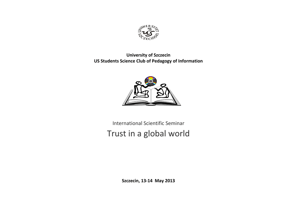 University of Szczecin US Students Science Club of Pedagogy of Information International Scientific Seminar Trust in a global world Szczecin, 13-14 May 2013 Organizators University of Szczecin - Department of Pedagogy US Students Science Club of Pedagogy of Information Scientific Committee Prof. zw. dr hab. Maria Czerepaniak – Walczak - University of Szczecin, Poland Prof. US dr hab. Elżbieta Perzycka - University of Szczecin, Poland Prof. dr Harald Nilsen - Nesna University College, Norwey Prof. dr Piere Giuseppe Rossi, University of Macerata, Italy Prof. dr Tatiana Grebenuk - The Immanuel Kant BalticKant Federal University, Russia Prof.dr G. M. Khawaja (Meem Hai Zaffar) - Institute of Kashmir Studies Society, India Prof. dr Nazir Ahmed Nadeem - Institute of Kashmir Studies Society, India Prof. dr Jarosław Janio, Santa Ana Collegr, USA Prof. Dr Anna Zembala - Katholische Hochschule Nordrhein-Westfalen, Germany The organizing committee mgr Jowita Krajewska, University of Szczecin mgr Anita Karyń, University of Szczecin mgr Radosław Falkiewicz-Szult, University of Szczecin The main goal of seminar is to define: • Trust as an universal value, … • Trust to for education as an education system, contents, management, ... Information on the seminar 1. 2. 3. 4. 5. 6. 7. 8. The Seminar takes place in 13-14 May 2013. At the University of Szczecin, Poland At the Seminar will be the speeches, communications and discussions In problematic session. Detail program of the Seminar will be send in second communication. The attending enrolment should be send in the enclosing enrolment card to 20 April 2013 . Articles for publication (max. 10 pages of text) should be send to 30 May 2013. Registration fee is 300 PLN and includes Seminar papers, coffee, 2 lunches, official dinner and article print in the book,. Registration fee without the article 250 PLN. The fee should be send to 30 April 2013 . on the account: Uniwersytet Szczeciński ING Bank Śląski, number: 46 1050 1559 1000 0022 8790 4474 with a note: subkonto 0157 Title: Seminar 13-14 May 2013 For additional info ask: Jowita Krajewska, Anita karyń e-mail: [email protected]