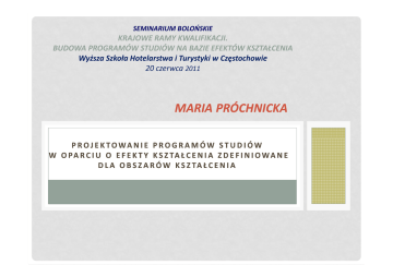 SEMINARIUM BOLOŃSKIE KRAJOWE RAMY KWALIFIKACJI. BUDOWA PROGRAMÓW STUDIÓW NA BAZIE EFEKTÓW KSZTAŁCENIA Wyższa Szkoła Hotelarstwa i Turystyki w Częstochowie 20 czerwca 2011 MARIA PRÓCHNICKA P R O J E K TOWA N I E P R O G R A M ÓW S T U D I ÓW W O P A R C I U O E F E K T Y K S Z TA Ł C E N I A Z D E F I N I O W A N E D L A O B S Z A R Ó W K S Z TA Ł C E N I A PLAN Definicje podstawowych terminów Metodyka tworzenia programu studiów/kształcenia w oparciu o efekty kształcenia Narzędzia wykorzystywane w procesie projektowania programu studiów/kształcenia Metodyka opisu programu studiów/kształcenia Definicje podstawowych terminów PROGRAM STUDIÓW/KSZTAŁCENIA (CURRICULUM CURRICULUM)) USTAWA z dnia 18 marca 2011 r. o zmianie ustawy – Prawo o szkolnictwie wyższym, ustawy o stopniach naukowych i tytule naukowym oraz o stopniach i tytule w zakresie sztuki oraz o zmianie niektórych innych ustaw Podporządkowany wspólnemu celowi i wynikający z ogólnego opisu efektów uczenia się spójny i dobrze ustrukturowany zestaw wzajemnie połączonych ze sobą przedmiotów, ich treści oraz osiąganych efektów uczenia się, oferowany przez uczelnię, prowadzący do uzyskania pełnej kwalifikacji na określonym poziomie, zgodnie z wymaganiami prawnymi i wewnętrznymi regulacjami obowiązującymi w uczelni Program kształcenia – opis określonych przez uczelnię spójnych efektów kształcenia, zgodny z Krajowymi Ramami Kwalifikacji dla Szkolnictwa Wyższego, oraz opis procesu kształcenia, prowadzącego do osiągnięcia tych efektów, wraz z przypisanymi do poszczególnych modułów tego procesu punktami ECTS Moduł/przedmiot Jednostka programu studiów/kształcenia posiadająca wyodrębnione cele i efekty kształcenia, zgodne z celem i efektami programu kształcenia, realizowana w oparciu o specyficzne dla niej metody nauczania i uczenia się oraz oceny i potwierdzania efektów kształcenia Cel programu studiów/kształcenia/modułu/przedmiotu Szeroki, ogólny opis intencji kształcenia; wskazuje na to co nauczyciel zamierza osiągnąć w programie kształcenia/modułu/przedmiotu. Cele są zwykle formułowane z punktu widzenia nauczycieli USTAWA z dnia 18 marca 2011 r. o zmianie ustawy – Prawo o szkolnictwie wyższym, ustawy o stopniach naukowych i tytule naukowym oraz o stopniach i tytule w zakresie sztuki oraz o zmianie niektórych innych ustaw OBSZAR KSZTAŁCENIA - zasób wiedzy i umiejętności z zakresu jednego z obszarów wiedzy określonych w przepisach wydanych na podstawie art. 3 ust. 1 ustawy z dnia 14 marca 2003 r. o stopniach naukowych i tytule naukowym oraz o stopniach i tytule w zakresie sztuki „Minister właściwy do spraw szkolnictwa wyższego, określi w drodze rozporządzenia, po zasięgnięciu opinii Centralnej Komisji do spraw Stopni i Tytułów […] dziedziny nauki i sztuki oraz dyscypliny naukowe i artystyczne, […] oraz obszary wiedzy, z uwzględnieniem obszarów kształcenia określonych w przepisach o szkolnictwie wyższym” (art. 3 ust. 1. ustawy z dnia 14 marca 2003 r. o stopniach naukowych i tytule naukowym oraz o stopniach i tytule w zakresie sztuki ) KIERUNEK STUDIÓW - wyodrębnioną część jednego lub kilku obszarów kształcenia, realizowana w uczelni w sposób określony przez program kształcenia Studia w uczelni są prowadzone w ramach kierunku studiów Art. 8 ust. 1 PROGRAM KSZTAŁCENIA - opis określonych przez uczelnię spójnych efektów kształcenia, zgodny z Krajowymi Ramami Kwalifikacji dla Szkolnictwa Wyższego, oraz opis procesu kształcenia, prowadzącego do osiągnięcia tych efektów, wraz z przypisanymi do poszczególnych modułów tego procesu punktami ECTS Uczelnia ma w szczególności prawo do: ustalania planów studiów i programów kształcenia, uwzględniających efekty kształcenia zgodnie z Krajowymi Ramami Kwalifikacji dla Szkolnictwa Wyższego, zwanymi dalej „Krajowymi Ramami Kwalifikacji”, dla obszarów kształcenia określonych w przepisach wydanych na podstawie art. 9 ust. 1pkt 2 [Art. 6 ust. 1, pkt 4 b)] Kwalifikacje - efekty kształcenia, poświadczone dyplomem, świadectwem, certyfikatem lub innym dokumentem wydanym przez uprawnioną instytucję potwierdzającym uzyskanie zakładanych efektów kształcenia USTAWA z dnia 18 marca 2011 r. o zmianie ustawy – Prawo o szkolnictwie wyższym, ustawy o stopniach naukowych i tytule naukowym oraz o stopniach i tytule w zakresie sztuki oraz o zmianie niektórych innych ustaw NAKŁAD PRACY POZIOM Kwalifikacje pierwszego stopnia (Tytuł zawodowy licencjata, inżyniera lub równorzędny) Kwalifikacje drugiego stopnia (Tytuł zawodowy magistra, magistra inżyniera lub równorzędny) Kwalifikacje trzeciego stopnia (Stopień naukowy doktora) KWALIFIKACJE Kwalifikacje podyplomowe Profil ogólnoakademicki EFEKTY KSZTAŁCENIA PROFIL Profil praktyczny WIEDZA − efekt przyswajania informacji poprzez uczenie się. Wiedza jest zbiorem faktów, zasad, teorii i praktyk powiązanych z dziedziną pracy lub nauki. W kontekście europejskich ram kwalifikacji wiedzę opisuje się jako teoretyczną lub faktograficzną UMIEJĘTNOŚCI − zdolność do stosowania wiedzy i korzystania z know-how w celu wykonywania zadań i rozwiązywania problemów. W kontekście europejskich ram kwalifikacji umiejętności określa się jako kognitywne (obejmujące myślenie logiczne, intuicyjne i kreatywne) oraz praktyczne (obejmujące sprawność i korzystanie z metod, materiałów, narzędzi i instrumentów) EFEKTY UCZENIA SIĘ ZALECENIE PARLAMENTU EUROPEJSKIEGO I RADY z dnia 18 czerwca 2009 r. KOMPETENCJE − udowodniona zdolność stosowania wiedzy, umiejętności i zdolności osobistych, społecznych lub metodologicznych okazywana w pracy lub nauce oraz w karierze zawodowej i osobistej; w europejskich ramach kwalifikacji, kompetencje określane są w kategoriach odpowiedzialności i autonomii EFEKTY UCZENIA SIĘ (LEARNING OUTCOMES) – to, co osoba ucząca się wie, rozumie i potrafi wyko-na
