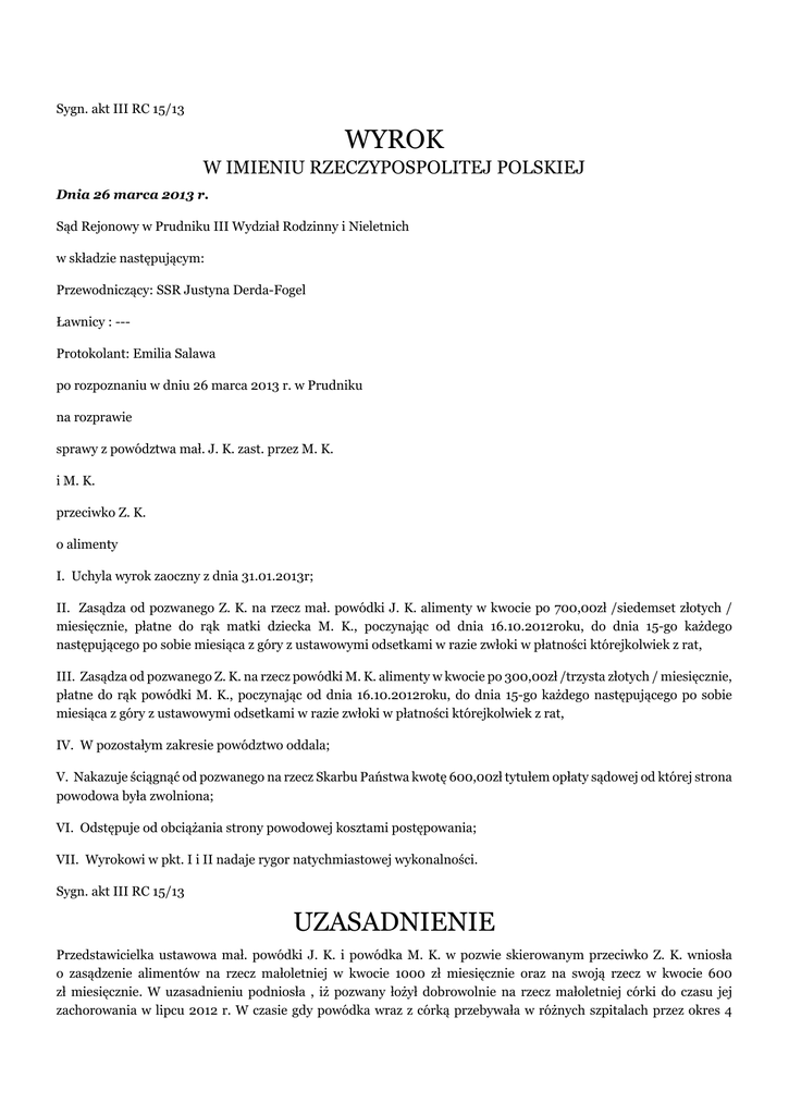 Sygn. akt III RC 15/13 WYROK W IMIENIU RZECZYPOSPOLITEJ POLSKIEJ Dnia 26 marca 2013 r. Sąd Rejonowy w Prudniku III Wydział Rodzinny i Nieletnich w składzie następującym: Przewodniczący: SSR Justyna Derda-Fogel Ławnicy : --Protokolant: Emilia Salawa po rozpoznaniu w dniu 26 marca 2013 r. w Prudniku na rozprawie sprawy z powództwa mał. J. K. zast. przez M. K. i M. K. przeciwko Z. K. o alimenty I. Uchyla wyrok zaoczny z dnia 31.01.2013r; II. Zasądza od pozwanego Z. K. na rzecz mał. powódki J. K. alimenty w kwocie po 700,00zł /siedemset złotych / miesięcznie, płatne do rąk matki dziecka M. K., poczynając od dnia 16.10.2012roku, do dnia 15-go każdego następującego po sobie miesiąca z góry z ustawowymi odsetkami w razie zwłoki w płatności którejkolwiek z rat, III. Zasądza od pozwanego Z. K. na rzecz powódki M. K. alimenty w kwocie po 300,00zł /trzysta złotych / miesięcznie, płatne do rąk powódki M. K., poczynając od dnia 16.10.2012roku, do dnia 15-go każdego następującego po sobie miesiąca z góry z ustawowymi odsetkami w razie zwłoki w płatności którejkolwiek z rat, IV. W pozostałym zakresie powództwo oddala; V. Nakazuje ściągnąć od pozwanego na rzecz Skarbu Państwa kwotę 600,00zł tytułem opłaty sądowej od której strona powodowa była zwolniona; VI. Odstępuje od obciążania strony powodowej kosztami postępowania; VII. Wyrokowi w pkt. I i II nadaje rygor natychmiastowej wykonalności. Sygn. akt III RC 15/13 UZASADNIENIE Przedstawicielka ustawowa mał. powódki J. K. i powódka M. K. w pozwie skierowanym przeciwko Z. K. wniosła o zasądzenie alimentów na rzecz małoletniej w kwocie 1000 zł miesięcznie oraz na swoją rzecz w kwocie 600 zł miesięcznie. W uzasadnieniu podniosła , iż pozwany łożył dobrowolnie na rzecz małoletniej córki do czasu jej zachorowania w lipcu 2012 r. W czasie gdy powódka wraz z córką przebywała w różnych szpitalach przez okres 4 miesięcy pozwany nie interesował się córką i nie łożył na jej utrzymanie . Powódka niejednokrotnie zmuszona była korzystać z pomocy finansowej rodziny i przyjaciół. Potrzeby małoletniej córki są wysokie. Wymaga ona stałej kontroli specjalistycznej lekarskiej. Zaopatrywana jest w odzież , pampersy, żywność. Na dojazd i pobyt z córką w Centrum (...) w W. powódka potrzebuje kwotę 600 zł miesięcznie. Łączne miesięczne koszty utrzymania wynoszą ok. 1600 zł miesięcznie. Odnośnie swojej sytuacji powódka podniosła, iż nie pracuje i nie posiada żadnych dochodów. Pozostaje na wyłącznym utrzymaniu brata. Jedynie z (...) w G. pobiera zasiłek pielęgnacyjny z tytułu niepełnosprawności dziecka w kwocie 153 zł miesięcznie. Pozwany Z. K. w sprzeciwie od wyroku zaocznego wniósł o zasądzenie na rzecz małoletniej córki alimentów w kwocie po 300 zł miesięcznie i oddalenie powództwa w pozostałym zakresie. Podniósł, iż obecna sytuacja finansowa i majątkowa nie pozwala mu płacić wyższych alimentów niż w kwocie zaproponowanej. Nadto uważa, że koszt utrzymania i wychowania półtorarocznego dziecka kształtuje się w granicach 600-700 zł miesięcznie. Pozwany jest właścicielem gospodarstwa rolnego o pow.7,1414 ha wraz z zabudowaniami. Z pracy w gospodarstwie rolnym osiąga dochód ok. 1000 zł miesięcznie. Uprawia pszenicę, jęczmień i buraki. Posiada 15 sztuk tuczników i jedną jałówkę. Mieszka z matką emerytką. Koszt eksploatacji mieszkania wynosi 492 zł. Do tego dochodzi koszt utrzymania pozwanego jak zakup odzieży, wyżywienia, środków higieny, korzystania z telewizji, telefonu. Pozwany ponosi też koszty obowiązkowego ubezpieczenia rolników w kwocie 275 zł rocznie. Pozwany nie posiada kompletu maszyn rolniczych. W razie potrzeby pożycza sprzęt rolniczy od sąsiada, który prowadzi gospodarstwo rolne o pow. 50 ha, a następnie odpracowuje ten sprzęt na gospodarstwie sąsiada. Sąd ustalił następujący stan faktyczny: Małoletnia powódka ma 19 miesięcy i od ukończenia pierwszego roku życia choruje na przewlekłą biegunkę. Przebywała w szpitalach w P., K., Z. i W. przez okres 4 miesięcy. Jest na diecie bezmlecznej. Może spożywać owoce i warzywa, mięso królika i cielęcinę z domowego chowu. Żywność małoletniej kosztuje 400-500 zł miesięcznie. Musi zażywać leki sterydowe, syropy ,wapno . Koszt leków wynosi 200 zł miesięcznie. Pampersy i środki higieny małoletniej kosztują 600 zł miesięcznie. Małoletnia zaopatrywana jest w odzież używaną. Jeden wyjazd do W. kosztuje ok. 600 zł. Z uwagi na konieczność stałej opieki nad małoletnią powódka M. K. nie może podjąć pracy. Musi ważyć wszystko co je i wypije córka. Mieszka wraz z córką u brata H. N., który daje jej miesięcznie kwotę 1000 zł i organizuje przejazdy samochodem. Utrzymuje też powódkę. Powódka nie ma majątku. Musi zaopatrzyć się w żywność, środki higieny, odzież oraz opłacić składkę w KRUS w kwocie 33 zł kwartalnie. Gdy była w szpitalu w W. pożyczyła u matki innego dziecka kwotę 500 zł. Pożyczyła też u pani N. z O. kwotę 500 zł. Pobiera zasiłek pielęgnacyjny na chorą córkę w kwocie 153 zł miesięcznie. Pozwany nie interesuje się córką, nie dzwoni do jej matki. W przejeździe z W. pomogła powódce pani D., a z innych miast brat H. N.. W domu pozwanego nie było warunków aby pozostało tam chore dziecko. W mieszkaniu było zimno i brudno. Pozwany był nietrzeźwy.(dowód: - zeznania powódki k. 75 - zeznania świadka J. D. i H.N. k. 74 -karty informacyjne leczenia szpitalnego k.6-35 -decyzja (...) k.35 Pozwany prowadzi gospodarstwo rolne o pow. 7 hektarów. Uprawia jęczmień i pszenicę ozimą. Posiada ciągnik i przyczepy, pług, bronę , sadzarkę , siewnik. Hoduje świnie , posiada 20-30 tuczników. W 2012 r. wpływy na rachunek bieżący rolników indywidualnych pozwanego wyniosły 15 530,84 zł . Pozwany dorabia u sąsiada i dostaje 9 zł na godzinę. Otrzyma