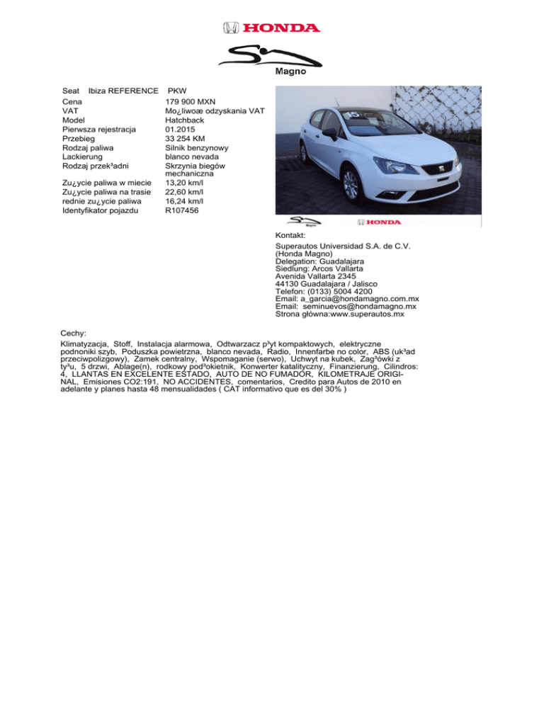 Seat Ibiza REFERENCE Cena VAT Model Pierwsza rejestracja Przebieg Rodzaj paliwa Lackierung Rodzaj przek³adni Zu¿ycie paliwa w miecie Zu¿ycie paliwa na trasie rednie zu¿ycie paliwa Identyfikator pojazdu PKW 179 900 MXN Mo¿liwoæ odzyskania VAT Hatchback 01.2015 33 254 KM Silnik benzynowy blanco nevada Skrzynia biegów mechaniczna 13,20 km/l 22,60 km/l 16,24 km/l R107456 Kontakt: Superautos Universidad S.A. de C.V. (Honda Magno) Delegation: Guadalajara Siedlung: Arcos Vallarta Avenida Vallarta 2345 44130 Guadalajara / Jalisco Telefon: (0133) 5004 4200 Email: [email protected] Email: [email protected] Strona główna:www.superautos.mx Cechy: Klimatyzacja, Stoff, Instalacja alarmowa, Odtwarzacz p³yt kompaktowych, elektryczne podnoniki szyb, Poduszka powietrzna, blanco nevada, Radio, Innenfarbe no color, ABS (uk³ad przeciwpolizgowy), Zamek centralny, Wspomaganie (serwo), Uchwyt na kubek, Zag³ówki z ty³u, 5 drzwi, Ablage(n), rodkowy pod³okietnik, Konwerter katalityczny, Finanzierung, Cilindros: 4, LLANTAS EN EXCELENTE ESTADO, AUTO DE NO FUMADOR, KILOMETRAJE ORIGINAL, Emisiones CO2:191, NO ACCIDENTES, comentarios, Credito para Autos de 2010 en adelante y planes hasta 48 mensualidades ( CAT informativo que es del 30% )