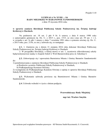 Projekt 5.10 UCHWAŁA Nr XVIII/…/16 RADY MIEJSKIEJ W BARANOWIE SANDOMIERSKIM z dnia 19 stycznia 2016 roku w sprawie zamiaru likwidacji Publicznej Szkoły Podstawowej im. Świętej Jadwigi Królowej w Durdach. Na podstawie art. 18 ust. 2 pkt 9 lit. h ustawy z dnia 8 marca 1990 roku o samorządzie gminnym (tj. Dz. U. z 2015 r., poz. 1515, ze zm.) oraz art. 59 ust. 1 i 2, w związku z art. 5c pkt 1 ustawy z dnia 7 września 1991 roku o systemie oświaty (tj. Dz. U. z 2015 roku, poz. 2156, ze zm.), uchwala się, co następuje: § 1. 1. Zamierza się z dniem 31 sierpnia 2016 roku dokonać likwidacji Publicznej Szkoły Podstawowej im. Świętej Jadwigi Królowej w Durdach. 2. W przypadku likwidacji, o której mowa w ust. 1, uczniowie zlikwidowanej szkoły będą kontynuować naukę w Zespole Szkół w Woli Baranowskiej przy ul. Szkolnej 4. § 2. Zobowiązuje się i upoważnia Burmistrza Miasta i Gminy Baranów Sandomierski do: 1) poinformowania o zamiarze likwidacji Publicznej Szkoły Podstawowej w Durdach: a) Rodziców uczniów Publicznej Szkoły Podstawowej w Durdach, b) Podkarpackiego Kuratora Oświaty; 2) wystąpienia do Podkarpackiego Kuratora Oświaty o opinię w sprawie likwidacji Publicznej Szkoły Podstawowej w Durdach. § 3. Wykonanie uchwały powierza się Burmistrzowi Miasta i Gminy Baranów Sandomierski. § 4. Uchwała wchodzi w życie z dniem podjęcia. Przewodniczący Rady Miejskiej mgr inż. Wacław Smykla Sprawdzono pod względem formalno-prawnym – KP Bożena Sudoł-Kaczmarek, G. Ciszewski. Uzasadnienie Zgodnie z art. 59 ust. 1 i 2 ustawy z dnia 7 września 1991 roku o systemie oświaty (tj. Dz. U. z 2015 r. poz. 2156, ze zm.) szkoła publiczna może być zlikwidowana przez organ prowadzący z końcem roku szkolnego, po zapewnieniu przez ten organ, uczniom możliwości kontynuowania nauki w innej szkole publicznej tego samego typu. Szkoła publiczna prowadzona przez jednostkę samorządu terytorialnego może zostać zlikwidowana po zasięgnięciu opinii organu sprawującego nadzór pedagogiczny. Zasadniczym powodem podjęcia uchwały o zamiarze likwidacji Publicznej Szkoły Podstawowej im. Świętej Jadwigi Królowej w Durdach, jest niekorzystna sytuacja demograficzna polegająca na spadku wskaźnika urodzeń oraz procesy migracyjne, których bezpośrednim skutkiem jest mała ilość dzieci uczęszczających do przedmiotowej Szkoły. Wskazana sytuacja ma swoje dalsze negatywne konsekwencje w postaci niemożności zapewnienia uczniom Szkoły optymalnych warunków nauczania, związanych m.in. z koniecznością prowadzenia zajęć edukacyjnych w małych, kilkuosobowych grupach klasowych, będących wielokrotnie klasami łączonymi, co znacząco redukuje możliwości indywidualnej pracy nauczyciela z uczniem, która to kwestia uchodzi za główny atut tzw. małych szkół. Czynnikiem uzasadniającym podjęcie decyzji w sprawie likwidacji Szkoły, są również wysokie koszty jej utrzymania w stosunku do liczby uczęszczających do niej dzieci. Znaczący wysiłek finansowy budżetu Państwa i budżetu Gminy, skierowany na funkcjonowanie przedmiotowej Szkoły nie znajduje widocznego odzwierciedlenia w lepszych wynikach edukacyjnych i wychowawczy jej uczniów w porównaniu do wychowanków innych szkół z terenu Gminy, gdzie nakład finansowy na kształcenie jednego ucznia jest znacząco niższy. Wskazana sytuacja czyni zasadnym pytanie o celowość i gospodarność dysponowania środkami publicznymi w tym zakresie. Wyniki badań, prowadzonych wśród uczniów klas I-III dowodzą, że stosunkowo najlepsze warunki rozwojowe stwarzają średnio liczne grupy klasowe, liczące w badaniach od 14 do 27 uczniów. W grupie tej najwięcej rodzajów potrzeb społecznych jest zaspokojonych na optymalnym i umiarkowanym poziomie, a najmniej na poziomie niskim. W ogóle nie występuje słabe lub umiarkowane niezaspokojenie potrzeb. Podstawową wadą klas mało licznych – do 13 uczniów - jest zbyt mała liczba kolegów i koleżanek. Potrzeby przynależności do grupy w najmniej licznych klasach nie są zaspokojone na optymalnym poziomie, tak jak większość innych potrzeb społecznych uczniów. Wyniki badań ukazują potrzebę kontaktów z rówieśnikami jako najważniejszą w hierarchii subiektywnych potrzeb społecznych uczniów klas I-III, potwierdzając tym samym wcześniejsze ustalenia badawcze na temat znaczenia dążności do grupowania się w tym wieku szkolnym. Potrzeba przynależności do grupy około 9-10 roku życia osiąga bowiem swoje maksimum na przestrzeni całego życia ludzkiego. W małej klasie następuje zatracenie poziomu rywalizacji, satysfakcji i prawidłowych relacji między uczniami. Bardziej liczebne klasy pozwalają natomiast, na nawiązanie przyjaźni, naukę funkcjonowania i pracy w grupie. (źródło:http://www.eid.edu.pl/archiwum/2007,57/styczen,87/zalety_i_wady_malo_licznych_kl as,251.html). W Raporcie o Kapitale Intelektualnym Polski z 10 lipca 2008 r. przywoływano wyniki polskich i międzynarodowych badań dotyczących wpływu liczebności klas na poprawę wyników nauczania. Badania te nie wykazują, aby wyniki uczniów były tym lepsze, im klasa jest mniejsza. Ze 112 projektów badawczych przeprowadzonych na całym świecie, 103 nie wykazały istotnej pozytywnej korelacji między ograniczeniem wielkości klasy a wynikami uczniów, lub też wykazały korelację ujemną. Obecnie Szkoła Podstawowa w Durdach posiada 6-cio oddziałową strukturę organizacyjną oraz jeden oddział przedszkolny. Liczbę uczniów w poszczególnych rocznikach, wraz z uwzględnieniem sposobu łączenia klas, według stanu na dzień 30 września 2015 roku (dane SIO stan 30.09.2015), przedstawia tabela nr 1. Tabela nr 1 w tym: Wyszczególnienie Liczba oddziałów (w wyniku łączenia klas) Liczba uczniów oddział przedszkolny poniżej „0” 1 Szkoła Podstawowa w Durdach 4 44 I II III IV V VI „0” 4+9 7+0+4 6+7 7 Z powyższej tabeli wynika, że żaden odział klasowy funkcjo