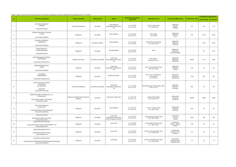 Tabela 1. Wykaz oczyszczalni ścieków przemysłowych i komunalnych w eksploatacji na obszarze województwa mazowieckiego (stan na 31.03.2008r) Projektowana przepustowość Lp. 1 Jednostka organizacyjna Dom Pomocy Społecznej w Niedabylu Rodzaj oczyszczalni Rodzaj ścieków Metoda Współrzędne geograficzne oczyszczalni odbiornik/km zrzutu Powiat/Gmina/Miejscowosc Projektowane RLM mechaniczno-biologiczna komunalne złoże biologiczne wspomaganie oczyszczania: PIX sz.: 51° 39' 49'' dł.: 21° 04' 52'' rów mel. / Dyga / Pilica b.d. / 8,65 / 33,40 białobrzeski Stromiec Niedabyl biologiczna komunalne złoże biologiczne sz.: 51° 39' 35'' dł.: 20° 59' 10'' Pilica / Wisła b.d. / 457,00 biologiczna komunalne, opadowe złoże biologiczne sz.: 51° 36' 02'' dł.: 20° 55' 48'' Pierzchnianka / Pilica / Wisła b.d. / 45,80 / 457,00 biologiczna komunalne pole rozsączające sz.: 51° 37' 06'' dł.: 20° 57' 20'' ziemia biologiczno-chemiczna komunalne, przemysłowe osad czynny wspomaganie oczyszczania: PIX sz.: 51° 39' 01'' dł.: 20° 57' 49'' biologiczna komunalne osad czynny wspomaganie oczyszczania: PIX biologiczna komunalne mechaniczno-biologiczna komunalne, przemysłowe biologiczna z podwyższonym usuwaniem biogenów komunalne biologiczna komunalne biologiczna komunalne biologiczna komunalne biologiczna komunalne biologiczna komunalne oczyszczalnia lokalna 2 Ośrodek Wypoczynkowy "Olszynka" w Turnie średnia dobowa maksymalna 65 10,2 11,2 białobrzeski Białobrzegi Turno 200 76,04 83,64 białobrzeski Białobrzegi Stawiszyn 1 22,5 51,64 białobrzeski Białobrzegi Sucha Szlachecka 1 6,2 8,24 Pilica / Wisła / 45,30 / 457,00 / b.d. białobrzeski Białobrzegi Białobrzegi 58400 ''b. d.'' 4000 sz.: 51° 37' 12'' dł.: 20° 57' 00'' rów mel. / Pierzchnianka / Pilica 0,80 / 2,30 / 45,80 białobrzeski Białobrzegi Sucha 120 19 20 sz.: 51° 37' 45'' dł.: 20° 48' 40'' rów mel. D11 / Korzeniówka / Pierzchnianka b.d. / 7,95 / b.d. białobrzeski Wyśmierzyce Wyśmierzyce 1333 200 240 sz.: 51° 33' 26' dł.: 20° 51' 50'' Rów Zachazowski / Pierzchnianka / Pilica 0,80 / b.d. / b.d. białobrzeski Radzanów Smardzew 900 110 140 osad czynny, system UCT sz.: 52° 51' 32'' dł.: 20° 37' 10'' Łydynia / Wkra / Narew 21,10 / 48,40 / 6,10 ciechanowski Ciechanów Ciechanów 60000 12000 15000 złoże biologiczne sz.: 52° 51' 19'' dł.: 20° 39' 15'' rów mel. / Łydynia / Wkra b.d. / 20,50 / 48,40 ciechanowski Ciechanów Ciechanów 554 76 95 sz.: 53° 02' 57'' dł.: 20° 37' 18'' Gruduszczanka / Łydynia / Wkra 4,20 / 56,50 / 48,40 ciechanowski Grudusk Grudusk 2500 300 390 osad czynny sz.: 52° 48' 30'' dł.: 20° 52' 05'' rów mel. RSW-16 / Sona / Wkra b.d. / 28,00 / 25,20 ciechanowski Gołymin - Ośrodek Gołymin 146 25 25 osad czynny sz.: 52° 52' 05'' dł.: 20° 42' 05'' rów mel. / Sona Zachodnia / Sona b.d. / 13,50 / 34,20 ciechanowski Opinogóra Górna Pomorze 117 19 19 osad czynny sz.: 52° 54' 30'' dł.: 20° 43' 10'' rów mel. / Sona Zachodnia / Sona b.d. / 12,90 / 34,20 ciechanowski Opinogóra Górna Opinogóra Górna 75 15 15 oczyszczalnia zakładowa 3 Schronisko dla Nieletnich w Stawiszynie oczyszczalnia zakładowa 4 Szkoła Podstawowa w Suchej Szlacheckiej oczyszczalnia szkolna 5 Zakład Wodociągów i Kanalizacji w Białobrzegach oczyszczalnia miejsko-gminna 6 Spółdzielnia Mieszkaniowa "BLOKI" oczyszczalnia osiedlowa 7 Urząd Miejski w Wyśmierzycach glebowo-korzeniowe oczyszczalnia miejsko-gminna 8 gminna oczyszczalnia ścieków w Smardzewie (gm. Radzanów) BIOCLERE oczyszczalnia komunalna Zakład Wodociągów i Kanalizacji Sp. z o.o. w Ciechanowie 9 Oczyszczalnia ścieków w Ciechanowie oczyszczalnia miejska Dom Pomocy Społecznej w Ciechanowie 10 osad czynny wspomaganie oczyszczania: PIX oczyszczalnia Domu Pomocy Społecznej oczyszczalnia zakładowa Urząd Gminy Grudusk 11 Oczyszczalnia ścieków w Grudusku oczyszczalnia gminna osad czynny wspomaganie oczyszczania: chemiczne strącanie wapnem Urząd Gminy Gołymin-Ośrodek 12 Oczyszczalnia Szkoły Podstawowej BIOCLERE B - 150 oczyszczalnia gminna Urząd Gminy Opinogóra Górna 13 oczyszczalnia ścieków w Pomorzu oczyszczalnia gminna Urząd Gminy Opinogóra Górna 14 oczyszczalnia typu BIOCLERE dla Szkoły Podstawowej i Gimnazjum oczyszczalnia zakładowa 15 Zespół Szkół im. A Świętochowskiego w Gołotczyźnie ''b. d.'' sz.: 52° 47' 35'' dł.: 20° 41' 40'' rów mel. / Sona / Wkra b.d. / 27,40 / 25,20 ciechanowski Sońsk Gołotczyzna 250 67 67 osad czynny sz.: 52° 48' 15'' dł.: 20° 42' 00'' rów mel. / Sona / Wkra b.d. / 27,10 / 25,20 ciechanowski Sońsk Gołotczyzna 400 75 106 sz.: 52° 57' 40'' dł.: 20° 30' 50'' rów mel. / Łydynia / Wkra b.d. / 45,00 / 48,40 ciechanowski Regimin Klice 130 25 25 sz.: 52° 48' 10'' dł.: 20° 17' 10'' Wkra 82,60 ciechanowski Glinojeck Glinojeck 10083 1100 1400 osad czynny wspomaganie oczyszczania: biopreparaty sz.: 52° 50' 30'' dł.: 20° 18' 10'' Wkra 85,13 ciechanowski Glinojeck Szyjki ''b. d.'' 10000 10000 komunalne osad czynny wspomaganie oczyszczania: PIX sz.: 52° 44' 36'' dł.: 20° 42' 45'' rów mel. / Sona / Wkra 4,00 / 23,60 / 25,20 ciechanowski Sońsk Komory Dąbrowne 7558 650 720 biologiczna komunalne osad czynny wspomaganie oczyszczania: PIX sz.: 52° 54' 10'' dł.: 20° 43' 20'' rów mel. / Sona Zachodnia / Sona 4,50 / 12,90 / 34,20 ciechanowski Opinogóra Górna Opinogóra Górna 669 100 127,2 biologiczna komunalne osad czynny sz.: 52° 50' 19'' dł.: 20° 29' 47'' ziemia ciechanowski Ciechanów Gumowo 300 12,75 14,18 biologiczna komunalne osad czynny sz.: 52° 52' 00'' dł.: 20° 25' 00'' ziemia ciechanowski Ciechanów Chotum 211 5,4 6,2 biologiczna komunalne osad czynny sz.: 52° 53' 22'' dł.: 20° 27' 50'' grunt na terenie szkoły b.d. ciechanowski Ciechanów Chotum 211 5,4 6,2 biologiczna komunalne osad czynny wspomaganie oczyszczania: brak wspomagania sz.: 52° 56' 11'' dł.: 20° 34' 39'' ziemia ciechanowski Regimin Targonie 4 0,64 0,7 biologiczna z podwyższonym u