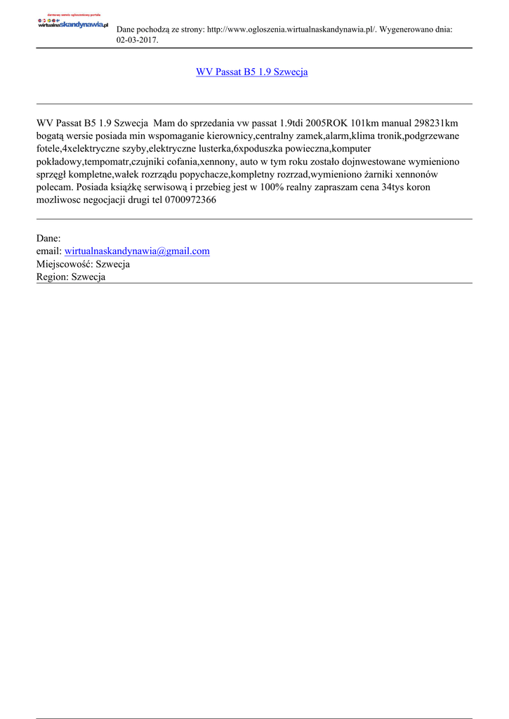 Dane pochodzą ze strony: http://www.ogloszenia.wirtualnaskandynawia.pl/. Wygenerowano dnia: 02-03-2017. WV Passat B5 1.9 Szwecja WV Passat B5 1.9 Szwecja Mam do sprzedania vw passat 1.9tdi 2005ROK 101km manual 298231km bogatą wersie posiada min wspomaganie kierownicy,centralny zamek,alarm,klima tronik,podgrzewane fotele,4xelektryczne szyby,elektryczne lusterka,6xpoduszka powieczna,komputer pokładowy,tempomatr,czujniki cofania,xennony, auto w tym roku zostało dojnwestowane wymieniono sprzęgł kompletne,wałek rozrządu popychacze,kompletny rozrzad,wymieniono żarniki xennonów polecam. Posiada książkę serwisową i przebieg jest w 100% realny zapraszam cena 34tys koron mozliwosc negocjacji drugi tel 0700972366 Dane: email: [email protected] Miejscowość: Szwecja Region: Szwecja