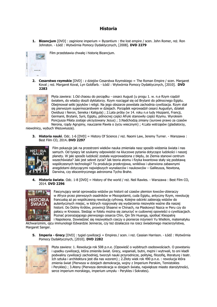 Historia 1. Bizancjum [DVD] : zaginione imperium = Byzantium : the lost empire / scen. John Romer, reż. Ron Johnston. - Łódź : Wytwórnia Pomocy Dydaktycznych, [2008]. DVD 2279 Film przedstawia chwałę i historię Bizancjum. 2. Cesarstwo rzymskie [DVD] : z dziejów Cesarstwa Rzymskiego = The Roman Empire / scen. Margaret Koval ; reż. Margaret Koval, Lyn Goldfarb. - Łódź : Wytwórnia Pomocy Dydaktycznych, [2010]. DVD 2283 Płyta zawiera: 1.Od chaosu do porządku - cesarz August (u progu 1. w. n.e Rzym rządził światem, do władzy doszli dyktatorzy. Rzym rozciągał się od Brytanii do północnego Egiptu. Obejmował setki języków i religii. Na jego obszarze powstała zachodnia cywilizacja. Rzym stał się pierwszym supermocarstwem w dziejach. Porządek wprowadził cesarz Augustyn, działali Owidiusz i Neron, Seneka i Kaligula) ; 2.Lata próby (w 14. roku n.e ludy Hiszpanii, Francji, Germanii, Brytanii, Syrii, Egiptu, pólnocnej części Afryki stanowiły części Rzymu. Wyrokiem Poncjusza Piłata zostaje ukrzyżowany Jezus) ; 3.Nadchodzą zmiany (surowe prawo za czasów Nerona, rządy Agrypiny, nauczanie Pawła o życiu wiecznym) ; 4.Lata wstrząsów (gladiatorzy, niewolnicy, wybuch Wezuwiusza). 3. Historia nauki. Odc. 1-6 [DVD] = History Of Science / reż. Naomi Law, Jeremy Turner. - Warszawa : Best Film CO, 2014. DVD 2297 Film pokazuje jak na przestrzeni wieków nauka zmieniała nasz sposób widzenia świata i nas samych. Od tysięcy lat szukamy odpowiedzi na kluczowe pytania dotyczące ludzkości i naszej planety. W jaki sposób ludzkość została wyprowadzona z błędu, że Ziemia stanowi centrum wszechświata? Jaki jest sekret życia? Jak teoria atomu i fizyka kwantowa stały się podstawą współczesnych technologii? To produkcja przekrojowa, wnikliwa i ubarwiona zabawnymi anegdotami dotyczącymi największych wynalazców i naukowców – Galileusza, Newtona, Darwina, czy ekscentrycznego astronoma Tycho Brahe. 4. Historia świata. Odc. 1-8 [DVD] = History of the world / reż. Neil Rawles. - Warszawa : Best Film CO, 2014. DVD 2296 Fascynujący serial oprowadza widzów po historii od czasów plemion łowców-zbieraczy w Afryce przez pierwszych osadników w Mezopotamii, cuda Egiptu, antyczny Rzym, rewolucję francuską aż po współczesną rewolucję cyfrową. Kolejne odcinki zabierają widzów do autentycznych miejsc, w których rozgrywały się wydarzenia niezwykle ważne dla naszej historii. Do Doliny Królów, prowincji Shaanxi w Chinach, na Płaskowyż Nazca w Peru czy do pałacu w Knossos. Siedząc w fotelu można się zanurzyć w cudownej opowieści o cywilizacjach. Poznać przerażającego pierwszego cesarza Chin, Qin Shi Huanga, spotkać Kleopatrę i Napoleona. Dowiedzieć się niezwykłych rzeczy o pionierze inżynierii Yu Wielkim, matematyku Alchwarizmim, ojcu immunologii Edwardzie Jennerze, czy też działaczce na rzecz świadomego macierzyństwa, Margaret Sanger. 5. Imperia - Grecy [DVD] : tygiel cywilizacji = Empires / scen. i reż. Cassian Harrison. - Łódź : Wytwórnia Pomocy Dydaktycznych, [2010]. DVD 2282 Płyta zawiera: 1. Rewolucja rok 508 p.n.e. (Opowieść o wybitnych osobowościach. O powstaniu i upadku cywilizacji, która zmieniła świat. Grecy, wspaniali, butni, mężni i wytrwali, to oni kładli podwaliny cywilizacji zachodniej, tworzyli nauki przyrodnicze, politykę, filozofię, literaturę i teatr. Ich sztuka i architektura jest dla nas wzorem) ; 2.Złoty wiek rok 490 p.n.e. : rewolucja która zmienia świat (Pierwsza w dziejach demokracja, wojny z Imperium Perskim, Temistokles i Perykles) ; 3.Ateny (Pierwsza demokracja w dziejach świata, największe miasto starożytności, serce imperium morskiego, imperium umysłu - Perykles i Sokrates). 6. Kwatera "Ł" [DVD] / reż. Arkadiusz Gołębiewski. - Warszawa : Instytut Pamięci Narodowej, 2014. DVD 2251 Film opowiada o pracach ekshumacyjnych prowadzonych na tzw. "Łączce", na Cmentarzu Powązkowskim. Władze komunistyczne ukrywały tam zwłoki zamordowanych przez UB żołnierzy podziemia niepodległościowego. 7. Legenda Grunwaldu [DVD] / scen. Paweł Żmudzki ; reż. Mirosław Gronowski. Polskie Termopile /scen. i reż. Leszek Wiśniewski. Uwikłany w historię : rzecz o Józefie Ignacym Kraszewskim / scen. i real. Adam Kulik. - Warszawa: Edupress, 2012. DVD 2253 Legenda Grunwaldu - w filmie dokumentalnym, w którym obok profesorów Henryka Samsonowicza i Romana Trąby, wystąpią naukowcy z Litwy, Białorusi i Niemiec, spróbowano pokazać, jak przez wieki historycy i politycy wykorzystywali legendę Grunwaldu dla swoich partykularnych celów. Polskie Termopile - historia bitwy pod Wizną. Uwikłany w historię – dokumentalny film o Józefie Ignacym Kraszewski. 8. Narodziny człowieka [DVD] = The Rise of Man / reż. Michael Barbeau. - Łódź : Wytwórnia Pomocy Dydaktycznych, [2008]. DVD 2278 Film składa się z dwóch części i przedstawia 8000 lat historii człowieka. 9. Planeta Egipt [DVD] = Planet Egypt / reż. Stephan Koester, Daniel Gerlach. - Łódź : Wytwórnia Pomocy Dydaktycznych, [2014]. DVD 2281 Egipt, to fascynujaca, tętniąca życiem cywilizacja, przetrwała 3000 lat wojen i pokojów. Egipcjanie wybudowali wielkie miasta i imponujące pomniki. Stworzyli podstawy współczesnej matematyki i techniki. Niesamowite dziedzictwo przetrwało do dziś. Płyta zawiera: 1.Narodziny imperium ; 2.Wojny faraonów ; 3.Świątynie władzy (48 min) ; 4.Pragnienie nieśmiertelności . 10. Powstanie Warszawskie [DVD] / autor pomysłu Jan Komasa ; scen. Joanna Pawluśkiewicz, Jan Ołdakowski, Piotr C. Śliwowski. - Warszawa: Muzeum Powstania Warszawskiego, Agora, 2014. DVD 2334 To pierwszy na świecie dramat wojenny non-fiction - film fabularny zmontowany w całości z materiałów dokumentalnych, opowiadający o tytułowym wydarzeniu poprzez historię dwóch młodych reporterów, świadków powstańczych walk. Film wykorzystuje autentyczne kroniki filmowe z sierpnia 1944 roku. Posiłkuj