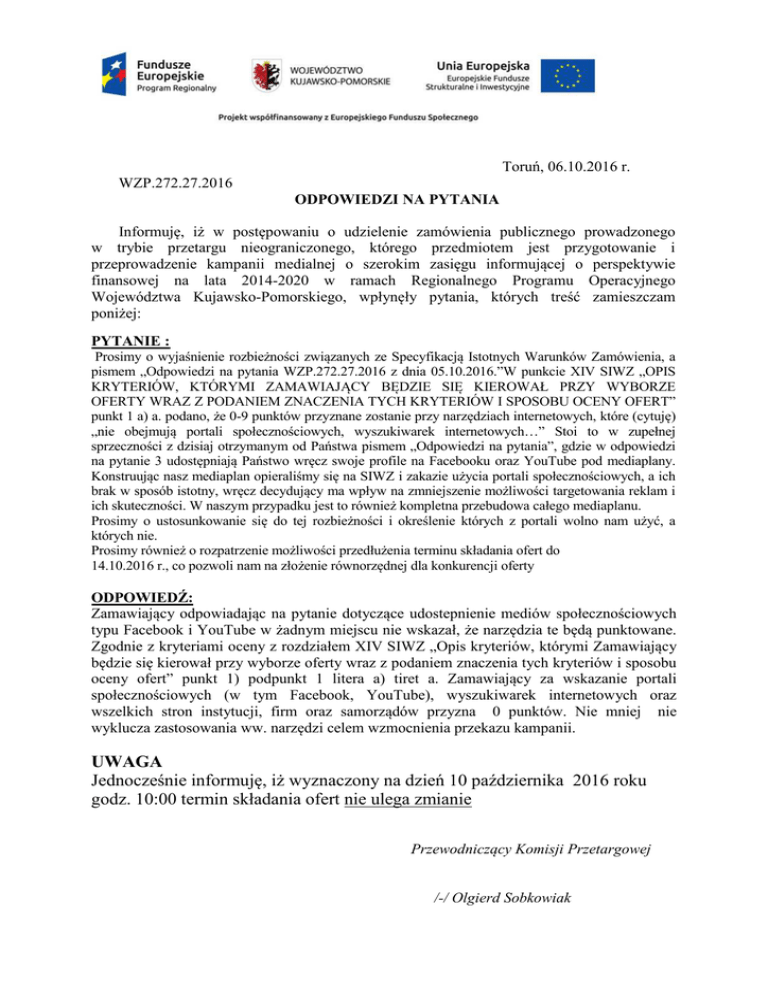 Toruń, 06.10.2016 r. WZP.272.27.2016 ODPOWIEDZI NA PYTANIA Informuję, iż w postępowaniu o udzielenie zamówienia publicznego prowadzonego w trybie przetargu nieograniczonego, którego przedmiotem jest przygotowanie i przeprowadzenie kampanii medialnej o szerokim zasięgu informującej o perspektywie finansowej na lata 2014-2020 w ramach Regionalnego Programu Operacyjnego Województwa Kujawsko-Pomorskiego, wpłynęły pytania, których treść zamieszczam poniżej: PYTANIE : Prosimy o wyjaśnienie rozbieżności związanych ze Specyfikacją Istotnych Warunków Zamówienia, a pismem „Odpowiedzi na pytania WZP.272.27.2016 z dnia 05.10.2016.”W punkcie XIV SIWZ „OPIS KRYTERIÓW, KTÓRYMI ZAMAWIAJĄCY BĘDZIE SIĘ KIEROWAŁ PRZY WYBORZE OFERTY WRAZ Z PODANIEM ZNACZENIA TYCH KRYTERIÓW I SPOSOBU OCENY OFERT” punkt 1 a) a. podano, że 0-9 punktów przyznane zostanie przy narzędziach internetowych, które (cytuję) „nie obejmują portali społecznościowych, wyszukiwarek internetowych…” Stoi to w zupełnej sprzeczności z dzisiaj otrzymanym od Państwa pismem „Odpowiedzi na pytania”, gdzie w odpowiedzi na pytanie 3 udostępniają Państwo wręcz swoje profile na Facebooku oraz YouTube pod mediaplany. Konstruując nasz mediaplan opieraliśmy się na SIWZ i zakazie użycia portali społecznościowych, a ich brak w sposób istotny, wręcz decydujący ma wpływ na zmniejszenie możliwości targetowania reklam i ich skuteczności. W naszym przypadku jest to również kompletna przebudowa całego mediaplanu. Prosimy o ustosunkowanie się do tej rozbieżności i określenie których z portali wolno nam użyć, a których nie. Prosimy również o rozpatrzenie możliwości przedłużenia terminu składania ofert do 14.10.2016 r., co pozwoli nam na złożenie równorzędnej dla konkurencji oferty ODPOWIEDŹ: Zamawiający odpowiadając na pytanie dotyczące udostepnienie mediów społecznościowych typu Facebook i YouTube w żadnym miejscu nie wskazał, że narzędzia te będą punktowane. Zgodnie z kryteriami oceny z rozdziałem XIV SIWZ „Opis kryteriów, którymi Zamawiający będzie się kierował przy wyborze oferty wraz z podaniem znaczenia tych kryteriów i sposobu oceny ofert” punkt 1) podpunkt 1 litera a) tiret a. Zamawiający za wskazanie portali społecznościowych (w tym Facebook, YouTube), wyszukiwarek internetowych oraz wszelkich stron instytucji, firm oraz samorządów przyzna 0 punktów. Nie mniej nie wyklucza zastosowania ww. narzędzi celem wzmocnienia przekazu kampanii. UWAGA Jednocześnie informuję, iż wyznaczony na dzień 10 października 2016 roku godz. 10:00 termin składania ofert nie ulega zmianie Przewodniczący Komisji Przetargowej /-/ Olgierd Sobkowiak