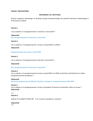 POWIAT KROTOSZYŃSKI ODPOWIEDZI NA ZAPYTANIA Dotyczy zapytania ofertowego na dostawę sprzętu komputerowego dla potrzeb Starostwa Powiatowego w Krotoszynie (5 Zadań) Pytanie 1 Czy w zadaniu nr 3 oprogramowanie może być w wersji GOV ? Odpowiedź Nie, oprogramowanie nie może być w wersji GOV Pytanie 2 Czy w zadaniu nr 3 oprogramowanie ma być w wersji MOLP czy OEM ? Odpowiedź Oprogramowanie winno być w wersji OEM. Pytanie 3 Czy w zadaniu nr 4 oprogramowanie może być w wersji GOV ? Odpowiedź Nie, oprogramowanie nie może być w wersji GOV Pytanie 4 Czy w zadaniu nr 4 oprogramowanie ma być w wersji MOLP czy OEM czy Runtime, jeśli Runtime to z jakim oprogramowaniem powiązane ? Odpowiedź Może być oprogramowanie OEM jak i Runtime. Powiązane z oprogramowaniem GEO-INFO Pytanie 5 Czy w zadaniu nr 4 oprogramowanie: ma być w komplecie 25 licencji na końcówki i jedna na serwer ? Odpowiedź Tak. Pytanie 6 Zadanie 2 Czy QNAP TS-879U-RP - 1 szt. ma być w komplecie z szynami? Odpowiedź Tak Pytanie 7 Dysk 2 TB HDD WD RED 2TB WD20EFRX SATA III 64MB – 5 szt., WD RED raczej nie są zalecane dla rozwiązań biznesowych. Ten model nie jest umieszczony na liście dysków kompatybilnych. Czy zamawiający zmieni model dysków na zalecane dla rozwiązań biznesowych WD RED PRO, czy jednak w ofercie mają być dyski 2 TB HDD WD RED 2TB WD20EFRX ? Odpowiedź Zamawiający nie zamieni modelu dysku. Pytanie 8 Prosze o informację czy Zamawiajacy dopuści w zad. 5: 2 szt. Fujitsu ESPRIMO Komputer P520 i5-4440 (3.2) 4GB 500GB IntelHD 4600 DVDSM W8PRO/W7PRO za Fujitsu ESPRIMO P520 i5-4570 (3.2) 4GB 500GB Intel HD4600 DVDSM W8PRO/W7PRO – 2 szt. 2 szt. Kingston HyperX 4GB 1600MHz DDR3 CL9 DIMM 1.65V XMP Beast Series Za Pamięci Kingston HyperX DDR3 4GB 1600MHz XMP CL9 Blue – 2 szt. Odpowiedź Zamawiający nie dopuszcza zamiany w zadaniu 5. Pytanie 9 Proszę o informację czy zamawiający posiada uprawnienia do wersji gov (tańszej) następującego oprogramowania: Oprogramowanie Microsoft Windows Server 2012 R2 Standard x64 z dostępem dla 25 urządzeń (CAL) – zadanie 3 Oprogramowanie Microsoft Windows SQL Server 2014 Standard z dostępem dla 25 użytkowników (CAL) – zadanie 4 Odpowiedź Zamawiający nie posiada uprawnień do wersji GOV Krotoszyn, dnia 29.10.2014 r. CZŁONEK ZARZĄDU /-/ Krzysztof Kaczmarek