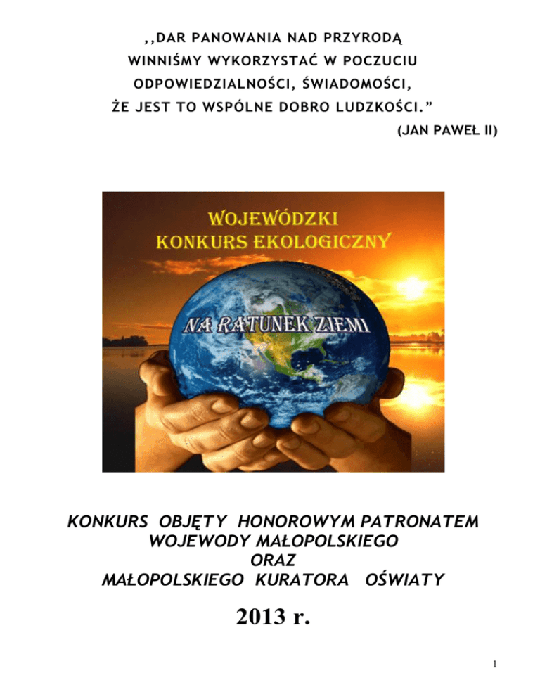 ,,DAR PANOWANIA NAD PRZYRODĄ WINNIŚMY WYKORZYSTAĆ W POCZUCIU ODPOWIEDZIALNOŚCI, ŚWIADOMOŚCI, ŻE JEST TO WSPÓLNE DOBRO LUDZKOŚCI.” (JAN PAWEŁ II) KONKURS OBJĘTY HONOROWYM PATRONATEM WOJEWODY MAŁOPOLSKIEGO ORAZ MAŁOPOLSKIEGO KURATORA OŚWIATY 2013 r. 1 Temat konkursu: EKOLOGIA i PTAKI CELE: 1. Propagowanie wiedzy przyrodniczej. 2. Uwrażliwianie na piękno otaczającego świata. 3. Dostrzeganie realnego zagrożenia życia na Ziemi. 4. Zrozumienie konieczności ochrony środowiska. 5. Zainteresowanie uczniów tematyką ornitologiczną. 6. Rozwijanie zainteresowań i uzdolnień przyrodniczych uczniów. PARTNERZY: Starostwo Powiatowe w Wieliczce Urząd Gminy w Gdowie Urząd Gminy w Biskupicach Stowarzyszenie na Rzecz EKO-Rozwoju Wsi Trąbki Publiczna Szkoła Podstawowa w Trąbkach Gimnazjum w Niegowici KOORDYNATORZY: Dyrektor Szkoły Podstawowej w Trąbkach – mgr Grażyna Pogorzelczyk - Kluska Dyrektor Gimnazjum w Niegowici – mgr inż. Leszek Rajtarski ORGANIZATORZY: Publiczna Szkoła Podstawowa w Trąbkach Gimnazjum w Niegowici UCZESTNICY: Uczniowie Przedszkoli i Szkół Podstawowych Uczniowie Gimnazjum Fundacje Osób Niepełnosprawnych, Ośrodki Wsparcia Dziennego i Świetlice Środowiskowe FORMY KONKURSU: Turniej wiedzy Konkurs plastyczny Konkurs literacki Konkurs fotograficzny 2 Harmonogram konkursu Lp. 1. Zadanie Zgłoszenie udziału w konkursie – turniej wiedzy Termin do 22 lutego 2013r. Szkoły Podstawowe i Przedszkola: tel. 12/250 – 50 – 55 Szkoła Podstawowa w Trąbkach lub 692 201 391 Dominika Nowak; e-mail: [email protected] Gimnazja: tel. 12/251 – 95 – 15 Gimnazjum w Niegowici lub 12/251 – 40 – 54 Janina Świeży; e-mail: [email protected] 2. Turniej wiedzy Przedszkola i Szkoły Podstawowe - Szkoła Podstawowa w Trąbkach Gimnazja – Gimnazjum w Niegowici 3. Termin oddawania prac: plastycznych, literackich i fotograficznych. 26 lutego 2013 r. (wtorek) godz. 10.00 do 1 marca 2013 r. Miejsce: Szkoła Podstawowa w Trąbkach oraz Gimnazjum w Niegowici 4. Wybór najlepszych prac plastycznych, literackich i fotograficznych przez komisję powołaną przez organizatorów. 6 marca 2013 r. godz. 11.00 W tym dniu zapraszamy chętnych uczestników konkursu wraz z opiekunami do udziału w głosowaniu na specjalną Nagrodę Publiczności Miejsce: Urząd Gminy Biskupice – Tomaszkowice 455 5 GALA KONKURSU –wręczenie nagród i wystawa prac 19 marca 2013 r. Miejsce: Gimnazjum w Niegowici KONKURS PLASTYCZNY 3 KATEGORIA prace płaskie format: A2 technika: dowolna prace przestrzenne format i technika: dowolna GRUPA WIEKOWA Przedszkola i SP – kl. O – I SP – kl. II – III SP – kl. IV – VI Gimnazjum – kl. I – III Fundacje Osób Niepełnosprawnych i Ośrodki Wsparcia Dziennego Przedszkola i SP – kl. 0 – III SP – kl. II – III SP – kl. IV – VI Gimnazjum – kl. I – III Fundacje Osób Niepełnosprawnych i Ośrodki Wsparcia Dziennego KONKURS LITERACKI KATEGORIA proza format: max. 2 strony A4 poezja format: max. 1 strona A4 GRUPA WIEKOWA Przedszkola i SP – kl. 0 – III SP – kl. IV – VI Gimnazjum – kl. I – III Przedszkola i SP – kl. 0 – III SP – kl. IV – VI Gimnazjum – kl. I – III KONKURS FOTOGRAFICZNY KATEGORIA format i wielkość zdjęć: dowolny GRUPA WIEKOWA Przedszkola i SP – kl. 0 – VI Gimnazjum – kl. I – III Każda szkoła może przesłać jedną pracę z każdej grupy wiekowej z wymienionych wyżej kategorii. Autorem jednej pracy konkursowej może być tylko jeden uczeń. Wszystkie prace konkursowe: plastyczne, literackie i fotograficzne muszą być opisane na odwrocie: imię i nazwisko wykonawcy oraz klasę adres i nazwę szkoły imię i nazwisko opiekuna pracy (kontakt mailowy lub telefoniczny) Prace po zakończeniu konkursu można odebrać u organizatorów do 10.04.2013 r. ZAPRASZAMY DO UDZIAŁU, NA FINALISTÓW CZEKAJĄ ATRAKCYJNE NAGRODY ! 4 SZKOŁA PODSTAWOWA KATEGORIA: kl. IV - VI KATEGORIA: kl. 0-III Każdą Szkołę Podstawową może reprezentować tylko jeden uczeń kategorii. (czyli jeden uczeń z klas 0 – III). Uczniowie klas 0 – I wezmą udział w turnieju wiedzy - w formie ustnej oraz testu wyboru - obrazki Natomiast uczniów klas II-III będzie obowiązywał pisemny test wyboru. Czas rozwiązania: 45 minut. OGÓLNE ZAGADNIENIA Planeta Ziemia: ekologia, czyli wzajemne zależności organizmów i ich środowisk; współczesne zagrożenia dla świata przyrody; mój organizm, jego potrzeby i rozwój. Świat zwierząt: rozpoznawanie i nazywanie spotykanych w najbliższej okolicy ssaków dziko żyjących i hodowanych przez człowieka; zwierzęta chronione, wymarłe; nazwy zawodów związanych ze światem zwierząt i ich hodowlą. Literatura: 1. Realizowany program nauczania edukacji w Szkole Podstawowej. 2. Książka „Ptaki Świata”, Studio FENIX ISBN: 978-83-63203-85-6 Turniej przeprowadzony jest w formie testu wyboru. Czas rozwiązania 45 minut. Każdą Szkołę Podstawową może reprezentować tylko jeden uczeń. OGÓLNE ZAGADNIENIA 1. Ekologia, czyli wzajemne zależności pomiędzy organizmami a środowiskiem. 2. Formy ochrony przyrody w Polsce. 3. Źródła zanieczyszczeń środowiska. 4. Globalne skutki zanieczyszczeń środowiska (dziura ozonowa, efekt cieplarniany, smog, kwaśne deszcze) 5. Sposoby zmniejszania ilości zanieczyszczeń. 6. Ptaki: charakterystyczne cechy budowy, przystosowanie do lotu, gniazdowniki i zagniazdowniki, wędrówki, różnorodność, ochrona gatunkowa. Literatura: 1. Podręczniki szkolne, zeszyty ćwiczeń oraz atlasy do przyrody (kl. IV – VI) dopuszczone do użytku szkolnego. 2. „Atlas ptaków polskich” Anna Przybyłowicz, wyd. Publicat 3. „Zwierzęta chronione w Polsce” (ptaki), wyd. IBIS 2012 4. Ekologia – atlas ilustrowany, wyd. EUROPA 2009 5 GIMNAZJUM Turniej przeprowadzany jest w formie testu. Test składa się z 50 pytań (pytania zamknięte i otwarte). Czas rozwiązania: 45 minut. Każde Gimnazjum może reprezentować trzech uczniów. OG