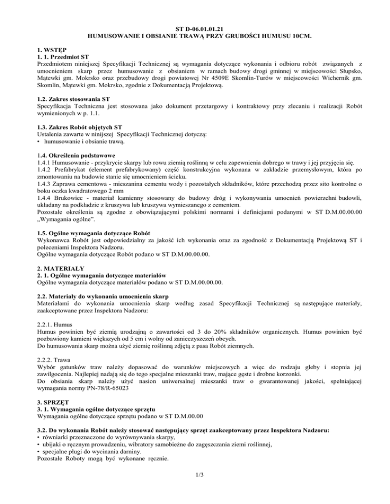 ST D-06.01.01.21 HUMUSOWANIE I OBSIANIE TRAWĄ PRZY GRUBOŚCI HUMUSU 10CM. 1. WSTĘP 1. 1. Przedmiot ST Przedmiotem niniejszej Specyfikacji Technicznej są wymagania dotyczące wykonania i odbioru robót związanych z umocnieniem skarp przez humusowanie z obsianiem w ramach budowy drogi gminnej w miejscowości Słupsko, Mątewki gm. Mokrsko oraz przebudowy drogi powiatowej Nr 4509E Skomlin-Turów w miejscowości Wichernik gm. Skomlin, Mątewki gm. Mokrsko, zgodnie z Dokumentacją Projektową. 1.2. Zakres stosowania ST Specyfikacja Techniczna jest stosowana jako dokument przetargowy i kontraktowy przy zlecaniu i realizacji Robót wymienionych w p. 1.1. 1.3. Zakres Robót objętych ST Ustalenia zawarte w ninijszej Specyfikacji Technicznej dotyczą: • humusowanie i obsianie trawą. 1.4. Określenia podstawowe 1.4.1 Humusowanie - przykrycie skarpy lub rowu ziemią roślinną w celu zapewnienia dobrego w trawy i jej przyjęcia się. 1.4.2 Prefabrykat (element prefabrykowany) część konstrukcyjna wykonana w zakładzie przemysłowym, która po zmontowaniu na budowie stanie się umocnieniem ścieku. 1.4.3 Zaprawa cementowa - mieszanina cementu wody i pozostałych składników, które przechodzą przez sito kontrolne o boku oczka kwadratowego 2 mm 1.4.4 Brukowiec - materiał kamienny stosowany do budowy dróg i wykonywania umocnień powierzchni budowli, układany na podkładzie z kruszywa lub kruszywa wymieszanego z cementem. Pozostałe określenia są zgodne z obowiązującymi polskimi normami i definicjami podanymi w ST D.M.00.00.00 „Wymagania ogólne”. 1.5. Ogólne wymagania dotyczące Robót Wykonawca Robót jest odpowiedzialny za jakość ich wykonania oraz za zgodność z Dokumentacją Projektową ST i poleceniami Inspektora Nadzoru. Ogólne wymagania dotyczące Robót podano w ST D.M.00.00.00. 2. MATERIAŁY 2. 1. Ogólne wymagania dotyczące materiałów Ogólne wymagania dotyczące materiałów podano w ST D.M.00.00.00. 2.2. Materiały do wykonania umocnienia skarp Materiałami do wykonania umocnienia skarp według zasad Specyfikacji Technicznej są następujące materiały, zaakceptowane przez Inspektora Nadzoru: 2.2.1. Humus Humus powinien być ziemią urodzajną o zawartości od 3 do 20% składników organicznych. Humus powinien być pozbawiony kamieni większych od 5 cm i wolny od zanieczyszczeń obcych. Do humusowania skarp można użyć ziemię roślinną zdjętą z pasa Robót ziemnych. 2.2.2. Trawa Wybór gatunków traw należy dopasować do warunków miejscowych a więc do rodzaju gleby i stopnia jej zawilgocenia. Najlepiej nadają się do tego specjalne mieszanki traw, mające gęste i drobne korzonki. Do obsiania skarp należy użyć nasion uniwersalnej mieszanki traw o gwarantowanej jakości, spełniającej wymagania normy PN-78/R-65023 3. SPRZĘT 3. 1. Wymagania ogólne dotyczące sprzętu Wymagania ogólne dotyczące sprzętu podano w ST D.M.00.00 3.2. Do wykonania Robót należy stosować następujący sprzęt zaakceptowany przez Inspektora Nadzoru: • równiarki przeznaczone do wyrównywania skarpy, • ubijaki o ręcznym prowadzeniu, wibratory samobieżne do zagęszczania ziemi roślinnej, • specjalne pługi do wycinania darniny. Pozostałe Roboty mogą być wykonane ręcznie. 1/3 4. TRANSPORT 4. 1. Wymagania ogólne dotyczące transportu Wymagania ogólne dotyczące transportu podano w ST D.M.00.00.00. 4.2. Transport materiałów do wykonania umocnienia skarp 4.2.1. Transport humusu Transport humusu może być wykonywany dowolnymi środkami transportu. 4.2.2. Transport trawy Środki transportowe powinny być czyste i zabezpieczające nasiona przed zamoknięciem oraz obniżeniem ich wartości siewnej. 5. WYKONANIE ROBÓT 5. 1. Ogólne zasady wykonywania Robót Ogólne zasady wykonywania Robót podano w SST D.M.00.00.00. Wykonawca przedstawi Inspektorowi Nadzoru do akceptacji projekt organizacji i harmonogram Robót, uwzględniające wszystkie warunki w jakich będzie wykonywane umocnienie skarp przez humusowanie z obsianiem trawą, umocnienia dna i skarp brukowcem oraz wykonanie ścieków skarpowych. 5.2. Humusowanie Przed przystąpieniem do humusowania skarp, ich powierzchnie powinny odpowiadać wymaganiom określonym w Dokumentacji Projektowej. Grubość przykrycia ziemią roślinną wynosi 10cm. Dla lepszego powiązania warstwy humusu z gruntem naturalnym zaleca się w powierzchni skarpy naciąć niewielkie rowki poziomo lub pod kątem 30÷45° w odstępach co 0,5÷1,0 m i głębokości 15÷20 cm. Warstwę ziemi roślinnej należy lekko zagęścić przez ubicie ręczne lub mechaniczne i przedłużyć poza górną krawędź skarpy oraz podnóże skarpy nasypu na długość 15÷25 cm. 5.3. Obsianie trawą Obsianie powierzchni skarp trawą powinno być przeprowadzone w odpowiednich warunkach atmosferycznych - w okresie wiosny lub jesieni. Ziarna trawy powinny być równomiernie rozsypane na powierzchni skarp w ilości 6 kg/100m2 skarpy, a po rozsypaniu przykryte gruntem poprzez lekkie grabienie powierzchni skarpy. Wykonawca powinien podjąć wszelkie środki aby zapewnić prawidłowy rozwój ziaren trawy po ich wysianiu. W okresie suszy należy systematycznie zraszać wodą obsiane powierzchnie skarp. 6. KONTROLA JAKOŚCI ROBÓT 6. 1. Ogólne zasady kontroli jakości Robót Ogólne zasady kontroli jakości Robót podano w ST D.M.00.00.00. 6.2. Kontrola przed rozpoczęciem Robót Przed wykonywaniem umocnienia skarp Wykonawca powinien sprawdzić jakość materiałów używanych do umocnienia skarp w zakresie zgodności z wymaganiami podanymi w p. 2.2. 6.3. Kontrola jakości wykonania umocnienia W trakcie wykonywania Robót i odbioru należy zbadać: • prawidłowość humusowania i obsiania trawą, 6.3.1. Badanie jakości humusowania i obsiania trawą Kontrola Robót w zakresie humusowania i obsiania polega na sprawdzeniu: • oczyszczenia terenu z zanieczyszczeń, • rozścielenia humusu z kontrolą grubości warstwy rozścielonej ziemi, • zgodności składu