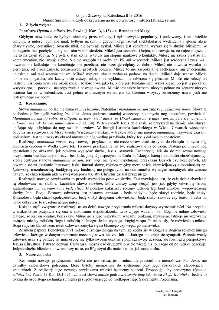 ks. Jan Orzeszyna, Katecheza III / 2016: Mandatum novum, czyli odkrywanie na nowo wartości miłości (streszczenie). 1. Z życia wzięte: Parafraza Hymnu o miłości św. Pawła (1 Kor 13,1-13) – s. Brunona od Maryi Gdybym mówił tak, że byłbym słuchany przez miliony, i był niezwykle popularny, i podziwiany, i miał wielkie wpływy, a miłości bym nie miał, byłbym niczym. I gdybym organizował spektakularne wydarzenia i głośne akcje charytatywne, lecz miłości bym nie miał, nic bym nie zyskał. Miłość jest konkretna, wyraża się w służbie bliźniemu, w pomaganiu mu, pochyleniu się nad nim w miłosierdziu. Miłość jest szczodra i hojna, ofiarowuje to, co najcenniejsze, a nie to na czym zbywa. Nie pyta o stan konta, o tytuły ani stopnie naukowe o kontakty. Miłość nie szuka prestiżu ani komplementów, nie lansuje siebie. Nie ma względu na osoby ani PR ani wizerunek. Miłość jest serdeczna i życzliwa i otwarta, nie kalkuluje, nie kombinuje, nie przelicza, nie oczekuje odpłaty za dobro. Miłość nie odwraca wzroku od cierpienia, od prozaicznych, codziennych, prostych potrzeb. Miłość to nie zaspokajanie zachcianek, ani emocjonalne uniesienie, ani tani sentymentalizm. Miłość wspiera, słucha wybacza podnosi na duchu. Miłość daje szansę. Miłość nikim nie pogardza, ale każdym się cieszy, nikogo nie wyklucza, nie odwraca się plecami. Miłość nie zależy od nastroju, ciśnienia krwi czy okoliczności. Miłość trwa jako ta, która jest fundamentem wszystkiego, bo jest u początku wszystkiego, u początku naszego życia i naszego świata. Miłość jest także kresem, niczym północ na zegarze niczym ostatnia kartka w kalendarzu. Jest pełnią ostatecznym wymiarem ku któremu wszyscy zmierzamy nawet jeśli nie jesteśmy tego świadomi. 2. Rozważanie: Słowo mandatum po łacinie oznacza przykazanie. Natomiast mandatum novum znaczy przykazanie nowe. Słowa te pochodzą z Ewangelii według św. Jana. Jezus podczas ostatniej wieczerzy, po umyciu nóg apostołom, powiedział: Mandatum novum do vobis, ut diligatis invicem, sicut dilexi vos (Przykazanie nowe daję wam, abyście się wzajemnie miłowali, tak jak Ja was umiłowałem - J 13, 34). W ten sposób Jezus daje znak, że przyszedł na ziemię, aby służyć, uniżając się, schylając do nóg swoich uczniów. W liturgii Kościoła katolickiego w Wielki Czwartek wieczorem odbywa się sprawowanie Mszy świętej Wieczerzy Pańskiej, w trakcie której ma miejsce mandatum, nazywane czasami pedilavium. Jest to uroczysty obrzęd umywania nóg według przykładu, który Jezus dał swoim apostołom. Realizacja mandatum novum, czyli nowego przykazania, nie może sprowadzać się tylko do obrzędu obmycia nóg dwunastu osobom w Wielki Czwartek. To nowe przykazanie ma być realizowane na co dzień. Dlatego po umyciu nóg apostołom i po ukazaniu, jak powinna wyglądać służba, Jezus ustanawia Eucharystię. Nie da się realizować nowego przykazania bez Eucharystii, czyli bez łaski, jaką daje spożywanie Ciała Pańskiego. Istotą moralności chrześcijańskiej, której centrum stanowi mandatum novum, jest więc nie tylko wypełnianie przykazań Bożych czy kościelnych, ale otwarcie się na działanie Jezusowej łaski. Innymi słowy, różnica między moralnością chrześcijańską a moralnością np. żydowską, muzułmańską, buddyjską czy hinduską nie polega tylko na odmienności wymagań moralnych, ale właśnie na tym, że chrześcijanin aktem swej woli pozwala, aby Chrystus działał przez niego. Realizacja nowego przykazania to przede wszystkim postawa służby. Zastanawiające jest, że całe dzieje zbawienia są zbudowane na służbie. Łacińskie słowo serviam, które znaczy będę służył, jest jak gdyby odwrotną stroną szatańskiego non serviam - nie będę służy. U podstaw katastrofy rodziny ludzkiej legł bunt aniołów, wypowiedzenie służby Panu Bogu. Postawą odwrotną jest postawa serviam - będę służył - będę służył rodzinie, będę służył Kościołowi, będę służył społeczeństwu, będę służył drugiemu człowiekowi, będę służył siostrze czy bratu. Trzeba na nowo odkrywać tę służebną naturę miłości. Kolejna myśl związana z realizacją na co dzień nowego przykazania miłości dotyczy wyrozumiałości. Na przykład w małżeństwie przejawia się ona w miłowaniu współmałżonka wraz z jego wadami. Pan Bóg nie miłuje człowieka dlatego, że jest on idealny, bez skazy. Miłuje go z jego wszystkimi wadami, brakami, minusami. Istnieje nierozerwalny związek między miłością Boga i miłością bliźniego. Jedna wymaga drugiej w sposób tak ścisły, że mówienie o miłości Boga staje się kłamstwem, jeżeli człowiek zamyka się na bliźniego czy wręcz go nienawidzi. Zdaniem papieża Benedykta XVI miłość bliźniego polega na tym, że kocha się w Bogu i z Bogiem również innego człowieka, którego w danym momencie może się nawet nie zna lub do którego nie czuje się sympatii. Właśnie wtedy człowiek uczy się patrzeć na inną osobę nie tylko swoimi oczyma i poprzez swoje uczucia, ale również z perspektywy Jezusa Chrystusa. Patrząc oczyma Chrystusa, można dać drugiemu o wiele więcej niż to, czego on po ludzku oczekuje. Jedynie służba bliźniemu otwiera oczy na to, co Bóg czyni dla mnie, i na to, jak mnie kocha. 3. Nasze zadania: Realizacja nowego przykazania miłości nie jest łatwa, jest trudna, ale przecież nie niemożliwa. Pan Jezus nie dawałby człowiekowi polecenia, które byłoby niemożliwe do spełnienia przy jego różnorakich słabościach i zranieniach. Z realizacji tego nowego przykazania miłości będziemy sądzeni. Proponuję, aby przeczytać Hymn o miłości św. Pawła (1 Kor 13,1-13) i zamiast słowa miłość podstawić swoje imię lub słowa Akcja Katolicka, będzie to okazja do osobistego rachunku sumienia przygotowującego do wielkopostnego Sakramentu Pojednania. Króluj nam Chryste! 