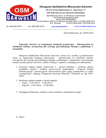 Okręgowa Spółdzielnia Mleczarska Garwolin 08-410 Wola Rębkowska ul. Ogrodowa 17 NIP 826-000-34-42 REGON 000440650 Sąd Rejonowy dla m. st. Warszawy w Warszawie XIV Wydział Gospodarczy KRS Numer KRS 0000052678 Konto bankowe: BGŻ S.A O/Siedlce 93 2030 0045 1110 0000 0046 2770 B.S. Garwolin 72 9210 0008 0000 1762 2000 0010 tel. (025) 682 22 61 fax. (025) 682 22 63 www.osmgarwolin.pl e-mail [email protected] Wola Rębkowska, dn. 30.09.2016r Zapytanie ofertowe na organizację kampanii promocyjno – informacyjnej na nośnikach reklamy zewnętrznej dla twarogu garwolińskiego tłustego i półtłustego w pergaminie Okręgowa Spółdzielnia Mleczarska Garwolin, zwraca się z prośbą o przedstawienie oferty na organizację kampanii promocyjno – informacyjnej na nośnikach reklamy zewnętrznej dla twarogu garwolińskiego tłustego i półtłustego w pergaminie, wytwarzanego ramach systemu jakości żywności „Jakość Tradycja”, zgodnie z następującymi założeniami: 1. Powyższe zadanie będzie realizowane w ramach działania 3 „Systemy jakości produktów rolnych i środków spożywczych” poddziałanie „Wsparcie działań informacyjnych i promocyjnych realizowanych przez grupy producentów na rynku wewnętrznym” objętego Programem Rozwoju Obszarów Wiejskich na lata 20142020”. 2. Realizacja zadania nastąpi w dwóch etapach: Etap I – 27.03.2017r – 31.08.2017r Etap III – 15.03.2018r – 31.08.2018r 3. Wymagane lokalizacje, wielkość i ilości nośników z podziałem na etapy: a) Etap I: Okręgowa Spółdzielnia Mleczarska Garwolin 08-410 Wola Rębkowska ul. Ogrodowa 17 NIP 826-000-34-42 REGON 000440650 Sąd Rejonowy dla m. st. Warszawy w Warszawie XIV Wydział Gospodarczy KRS Numer KRS 0000052678 Konto bankowe: BGŻ S.A O/Siedlce 93 2030 0045 1110 0000 0046 2770 B.S. Garwolin 72 9210 0008 0000 1762 2000 0010 tel. (025) 682 22 61 fax. (025) 682 22 63 lokalizacja warszawska warszawska woj. podkarpackie woj. lubelskie cała Polska w pobliżu sklepów Auchan Warszawa www.osmgarwolin.pl rodzaj nośnika min.500cm x 200cm min. 600cm x 300cm min. 500cm x 200cm min. 500cm x 200cm e-mail [email protected] ilość nośników 100 20 50 50 czas emisji 01-30.06.2017r 01-30.06.2017r 01-30.06.2017r 01-30.06.2017r min. 500cm x 200cm 100 01-30.06.2017r metro bądź przystanki autobusowe 120 01-31.05.2017r ilość nośników 100 20 50 50 czas emisji 01-31.05.2018r 01-31.05.2018r 01-31.05.2018r 01-31.05.2018r min. 500cm x 200cm 100 01-31.05.2018r metro bądź przystanki autobusowe 120 01-30.06.2018r b) Etap III: lokalizacja warszawska warszawska woj. podkarpackie woj. lubelskie cała Polska w pobliżu sklepów Auchan Warszawa rodzaj nośnika min.500cm x 200cm min. 600cm x 300cm min. 500cm x 200cm min. 500cm x 200cm 4. Grupa docelowa do której ma być kierowany przekaz promocyjno – informacyjny określona została w załączniku nr 1. 5. Oferta musi być ważna do 31.03.2017r 6. Zleceniodawca zastrzega, iż płatność za realizację zlecenia nastąpi nie wcześniej niż po emisji nośników promocyjno – informacyjnych każdym z dwóch etapów oddzielnie. 7. Zleceniodawca nie dopuszcza składania ofert cząstkowych, wymagane jest złożenie ofert na całość zamówienia. 8. Zleceniodawca nie przewiduje możliwości zwrotu kosztów udziału w konkursie ofert. W szczególności Oferent ponosi wszelkie koszty związane z przygotowaniem i złożeniem oferty. 9. Oferta powinna zawierać: Okręgowa Spółdzielnia Mleczarska Garwolin 08-410 Wola Rębkowska ul. Ogrodowa 17 NIP 826-000-34-42 REGON 000440650 Sąd Rejonowy dla m. st. Warszawy w Warszawie XIV Wydział Gospodarczy KRS Numer KRS 0000052678 Konto bankowe: BGŻ S.A O/Siedlce 93 2030 0045 1110 0000 0046 2770 B.S. Garwolin 72 9210 0008 0000 1762 2000 0010 tel. (025) 682 22 61 fax. (025) 682 22 63 www.osmgarwolin.pl e-mail [email protected] a) Strategię oraz uzasadnienie wyboru lokalizacji nośników b) Całościową kwotę netto przeprowadzenia kampanii, w rozbiciu na poszczególne lokalizacje nośników oraz etapy. c) Termin ważności oferty. d) Termin płatności. e) Nazwę i adres oferenta; Złożona oferta powinna uwzględniać wszystkie zobowiązania, obejmować wszystkie koszty i składnik związane z wykonaniem zamówienia. Cena realizacji niniejszego zlecenia będzie obowiązującą przez cały okres ważności oferty. 10. Wybór najkorzystniejszej oferty nastąpi w oparciu o następujące kryteria: a) Strategia kampanii wraz z uzasadnieniem wyboru lokalizacji nośników – 50% b) Cena – 50% przy użyciu wskazanego poniżej wzoru: ilość punktów przyznanych za kryterium nr 1 (od 0 do 10) x 0,50 ilość punktów przyznanych za kryterium nr 2 (od 0 do 10) x 0,50 Najkorzystniejszą ofertą będzie oferta z najwyższą sumą punktów. 11. Ofertę należy złożyć w dwóch jednobrzmiących egzemplarzach na prawach oryginału, przygotowanych w taki sposób, aby tworzyły spójną, fizycznie połączoną ze sobą całość (tzn. dokumenty składające się na ofertę powinny być zszyte, bindowane lub w inny sposób ze sobą połączone). 12. Ofertę należy sporządzić w języku polskim, w formie pisemnej. Oferta powinna być podpisana przez osobę upoważnioną, opatrzona pieczątką firmową oraz zawierać datę sporządzenia. Oferta może być złożona osobiście, przesłana pocztą lub za pośrednictwem kuriera. 13. Ofertę należy złożyć do dnia 7 października 2016r do godziny 12:00 w siedzibie Zamawiającego, tj.: Okręgowa Spółdzielnia Mleczarska Garwolin Ul. Ogrodowa 17 08-410 Wola Rębkowska Okręgowa Spółdzielnia Mleczarska Garwolin 08-410 Wola Rębkowska ul. Ogrodowa 17 NIP 826-000-34-42 REGON 000440650 Sąd Rejonowy dla m. st. Warszawy w Warszawie XIV Wydział Gospodarczy KRS Numer KRS 0000052678 Konto bankowe: BGŻ S.A O/Siedlce 93 2030 0045 1110 0000 0046 2770 B.S. Garwolin 72 9210 0008 0000 1762 2000 0010 tel. (025) 682 22 61 fax. (025) 682 22 63 www.osmgarwolin.pl e-mail [email protected] 14. 