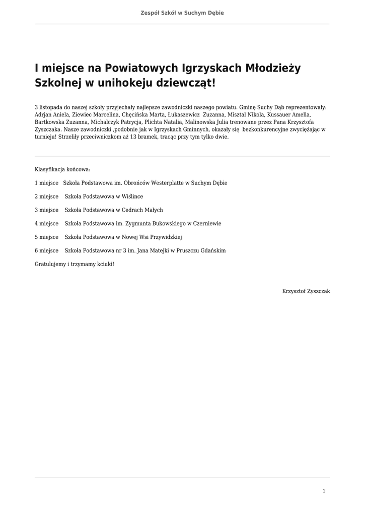 Zespół Szkół w Suchym Dębie I miejsce na Powiatowych Igrzyskach Młodzieży Szkolnej w unihokeju dziewcząt! 3 listopada do naszej szkoły przyjechały najlepsze zawodniczki naszego powiatu. Gminę Suchy Dąb reprezentowały: Adrjan Aniela, Ziewiec Marcelina, Chęcińska Marta, Łukaszewicz Zuzanna, Misztal Nikola, Kussauer Amelia, Bartkowska Zuzanna, Michalczyk Patrycja, Plichta Natalia, Malinowska Julia trenowane przez Pana Krzysztofa Zyszczaka. Nasze zawodniczki ,podobnie jak w Igrzyskach Gminnych, okazały się bezkonkurencyjne zwyciężając w turnieju! Strzeliły przeciwniczkom aż 13 bramek, tracąc przy tym tylko dwie. Klasyfikacja końcowa: 1 miejsce Szkoła Podstawowa im. Obrońców Westerplatte w Suchym Dębie 2 miejsce Szkoła Podstawowa w Wiślince 3 miejsce Szkoła Podstawowa w Cedrach Małych 4 miejsce Szkoła Podstawowa im. Zygmunta Bukowskiego w Czerniewie 5 miejsce Szkoła Podstawowa w Nowej Wsi Przywidzkiej 6 miejsce Szkoła Podstawowa nr 3 im. Jana Matejki w Pruszczu Gdańskim Gratulujemy i trzymamy kciuki! Krzysztof Zyszczak 1