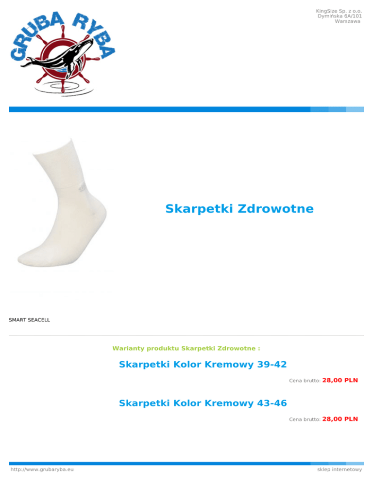 KingSize Sp. z o.o. Dymińska 6A/101 Warszawa Skarpetki Zdrowotne SMART SEACELL Warianty produktu Skarpetki Zdrowotne : Skarpetki Kolor Kremowy 39-42 Cena brutto: 28,00 PLN Cena brutto: 28,00 PLN Skarpetki Kolor Kremowy 43-46 http://www.grubaryba.eu sklep internetowy