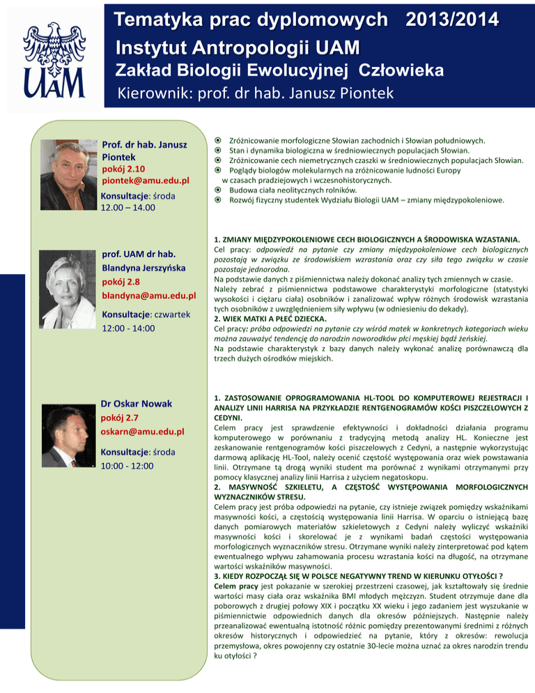 Tematyka prac dyplomowych 2013/2014 Instytut Antropologii UAM Zakład Biologii Ewolucyjnej Człowieka Kierownik: prof. dr hab. Janusz Piontek Prof. dr hab. Janusz Piontek pokój 2.10 [email protected] Konsultacje: środa 12.00 – 14.00 prof. UAM dr hab. Blandyna Jerszyńska pokój 2.8 [email protected] Konsultacje: czwartek 12:00 - 14:00 Dr Oskar Nowak pokój 2.7 [email protected] Konsultacje: środa 10:00 - 12:00 Zróżnicowanie morfologiczne Słowian zachodnich i Słowian południowych. Stan i dynamika biologiczna w średniowiecznych populacjach Słowian. Zróżnicowanie cech niemetrycznych czaszki w średniowiecznych populacjach Słowian. Poglądy biologów molekularnych na zróżnicowanie ludności Europy w czasach pradziejowych i wczesnohistorycznych. Budowa ciała neolitycznych rolników. Rozwój fizyczny studentek Wydziału Biologii UAM – zmiany międzypokoleniowe. 1. ZMIANY MIĘDZYPOKOLENIOWE CECH BIOLOGICZNYCH A ŚRODOWISKA WZASTANIA. Cel pracy: odpowiedź na pytanie czy zmiany międzypokoleniowe cech biologicznych pozostają w związku ze środowiskiem wzrastania oraz czy siła tego związku w czasie pozostaje jednorodna. Na podstawie danych z piśmiennictwa należy dokonać analizy tych zmiennych w czasie. Należy zebrać z piśmiennictwa podstawowe charakterystyki morfologiczne (statystyki wysokości i ciężaru ciała) osobników i zanalizować wpływ różnych środowisk wzrastania tych osobników z uwzględnieniem siły wpływu (w odniesieniu do dekady). 2. WIEK MATKI A PŁEĆ DZIECKA. Cel pracy: próba odpowiedzi na pytanie czy wśród matek w konkretnych kategoriach wieku można zauważyć tendencję do narodzin noworodków płci męskiej bądź żeńskiej. Na podstawie charakterystyk z bazy danych należy wykonać analizę porównawczą dla trzech dużych ośrodków miejskich. 1. ZASTOSOWANIE OPROGRAMOWANIA HL-TOOL DO KOMPUTEROWEJ REJESTRACJI I ANALIZY LINII HARRISA NA PRZYKŁADZIE RENTGENOGRAMÓW KOŚCI PISZCZELOWYCH Z CEDYNI. Celem pracy jest sprawdzenie efektywności i dokładności działania programu komputerowego w porównaniu z tradycyjną metodą analizy HL. Konieczne jest zeskanowanie rentgenogramów kości piszczelowych z Cedyni, a następnie wykorzystując darmową aplikację HL-Tool, należy ocenić częstość występowania oraz wiek powstawania linii. Otrzymane tą drogą wyniki student ma porównać z wynikami otrzymanymi przy pomocy klasycznej analizy linii Harrisa z użyciem negatoskopu. 2. MASYWNOŚĆ SZKIELETU, A CZĘSTOŚĆ WYSTĘPOWANIA MORFOLOGICZNYCH WYZNACZNIKÓW STRESU. Celem pracy jest próba odpowiedzi na pytanie, czy istnieje związek pomiędzy wskaźnikami masywności kości, a częstością występowania linii Harrisa. W oparciu o istniejącą bazę danych pomiarowych materiałów szkieletowych z Cedyni należy wyliczyć wskaźniki masywności kości i skorelować je z wynikami badań częstości występowania morfologicznych wyznaczników stresu. Otrzymane wyniki należy zinterpretować pod kątem ewentualnego wpływu zahamowania procesu wzrastania kości na długość, na otrzymane wartości wskaźników masywności. 3. KIEDY ROZPOCZĄŁ SIĘ W POLSCE NEGATYWNY TREND W KIERUNKU OTYŁOŚCI ? Celem pracy jest pokazanie w szerokiej przestrzeni czasowej, jak kształtowały się średnie wartości masy ciała oraz wskaźnika BMI młodych mężczyzn. Student otrzymuje dane dla poborowych z drugiej połowy XIX i początku XX wieku i jego zadaniem jest wyszukanie w piśmiennictwie odpowiednich danych dla okresów późniejszych. Następnie należy przeanalizować ewentualną istotność różnic pomiędzy prezentowanymi średnimi z różnych okresów historycznych i odpowiedzieć na pytanie, który z okresów: rewolucja przemysłowa, okres powojenny czy ostatnie 30-lecie można uznać za okres narodzin trendu ku otyłości ? http://www.staff.amu.edu.pl/~anth Tematyka prac dyplomowych 2013/2014 Instytut Antropologii UAM Zakład Biologii Ewolucyjnej Człowieka Kierownik: prof. dr hab. Janusz Piontek Dr inż. Anna Juras pokój 2.02 [email protected] Konsultacje: Poniedziałek 10.00 – 12.00 Dr Marta Krenz-Niedbała pokój 2.13 [email protected] Konsultacje: wtorek 11.00 – 13.00 1. BADANIA CHROMOSOMU Y EUROPEJSKICH POPULACJI PRADZIEJOWYCH Celem pracy jest przedstawienie głównych haplogrup i haplotypów chromosomu Y jakie zostały zidentyfikowane w kopalnych populacjach z terenu Europy. Zadaniem studenta jest również opisanie metod badawczych wykorzystywanych do określania przynależności haplogrupowej i haplotypowej chromosomu Y w populacjach pradziejowych oraz opracowanie starterów DNA umożliwiających amplifikację sekwencji markerowych kopalnego chromosomu Y. Student będzie miał możliwość przetestowania zaprojektowanych przez siebie starterów na współczesnym materiale genetycznym. Materiały i metody: dane literaturowe wyszukane przez licencjusza, programy do projektowania starterów DNA, publiczne bazy danych chromosomu Y 2. ZRÓŻNICOWANIE HAPLOGRUP I HAPLOTYPÓW CHROMOSOMU Y W POPULACJACH SŁOWIAŃSKICH Praca ma charakter przeglądowy, a jej celem jest zebranie najnowszych informacji na temat rodzajów i częstości występowania haplogrup i haplotypów chromosomu Y w populacjach słowiańskich oraz hipotez dotyczących pochodzenia Słowian, które zostały wysunięte na podstawie badań chromosomu Y i zaprezentowane w najnowszej literaturze. Zadaniem studenta jest również przedstawienie metod badawczych oraz baz danych wykorzystywanych do wyznaczania przynależności haplogrupowej i haplotypowej chromosomu Y. Materiały i metody: dane literaturowe wyszukane przez licencjusza, publiczne bazy danych chromosomu Y 1. ETIOLOGIA I MORFOLOGIA PATOLOGICZNYCH ZMIAN WEWNĘTRZNEJ STRONY SKLEPIENIA CZASZKI U DZIECI POCHODZĄCYCH Z POPULACJI SZKIELETOWYCH. Materiał: przegląd literatury. Cel pracy: ocena przydatności "endocranial lesions" dla analizy stanu zdrowia dzieci pochodzących z populacji szkieletowych. Kierownik: dr Marta
