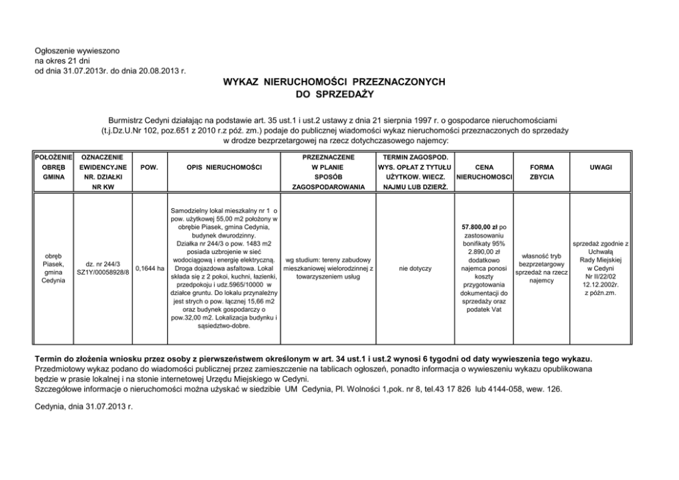 Ogłoszenie wywieszono na okres 21 dni od dnia 31.07.2013r. do dnia 20.08.2013 r. WYKAZ NIERUCHOMOŚCI PRZEZNACZONYCH DO SPRZEDAŻY Burmistrz Cedyni działając na podstawie art. 35 ust.1 i ust.2 ustawy z dnia 21 sierpnia 1997 r. o gospodarce nieruchomościami (t.j.Dz.U.Nr 102, poz.651 z 2010 r.z póź. zm.) podaje do publicznej wiadomości wykaz nieruchomości przeznaczonych do sprzedaży w drodze bezprzetargowej na rzecz dotychczasowego najemcy: POŁOŻENIE OZNACZENIE OBRĘB EWIDENCYJNE GMINA obręb Piasek, gmina Cedynia PRZEZNACZENE TERMIN ZAGOSPOD. W PLANIE WYS. OPŁAT Z TYTUŁU CENA FORMA NR. DZIAŁKI SPOSÓB UŻYTKOW. WIECZ. NIERUCHOMOSCI ZBYCIA NR KW ZAGOSPODAROWANIA NAJMU LUB DZIERŻ. dz. nr 244/3 SZ1Y/00058928/8 POW. OPIS NIERUCHOMOŚCI Samodzielny lokal mieszkalny nr 1 o pow. użytkowej 55,00 m2 położony w obrębie Piasek, gmina Cedynia, budynek dwurodzinny. Działka nr 244/3 o pow. 1483 m2 posiada uzbrojenie w sieć wodociągową i energię elektryczną. wg studium: tereny zabudowy 0,1644 ha Droga dojazdowa asfaltowa. Lokal mieszkaniowej wielorodzinnej z składa się z 2 pokoi, kuchni, łazienki, towarzyszeniem usług przedpokoju i udz.5965/10000 w działce gruntu. Do lokalu przynależny jest strych o pow. łącznej 15,66 m2 oraz budynek gospodarczy o pow.32,00 m2. Lokalizacja budynku i sąsiedztwo-dobre. nie dotyczy 57.800,00 zł po zastosowaniu bonifikaty 95% 2.890,00 zł dodatkowo najemca ponosi koszty przygotowania dokumentacji do sprzedaży oraz podatek Vat UWAGI sprzedaż zgodnie z Uchwałą własność tryb Rady Miejskiej bezprzetargowy w Cedyni sprzedaż na rzecz Nr II/22/02 najemcy 12.12.2002r. z późn.zm. Termin do złożenia wniosku przez osoby z pierwszeństwem określonym w art. 34 ust.1 i ust.2 wynosi 6 tygodni od daty wywieszenia tego wykazu. Przedmiotowy wykaz podano do wiadomości publicznej przez zamieszczenie na tablicach ogłoszeń, ponadto informacja o wywieszeniu wykazu opublikowana będzie w prasie lokalnej i na stonie internetowej Urzędu Miejskiego w Cedyni. Szczegółowe informacje o nieruchomości można użyskać w siedzibie UM Cedynia, Pl. Wolności 1,pok. nr 8, tel.43 17 826 lub 4144-058, wew. 126. Cedynia, dnia 31.07.2013 r.