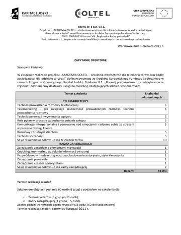 COLTEL SP. Z O.O. S.K.A. Projekt pt.: „AKADEMIA COLTEL - szkolenia wewnętrzne dla telemarketerów oraz kadry zarządzającej dla oddziału w Łodzi” współfinansowany ze środków Europejskiego Funduszu Społecznego PO KL 2007-2013 Priorytet VIII „Regionalne kadry gospodarki” Poddziałanie 8.1.1 „Wspieranie rozwoju kwalifikacji zawodowych i doradztwo dla przedsiębiorstw Warszawa, dnia 1 czerwca 2011 r. ZAPYTANIE OFERTOWE Szanowni Państwo, W związku z realizacją projektu „AKADEMIA COLTEL - szkolenia wewnętrzne dla telemarketerów oraz kadry zarządzającej dla oddziału w Łodzi” dofinansowanego ze środków Europejskiego Funduszu Społecznego w ramach Programu Operacyjnego Kapitał Ludzki, Działanie 8.1. „Rozwój pracowników i przedsiębiorstw w regionie” poszukujemy dostawcy usługi na realizację następujących szkoleń stacjonarnych: Temat szkolenia TELEMARKETERZY Techniki prowadzenia rozmowy telefonicznej Telemarketing – jak zwiększyć skuteczność prowadzonych rozmów, techniki prowadzenia rozmowy Techniki perswazji i wywierania wpływu Rola pytań w procesie wzbudzania potrzeb zakupu Komunikacja interpersonalna i panowanie nad emocjami i radzenie sobie ze stresem w procesie obsługi klienta Rozmowy z trudnym klientem Techniki sprzedaży Sesja szkoleniowa follow-up dla telemarketerów KADRA ZARZĄDZAJĄCA Zarządzanie zespołem z elementami motywacji Coaching, monitoring, udzielanie Informacji zwrotnej Przywództwo – modele przywództwa, budowanie autorytetu, style kierowania Zarządzanie przez cele Zarządzanie czasem i priorytetami Sesja szkoleniowa follow-up dla kadry zarządzającej Razem: Termin realizacji szkoleń Szkoleniem objętych zostanie 60 osób (6 grup) z podziałem na szkolenia dla: • Telemarketerów (5 grup po 11 osób); • Kadry zarządzającej (1 grupa – 5 osób). Zakres godzin trenerskich będzie wynosił 416 godz. (52 dni szkoleniowe) Termin realizacji szkoleń: czerwiec-listopad 2011 r. Liczba dni szkoleniowychi 5 5 5 5 5 5 5 10 1 1 1 1 1 2 52 dni COLTEL SP. Z O.O. S.K.A. Projekt pt.: „AKADEMIA COLTEL - szkolenia wewnętrzne dla telemarketerów oraz kadry zarządzającej dla oddziału w Łodzi” współfinansowany ze środków Europejskiego Funduszu Społecznego PO KL 2007-2013 Priorytet VIII „Regionalne kadry gospodarki” Poddziałanie 8.1.1 „Wspieranie rozwoju kwalifikacji zawodowych i doradztwo dla przedsiębiorstw WYMAGANIA ODNOŚNIE TRENERÓW PROWADZĄCYCH SZKOLENIA W przeprowadzanym konkursie ofert ustalono następujące kryteria wyboru firm szkoleniowych: - ukończona szkoła trenerska (konieczne przedstawienie dyplomu); - doświadczenie w pracy trenera w dziale szkoleń, przynajmniej 4 lata doświadczenia w firmie szkoleniowej; - doświadczenie w realizacji szkoleń z ww. tematów z ww. tematów. Dodatkowo w przypadku firm, które przedstawią trenerów spełniających WSZYSTKIE ww. kryteria stosowane jest kryterium ceny, które zadecyduje ostatecznie o wyborze usługodawcy, co oznacza, że Trenerzy zgłaszani przez daną firmę szkoleniową muszą spełnić WSZYSTKIE ww. kryteria, a następnie CENA jest kryterium najważniejszym (WAGA KRYTERIUM: 100%), które zadecyduje o wyborze firmy szkoleniowej. CENA powinna zawierać: koszt realizacji usługi szkoleniowej wraz z przygotowaniem materiałów szkoleniowych. Termin zgłaszania ofert: 15 czerwca do godziny 12.00 Wszystkie oferty muszą zawierać: - termin ważności oferty; - dokumenty potwierdzające, że zgłaszani trenerzy spełniają wymagane kryteria; - informację o cenie, sposobie i terminie płatności Oferty wraz z załącznikami (dokumenty zeskanowane) prosimy nadsyłać pod adres: [email protected] Z poważaniem, Jarosław Prusakiewicz i 1 dzień szkoleniowy = 8 godzin dydaktycznych
