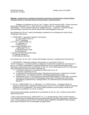 ZP/22/D/SE-AG/08 SE-AG.341-72-19/08 Czeladź, dnia 14.05.2008r Dotyczy: postępowania o udzielenie zamówienia publicznego prowadzonego w trybie przetargu nieograniczonego na „Dostawę sprzętu komputerowego i oprogramowania”. Działając na podstawie art. 93 ust.1 pkt. 1ustawy z dnia 29 stycznia 2004 r. Prawo zamówień publicznych (tekst jedn. Dz. U. z 2007 Nr 223, poz.1655 z póź. zm. ) zwanej dalej ustawą Zamawiający – Gmina Czeladź uniewaŜnia postępowanie j/w - „Zadanie A – Dostawa sprzętu komputerowego” poniewaŜ nie złoŜono Ŝadnej oferty niepodlegajacej odrzuceniu. Na podstawie art. 92 ust.1 ustawy Zamawiający zawiadamia Ŝe w postępowaniu oferty złoŜyli następujący Wykonawcy: 1. „TOPADVERT”- Agnieszka Czaplicka, WoroŜyńska Ul. Jana Pawła II 35 lok. 9 05-077 Warszawa 2. P.P.H.U. „OWISYSTEM” S.C. Ul. Piekarska 1-3 41-506 Chorzów 3. Biuro Usług Informatycznych „ASPO-SOFT” S. C. Ul. Roździeńskiego 188 B 40-203 Katowice 4. Centrum Szkolenia Komputerowego Ul. Królowej Jadwigi 23 41-300 Dąbrowa Górnicza Na podstawie art. 24 ust. 2 pkt. 3 ustawy Zamawiający wykluczył z postępowania Wykonawców: 1. „TOPADVERT”- Agnieszka Czaplicka, WoroŜyńska, ul. Jana Pawła II 35 lok. 9 05-077 Warszawa – do złoŜonej oferty nie dołączono dokumentów i oświadczeń wymienionych w pkt. 6.5; 6.6 SIWZ. Zamawiający nie wezwał Wykonawcy do ich uzupełnienia poniewaŜ oferta Wykonawcy została odrzucona na podstawie art. 89. ust.1 pkt.2 ustawy gdyŜ jej treść nie odpowiada treści specyfikacji istotnych warunków zamówienia tj. 1) w formularzu ofertowym nie wypełnione zostało pole w poz. 24 w kolumnie „gwarancja (m-ce)”. 2) w załączniku do formularza ofertowego „Oświadczenie wykonawcy o oferowanym sprzęcie komputerowym” nie wypełniono kolumn „Parametry oferowanego sprzętu”. 3) zaoferowana w poz. 21 karta graficzna model SAPPHIRE Radeom X 1650 PRO nie spełnia wymagań określonych przez Zamawiającego dotyczących obsługiwanych standardów. Zamawiający oczekiwał karty z obsługą Directx 10 a oferowana przez oferenta posiada Directx 9. 2. P.P.H.U. „OWISYSTEM” S.C. ul. Piekarska 1-3, 41-506 Chorzów - do złoŜonej oferty nie dołączono dokumentów i oświadczeń wymienionych w pkt. 6.3; 6.5; 6.6 SIWZ, pomimo wysłanego wezwania do ich uzupełnienia. Tym samym ofertę wykonawcy wykluczonego uznaje się za odrzuconą na podstawie art. 24 ust. 4 ustawy. Jednocześnie Zamawiający zawiadamia Ŝe na podstawie art. 89 ust. 1pkt. 2 ustawy odrzucił oferty złoŜone przez firmy: 1. Biuro Usług Informatycznych „ASPO-SOFT” S. C. Ul. Roździeńskiego 188 B, 40-203 Katowice, treść złoŜonej oferty nie odpowiada treści specyfikacji istotnych warunków zamówienia, zaoferowana w poz. 21karta graficzna model: PALIT XpertVision Radon X2600Pro (AE/260PS+HD21) posiada jedno złącze zewnętrze DVI a Zamawiający wymagał dwóch. 2. Centrum Szkolenia Komputerowego, ul. Królowej Jadwigi 23, 41-300 Dąbrowa Górnicza - treść złoŜonej oferty nie odpowiada treści specyfikacji istotnych warunków zamówienia, zaoferowana w poz. 21karta graficzna model: PALIT XpertVision Radon X2600Pro (AE/260PS+HD21) posiada jedno złącze zewnętrze DVI a Zamawiający wymagał dwóch. ZASTĘPCA BURMISTRZA mgr Anna Ślagórska
