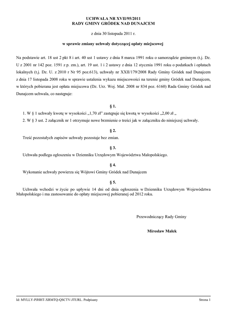 UCHWAŁA NR XVII/95/2011 RADY GMINY GRÓDEK NAD DUNAJCEM z dnia 30 listopada 2011 r. w sprawie zmiany uchwały dotyczącej opłaty miejscowej Na podstawie art. 18 ust 2 pkt 8 i art. 40 ust 1 ustawy z dnia 8 marca 1991 roku o samorządzie gminnym (t.j. Dz. U z 2001 nr 142 poz. 1591 z p. zm.), art. 19 ust. 1 i 2 ustawy z dnia 12 stycznia 1991 roku o podatkach i opłatach lokalnych (t.j. Dz. U. z 2010 r Nr 95 poz.613), uchwały nr XXII/179/2008 Rady Gminy Gródek nad Dunajcem z dnia 17 listopada 2008 roku w sprawie ustalenia wykazu miejscowości na terenie gminy Gródek nad Dunajcem, w których pobierana jest opłata miejscowa (Dz. Urz. Woj. Mał. 2008 nr 834 poz. 6160) Rada Gminy Gródek nad Dunajcem uchwala, co następuje: § 1. 1. W § 1 uchwały kwotę w wysokości „1,70 zł” zastępuje się kwotą w wysokości „2,00 zł „ 2. W § 3 ust. 2 załącznik nr 1 otrzymuje nowe brzmienie o treści jak w załączniku do niniejszej uchwały. § 2. Treść pozostałych zapisów uchwały pozostaje bez zmian. § 3. Uchwała podlega ogłoszeniu w Dzienniku Urzędowym Województwa Małopolskiego. § 4. Wykonanie uchwały powierza się Wójtowi Gminy Gródek nad Dunajcem § 5. Uchwała wchodzi w życie po upływie 14 dni od dnia ogłoszenia w Dzienniku Urzędowym Województwa Małopolskiego i ma zastosowanie do opłaty miejscowej pobieranej od 2012 roku. Przewodniczący Rady Gminy Mirosław Małek Id: MYLLY-PJHHT-XRMTQ-QSCTV-JTURL. Podpisany Strona 1 Załącznik do Uchwały Nr XVII/95/2011 Rady Gminy Gródek nad Dunajcem z dnia 30 listopada 2011 r. WYKAZ INKASENTÓW OPŁAT MIEJSCOWEJ 1. Nowobilska Małgorzata Bartkowa- Posadowa 216; 33-318 Gródek nad Dunajcem - wynajem domków letniskowych, kwater 2. Nowobilski Janusz Bartkowa -Posadowa 216; 33-318 Gródek nad Dunajcem - pole namiotowe 3. Nowobilski Jerzy Bartkowa- Posadowa 48; 33-318 Gródek nad Dunajcem- wynajem domków letniskowych 4. Osika –Bocheńska Joanna Bartkowa -Posadowa 18; 33-318 Gródek nad Dunajcem- gospodarstwo agroturystyczne-wynajem pokoi 5. Ośrodek Doskonalenia Kadr SW „BARTEK” Bartkowa Posadowa 207 33-318 Gródek nad Dunajcem 6. REST sp. z o.o Bartkowa –Posadowa 264 33-318 Gródek nad Dunajcem 7. Gargas Tadeusz Bartkowa –Posadowa 41;33-318 Gródek nad Dunajcem – wynajem domków letniskowych 8. Kobylańska Elżbieta Gródek nad Dunajcem 1; 33-318-Gródek nad Dunajcem -gospodarstwo agroturystyczne- wynajem pokoi 9. Centrum Kształcenia i Wychowania Ochotniczych Hufców 33-100 Tarnów ul. Mościckiego 27 Pracy w Tarnowie adres koresp.Filia Gródek nad Dunajcem 157 10. GND sp. z o.o SKA z siedzibą w Krakowie 31-101 Kraków Plac na Groblach 21 11. Jankowska Anna Bartkowa- Posadowa 282 Firma Handlowo Usługowa „JAKA” 33-318 Gródek nad Dunajcem- pole kempingowe, obiekty noclegowe 12. W.Investment sp. z o.o Pensjonat “Cztery Pliszki” 31-056 Kraków Plac Nowy 8 Gródek nad Dunajcem 53 13. Biernacki Józef Gródek nad Dunajcem 6; 33-318 Gródek nad Dunajcem – wynajem pokoi gościnnych 14. ARKA Centrum Formacyjno-Rekolekcyjne Diecezji Tarnowskiej Ośrodek Wypoczynkowo -Szkoleniowy Gródek nad Dunajcem 153 ;33-318 Gródek nad Dunajcem 15. JAN-WAR sp. z o.o Tęgoborze 121; 33-318 Gródek nad Dunajcem 134- wynajem pokoi gościnnych 16. Ośrodek Sportowo Turystyczny -Polski Związek Wędkarski –Koło Kolejarz Lipie 31-054 Kraków ul. Lubicz 12 A 17. Wolak Sabina Podole -Górowa 14 ;33-318 Gródek nad Dunajcem- wynajem pokoi gościnnych 18. Mikulska Jolanta Podole-Górowa 122;33-318 Gródek nad Dunajcem- wynajem pokoi gościnnych 19. Kwaśniewska Maria Roztoka-Brzeziny 81;33-316 Rożnów -gospodarstwo agroturystyczne, wynajem pokoi 20. Chochlińska Elżbieta Roztoka-Brzeziny 185; 33-316 Rożnów – gospodarstwo agroturystyczne, wynajem pokoi 21. Ośrodek Szkoleniowo-Wypoczynkowy Rożnów sp. z o.o. Rożnów 460; 33-316 Rożnów 22. ACTION S.A.- Ośrodek Szkoleniowo Wypoczynkowy w Rożnowie Rożnów; 01-248 Warszawa ul. Jana Kazimierza 46/54 23. Bazela Małgorzata Rożnów 5 a; 33-316 Rożnów-gospodarstwo agroturystyczne, wynajem miejsc noclegowych 24. Bazela Halina Rożnów 5;33-316 Rożnów – wynajem domków letniskowych, pokoi gościnnych 25. Hajduga Mieczysław Rożnów 418; 33-316 Rożnów –gosp. agroturystyczne- wynajem pokoi Id: MYLLY-PJHHT-XRMTQ-QSCTV-JTURL. Podpisany Strona 1 26. Wołowicz Augustyn Rożnów 360 ; 33-316 Rożnów-gospodarstwo agroturystyczne, wynajem pokoi 27. Bochenek Dawid Gródek nad Dunajcem 87;33-318 Gródek nad Dunajcem – wynajem pokoi gościnnych 28. Sarna Witold Bartkowa-Posadowa 134;33-318 Gródek nad Dunajcem –wynajem domków letniskowych 29. Ziomek Bożena Rożnów 437,33-316 Rożnów-gospodarstwo agroturystycze 30. Hajduk Stanisław Rożnów 87;33-316 Rożnów - gospodarstwo agroturystyczne –wynajem pokoi 31. Winiarski Michał Roztoka-Brzeziny 168; 33-316 Rożnów-gospodarstwo agroturystycznewynajem pokoi 32. Hajduk Janina Rożnów 14; 33-316 Rożnów gospodarstwo agroturystyczne – wynajem pokoi gościnnych 33. Sęk Bogusława Przydonica 108,33-318 Gródek nad Dunajcem -gospodarstwo agroturystyczne-wynajem pokoi 34. Witowski Stanisław Rożnów 456 ;33-316 Rożnów-gospodarstwo agroturystyczne- wynajem pokoi 35. Tobiasz Alicja Rożnów 23; 33-316 Rożnów- wynajem pokoi 36. Legutko Jan Roztoka-Brzeziny 154,33-316 Rożnów-gospodarstwo agroturystyczne –wynajem pokoi 37. Tobiasz Józef Gródek nad Dunajcem 156 – wynajem pokoi 38. Kwaśniewski Jerzy Rożnów 358; 33-316 Rożnów-gospodarstwo agroturystyczne- wynajem kwater 39. Szabla Marek Rożnów 585; 33-316 Rożnów-gospodarstwo agroturystyczne -wynajem kwater 40. Kobajło Elżbieta Bartkowa-Posadowa 126;33-318 Gródek nad Dunajcem- gospodarstwo agroturystyczne-wynajem pokoi 41. Jurczyk Maria Rożnów 566; 33-316 Rożnów- wynajem pokoi gościnnych 42. Wolak Jolanta Podole Górowa 162;33-318 Gródek nad Dunajcem - wynajem pokoi gościnnych 43. Krawczyk Paweł Gródek nad Dunajcem 2;33-318 Gródek nad Dunajcem-