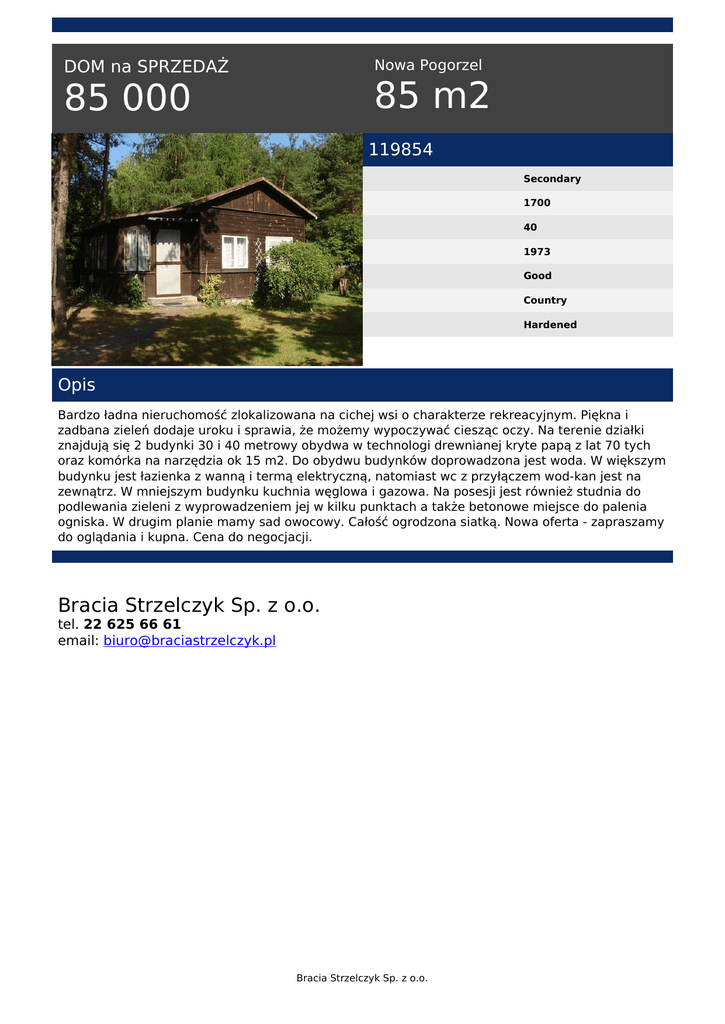 Nowa Pogorzel DOM na SPRZEDAŻ 85 m2 85 000 119854 Secondary 1700 40 1973 Good Country Hardened Opis Bardzo ładna nieruchomość zlokalizowana na cichej wsi o charakterze rekreacyjnym. Piękna i zadbana zieleń dodaje uroku i sprawia, że możemy wypoczywać ciesząc oczy. Na terenie działki znajdują się 2 budynki 30 i 40 metrowy obydwa w technologi drewnianej kryte papą z lat 70 tych oraz komórka na narzędzia ok 15 m2. Do obydwu budynków doprowadzona jest woda. W większym budynku jest łazienka z wanną i termą elektryczną, natomiast wc z przyłączem wod-kan jest na zewnątrz. W mniejszym budynku kuchnia węglowa i gazowa. Na posesji jest również studnia do podlewania zieleni z wyprowadzeniem jej w kilku punktach a także betonowe miejsce do palenia ogniska. W drugim planie mamy sad owocowy. Całość ogrodzona siatką. Nowa oferta - zapraszamy do oglądania i kupna. Cena do negocjacji. Bracia Strzelczyk Sp. z o.o. tel. 22 625 66 61 email: [email protected] Bracia Strzelczyk Sp. z o.o. Powered by TCPDF (www.tcpdf.org)
