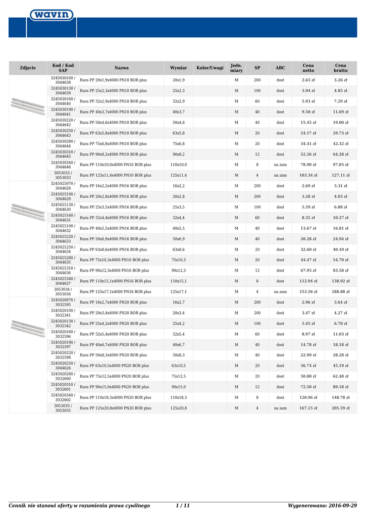Zdjęcie Kod / Kod SAP Nazwa Wymiar Kolor/Uwagi Jedn. miary SP ABC Cena netto Cena brutto 3245030100 / 3044638 Rura PP 20x1,9x4000 PN10 BOR plus 20x1,9 M 200 dost 2.65 zł 3.26 zł 3245030130 / 3044639 Rura PP 25x2,3x4000 PN10 BOR plus 25x2,3 M 100 dost 3.94 zł 4.85 zł 3245030160 / 3044640 Rura PP 32x2,9x4000 PN10 BOR plus 32x2,9 M 60 dost 5.93 zł 7.29 zł 3245030190 / 3044641 Rura PP 40x3,7x4000 PN10 BOR plus 40x3,7 M 40 dost 9.50 zł 11.69 zł 3245030220 / 3044642 Rura PP 50x4,6x4000 PN10 BOR plus 50x4,6 M 40 dost 15.45 zł 19.00 zł 3245030250 / 3044643 Rura PP 63x5,8x4000 PN10 BOR plus 63x5,8 M 20 dost 24.17 zł 29.73 zł 3245030280 / 3044644 Rura PP 75x6,8x4000 PN10 BOR plus 75x6,8 M 20 dost 34.41 zł 42.32 zł 3245030310 / 3044645 Rura PP 90x8,2x4000 PN10 BOR plus 90x8,2 M 12 dost 52.26 zł 64.28 zł 3245030340 / 3044646 Rura PP 110x10,0x4000 PN10 BOR plus 110x10,0 M 8 na zam 78.90 zł 97.05 zł 3053033 / 3053033 Rura PP 125x11,4x4000 PN10 BOR plus 125x11,4 M 4 na zam 103.34 zł 127.11 zł 3245025070 / 3044628 Rura PP 16x2,2x4000 PN16 BOR plus 16x2,2 M 200 dost 2.69 zł 3.31 zł 3245025100 / 3044629 Rura PP 20x2,8x4000 PN16 BOR plus 20x2,8 M 200 dost 3.28 zł 4.03 zł 3245025130 / 3044630 Rura PP 25x3,5x4000 PN16 BOR plus 25x3,5 M 100 dost 5.59 zł 6.88 zł 3245025160 / 3044631 Rura PP 32x4,4x4000 PN16 BOR plus 32x4,4 M 60 dost 8.35 zł 10.27 zł 3245025190 / 3044632 Rura PP 40x5,5x4000 PN16 BOR plus 40x5,5 M 40 dost 13.67 zł 16.81 zł 3245025220 / 3044633 Rura PP 50x6,9x4000 PN16 BOR plus 50x6,9 M 40 dost 20.28 zł 24.94 zł 3245025250 / 3044634 Rura PP 63x8,6x4000 PN16 BOR plus 63x8,6 M 20 dost 32.60 zł 40.10 zł 3245025280 / 3044635 Rura PP 75x10,3x4000 PN16 BOR plus 75x10,3 M 20 dost 44.47 zł 54.70 zł 3245025310 / 3044636 Rura PP 90x12,3x4000 PN16 BOR plus 90x12,3 M 12 dost 67.95 zł 83.58 zł 3245025340 / 3044637 Rura PP 110x15,1x4000 PN16 BOR plus 110x15,1 M 8 dost 112.94 zł 138.92 zł 3053034 / 3053034 Rura PP 125x17,1x4000 PN16 BOR plus 125x17,1 M 4 na zam 153.56 zł 188.88 zł 3245020070 / 3032595 Rura PP 16x2,7x4000 PN20 BOR plus 16x2,7 M 200 dost 2.96 zł 3.64 zł 3245020100 / 3032341 Rura PP 20x3,4x4000 PN20 BOR plus 20x3,4 M 200 dost 3.47 zł 4.27 zł 3245020130 / 3032342 Rura PP 25x4,2x4000 PN20 BOR plus 25x4,2 M 100 dost 5.45 zł 6.70 zł 3245020160 / 3032596 Rura PP 32x5,4x4000 PN20 BOR plus 32x5,4 M 60 dost 8.97 zł 11.03 zł 3245020190 / 3032597 Rura PP 40x6,7x4000 PN20 BOR plus 40x6,7 M 40 dost 14.78 zł 18.18 zł 3245020220 / 3032598 Rura PP 50x8,3x4000 PN20 BOR plus 50x8,3 M 40 dost 22.99 zł 28.28 zł 3245020250 / 3044626 Rura PP 63x10,5x4000 PN20 BOR plus 63x10,5 M 20 dost 36.74 zł 45.19 zł 3245020280 / 3032600 Rura PP 75x12,5x4000 PN20 BOR plus 75x12,5 M 20 dost 50.80 zł 62.48 zł 3245020310 / 3032601 Rura PP 90x15,0x4000 PN20 BOR plus 90x15,0 M 12 dost 72.50 zł 89.18 zł 3245020340 / 3032602 Rura PP 110x18,3x4000 PN20 BOR plus 110x18,3 M 8 dost 120.96 zł 148.78 zł 3053035 / 3053035 Rura PP 125x20,8x4000 PN20 BOR plus 125x20,8 M 4 na zam 167.15 zł 205.59 zł Cennik nie stanowi oferty w rozumieniu prawa cywilnego 1 / 11 Wygenerowano: 2016-09-29 Zdjęcie Kod / Kod SAP Nazwa Wymiar Kolor/Uwagi Jedn. miary SP ABC Cena netto Cena brutto 3245050072 / 3031975 Rura PP stabi 16x2,7x4000 PN25 BOR plus 16x2,7 M 100 Do wyczerpania zapas 7.44 zł 9.15 zł 3245050102 / 3044647 Rura PP stabi 20x3,4x4000 PN25 BOR plus 20x3,4 M 100 Do wyczerpania zapas 8.57 zł 10.54 zł 3245050132 / 3044651 Rura PP stabi 25x4,2x4000 PN25 BOR plus 25x4,2 M 100 Do wyczerpania zapas 12.47 zł 15.34 zł 3245050162 / 3044653 Rura PP stabi 32x5,4x4000 PN25 BOR plus 32x5,4 M 60 Do wyczerpania zapas 17.88 zł 21.99 zł 3245050192 / 3044655 Rura PP stabi 40x6,7x4000 PN25 BOR plus 40x6,7 M 40 Do wyczerpania zapas 26.82 zł 32.99 zł 3245050222 / 3044657 Rura PP stabi 50x8,3x4000 PN25 BOR plus 50x8,3 M 20 Do wyczerpania zapas 38.04 zł 46.79 zł 3245050252 / 3044659 Rura PP stabi 63x10,5x4000 PN25 BOR plus 63x10,5 M 16 Do wyczerpania zapas 54.89 zł 67.51 zł 3245050282 / 3044660 Rura PP stabi 75x12,5x4000 PN25 BOR plus 75x12,5 M 12 Do wyczerpania zapas 84.06 zł 103.39 zł 3245050312 / 3044661 Rura PP stabi 90x15,0x4000 PN25 BOR plus 90x15,0 M 8 Do wyczerpania zapas 140.59 zł 172.93 zł 3245050342 / 3044662 Rura PP stabi 110x18,3x4000 PN25 BORplus 110x18,3 M 8 Do wyczerpania zapas 217.54 zł 267.57 zł 8.03 zł / 3070133 Nowość - Rura PP stabi plus 16x2,2x4000 16x2,2 M 30 dost 6.53 zł / 3070134 Nowość - Rura PP stabi plus 20x2,8x4000 20x2,8 M 20 dost 7.53 zł 9.26 zł / 3070135 Nowość - Rura PP stabi plus 25x3,5x4000 25x3,5 M 15 dost 11.40 zł 14.02 zł / 3070136 Nowość - Rura PP stabi plus 32x4,4x4000 32x4,4 M 10 dost 16.43 zł 20.21 zł / 3070137 Nowość - Rura PP stabi plus 40x5,5x4000 40x5,5 M 5 dost 24.24 zł 29.82 zł / 3070138 Nowość - Rura PP stabi plus 50x6,9x4000 50x6,9 M 4 dost 35.62 zł 43.81 zł / 3070139 Nowość - Rura PP stabi plus 63x8,6x4000 63x8,6 M 2 dost 51.16 zł 62.93 zł / 3070140 Nowość - Rura PP stabi plus 75x8,4x4000 75x8,4 M 2 dost 79.02 zł 97.19 zł / 3070141 Nowość - Rura PP stabi plus 90x10,1x4000 90x10,1 M 1 dost 135.02 zł 166.07 zł / 3070142 Nowość - Rura PP stabi plus 110x12,3x4000 110x12,3 M 1 dost 207.32 zł 255.00 zł 3245060020 / 3044670 Nowość - Rura Ultra Bor Plus 20x2,8x4000 20x2,8 M 100 dost 7.77 zł 9.56 zł 3245060025 / 3044671 Nowość - Rura Ultra Bor Plus 25x3,5x4000 25x3,5 M 100 dost 11.71 zł 14.40 zł 3245060032 / 3044672 Nowość - Rura Ultra Bor Plus 32x4,4x4000 32x4,4 M 60 dost 16.79 zł 20.65 zł 3245060040 / 3044673 Nowość - Rura Ultra Bor Plus 40x5,5x4000 40x5,5 M 40 dost 25.17 zł 30.96 zł 3245060050 / 3044674 Nowość - Rura Ultra Bor Plus 50x6,9x4000 50x6,9 M 20 dost 36.57 zł 44.98 zł 3245060063 / 3044675 Nowość - Rura Ultra Bor Plus 63x8,6x4000 63x8,6 M 16 dost 54.86 zł 67.48 zł 3245060075 / 3044676 Nowość - Rura Ultra Bor Plus 75x8,4x4000 75x8,4 M 12 dost 80.82 zł 99.41 zł 3245060090 / 304