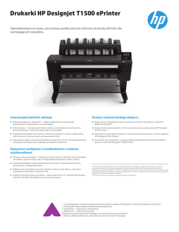 Drukarki HP Designjet T1500 ePrinter Zaprojektowana na nowo, dwurolowa, podłączona do Internetu drukarka ePrinter dla wymagających zespołów. Innowacyjny komfort obsługi. Drukuj z niemal każdego miejsca . ● Eliminacja bałaganu z wydrukami — płaskie, posortowane wydruki dzięki zintegrowanemu odbiornikowi z tacą układającą. ● Drukuj niemal z dowolnego miejsca za pomocą smartfona lub tabletu z systemem Apple® lub Android™1. ● Pełna kontrola — monitorowanie rolek nośników, wyświetlanie stanu drukarki na ekranie dotykowym i śledzenie zadań podczas drukowania. ● Dostęp i drukowanie projektów z chmury spoza biura przy użyciu aplikacji HP Designjet ePrint & Share 1. ● Ładowanie rolek papieru bez wysiłku, nawet bez wstawania z krzesła, z ładowaniem rolki od przodu i automatycznym wyrównywaniem rolki. ● Automatyczny zapis kopii projektów w chmurze podczas drukowania z poziomu aplikacji HP Designjet ePrint & Share 1. ● Oszczędność miejsca za pomocą niewielkiej drukarki 914 mm (36 cali) zaprojektowanej z płaską powierzchnią w celu szybkiego sprawdzania wydruków. ● Drukowanie bez sterowników z pamięci USB lub bezpośrednie przesyłanie projektów pocztą e-mail do HP Designjet T1500 ePrinter 1. 1 Najwyższa wydajność w środowiskach z wieloma użytkownikami. ● Skrócenie czasu przestojów — drukowanie wielu zadań na nośnikach różnych rodzajów i formatów z użyciem dwóch rolek i inteligentnego przełączania między rolkami. ● Zarządzanie kolejkami zadań, śledzenie kosztów druku, drukowanie obrazów bez obramowania2 i podgląd wydruków. ● Głęboka czerń, prawdziwie neutralne odcienie szarości i żywe kolory z sześcioma oryginalnymi atramentami i głowicami HP. ● Szybkie drukowanie złożonych plików — jeden wydruk A1 w 21 sekund dzięki dyskowi twardemu 320 GB i równoległemu przetwarzaniu danych. 1 Wymaga konta HP Designjet ePrint & Share, połączenia drukarki z Internetem i podłączenia urządzenia z możliwością korzystania z Internetu. Do korzystania z aplikacji mobilnej HP Designjet ePrint & Share wymagane jest kompatybilne urządzenie z systemem Apple® iOS lub Android™ oraz połączenie z Internetem. Mogą zostać naliczone opłaty za przesył danych lub nawiązanie połączenia. Prędkości drukowania mogą być różne. 2 GB tymczasowego miejsca na konto. Więcej informacji jest dostępnych na stronie hp.com/go/eprintandshare. 2 Do druku obrazów bez marginesów wymagany jest papier fotograficzny. 1. Z zainstalowanym oprogramowaniem Aurasma przejdź do kanału HP Designjet na stronie http://auras.ma/s/ke25m 2. W przypadku braku oprogramowania Aurasma pobierz je: a. Google Play — http://auras.ma/s/android b. Apple Store — http://auras.ma/s/ios Następnie przejdź do kanału HP Designjet na stronie http://auras.ma/s/ke25m 3. Otwórz aplikację i kliknij obraz, aby obejrzeć wideo na temat HP Designjet Drukarki HP Designjet T1500 ePrinter Dane techniczne Drukowanie Zawartość opakowania Rysunki liniowe 21 s/str., 120 wydruków A1 na godzinę Rozdzielczość druku Maks. rozdzielczość optymalizowana 2400x1200 dpi z rozdzielczości wejściowej 1200x1200 dpi z optymalizacją dla wybranego papieru fotograficznego Marginesy (górny x dolny x lewy x prawy) Rolka: 5 x 5 x 5 x 5 mm (bez marginesu na papierze fotograficznym) CR356A HP Designjet T1500 ePrinter 914 mm (36 cali); głowica drukująca; wkłady atramentowe; taca układająca; podstawa drukarki; osie na role papieru; skrócona instrukcja obsługi; plakat instalacyjny; oprogramowanie startowe; kabel zasilający CR357A HP Designjet T1500 PostScript ePrinter 914 mm (36 cali); głowica drukująca; wkłady atramentowe; taca układająca; podstawa drukarki; oś na rolę papieru; skrócona instrukcja obsługi; plakat instalacyjny; oprogramowanie startowe; kabel zasilający Arkusz: 5 x 22 x 5 x 5 mm Technologia Technologia termiczna HP Inkjet Typy atramentów Barwnikowe (C, G, M, pK, Y); pigmentowe (mK) Kolory atramentu 6 (błękitny, szary, purpurowy, czarny matowy, czarny fotograficzny, żółty) Objętość kropli atramentu 6 pl (C, M, Y, G, pK); 9 pl (mK) Pojemność Wkład atramentowy HP 727: błękitny, szary, purpurowy, czarny matowy, czarny fotograficzny, żółty (130 ml); czarny matowy (69 ml); błękitny, szary, purpurowy, czarny fotograficzny, żółty (40 ml) Wymiary (sz. x gł. x wys.) Drukarka 1399 x 693 x 950 mm W opakowaniu 1502 x 759 x 775 mm Waga Drukarka 88 kg W opakowaniu 116,5 kg Ilość dysz głowicy drukującej 9632 Zużycie energii Głowice drukujące 1 (błękitny, szary, purpurowy, czarny matowy, czarny fotograficzny, żółty) Maksymalnie Prędkość druku 120 wydruków A1 na godzinę Dokładność linii +/- 0.1% < 120 W (drukowanie); < 260 W (maks.); < 4 W / < 7 W z wbudowanym rozwiązaniem Digital Front End (tryb uśpienia); 0,1 W (automatyczne wyłączenie); 0 W (wyłączenie wyłącznikiem głównym) Minimalna grubość linii 0,02 mm (adresowalne przez HP-GL/2) Zasilanie Automatyczne rozpoznawanie napięcia wejściowego: 100-240 V AC (+/- 10%), 50/60 Hz (+/- 3 Hz), maks. 4,2 A (prąd szczytowy) Gwarantowana min szerokość wiersza 0,07 mm (ISO/IEC 13660:2001(E)) Maksymalna długość nośnika 91 m Bezpieczeństwo UE (zgodność z dyrektywą LVD i normą EN60950-1); GOST (Rosja) Maksymalna waga nośnika 11,9 kg Elektromagnetyczne Zgodność z wymaganiami klasy B: Dyrektywa EMC (UE) Maks. gęstość optyczna Maks. gęstość optyczna czerni 2,15 (min. wartość L* — 6) Ochrona środowiska ENERGY STAR®; WEEE; UE RoHS; REACH; EuP; FEMP ENERGY STAR Tak Nośnik Wejście: podawanie dwóch rolek z automatycznym ładowaniem; inteligentne przełączanie między rolkami; podawanie arkuszy; Wyjście: wbudowany odbiornik z tacą układającą (od A4 do A0, maksymalna pojemność 50 A1-size); kosz; automatyczna obcinarka Obsługa Papier typu bond i powlekany (bond, powlekany, powlekany o wysokiej gramaturze, papier o bardzo wys