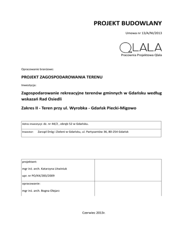 PROJEKT BUDOWLANY Umowa nr 13/A/NI/2013 Pracownia Projektowa Qlala Opracowanie branżowe: PROJEKT ZAGOSPODAROWANIA TERENU Inwestycja: Zagospodarowanie rekreacyjne terenów gminnych w Gdańsku według wskazań Rad Osiedli Zakres II - Teren przy ul. Wyrobka - Gdańsk Piecki-Migowo Adres inwestycji: dz. nr 44/2 , obręb 52 w Gdańsku. Inwestor: Zarząd Dróg i Zieleni w Gdańsku, ul. Partyzantów 36, 80-254 Gdańsk projektant: mgr inż. arch. Katarzyna Litwiniuk upr. nr PO/KK/283/2009 opracowanie: mgr inż. arch. Bogna Olejarz Czerwiec 2013r. Pracownia projektowa Qlala- Umowa nr 13/A/NI/2013 Zagospodarowanie rekreacyjne terenów gminnych w Gdańsku według wskazań Rad Osiedli Zakres II - Teren przy ul. Wyrobka – Gdańsk Piecki-Migowo I. OŚWIADCZENIE PROJEKTANTA • uprawnienia i wpis do izby II. PROJEKT ZAGOSPODAROWANIA TERENU - OPIS TECHNICZNY 1.0. Podstawa opracowania 2.0. Cel i zakres opracowania 3.0. Stan istniejący zagospodarowania terenu 3.1 Przedmiot opracowania 3.2 Opis terenu 3.3 Charakterystyczne dane terenu 3.4 Inwentaryzacja zieleni 4.0. Projektowane zagospodarowanie terenu 4.1 Układ ścieżek, nawierzchnie 4.2. Zieleń 4.3. Podział funkcjonalny terenu 4.3.1. Plac zabaw dzieci do lat 5 4.3.2. Plac zabaw dzieci starszych 4.3.3. Strefa rekreacyjna – siłownia zewnętrzna 4.3.4. Strefa aktywnego wypoczynku 4.4. Elementy małej architektury 5.0. Bilans terenu 6.0. Wpływ inwestycji na środowisko 7.0. Uwagi końcowe CZĘŚĆ RYSUNKOWA Nr rys. Tytuł rysunku skala 1 Projekt zagospodarowania terenu 1:500 2 Istniejące zagospodarowanie terenu 1:500 KT_1 - KT_4 Elementy małej architektury - Pracownia projektowa Qlala- Umowa nr 13/A/NI/2013 Zagospodarowanie rekreacyjne terenów gminnych w Gdańsku według wskazań Rad Osiedli Zakres II - Teren przy ul. Wyrobka – Gdańsk Piecki-Migowo I. OŚWIADCZENIE PROJEKTANTA Zgodnie z art. 20 ust. 4 Ustawy z dnia 7 lipca 1994 r. Prawo Budowlane (Dz. U. Nr 243, poz. 1623, z dnia 12 listopada 2010 r. z późniejszymi zmianami) oświadczam, że projekt budowlany: ZAGOSPODAROWANIE REKREACYJNE TERENÓW GMINNYCH W GDAŃSKU WEDŁUG WSKAZAŃ RAD OSIEDLI ZAKRES II – TEREN PRZY UL.WYROBKA – GDAŃSK MORENA został sporządzony zgodnie z obowiązującymi przepisami oraz zasadami wiedzy technicznej i jest kompletny w rozumieniu Ustawy Prawo Budowlane oraz Rozporządzenia Ministra Transportu, Budownictwa i Gospodarki Morskiej z dnia 25 kwietnia 2012 r. w sprawie szczegółowego zakresu i formy projektu budowlanego (Dz. U. 2012, poz. 462 z późniejszymi zmianami) mgr inż. arch. Katarzyna Litwiniuk upr. nr PO/KK/283/2009 …............................ podpis projektanta Pracownia projektowa Qlala- Umowa nr 13/A/NI/2013 Zagospodarowanie rekreacyjne terenów gminnych w Gdańsku według wskazań Rad Osiedli Zakres II - Teren przy ul. Wyrobka – Gdańsk Piecki-Migowo II. PROJEKT ZAGOSPODAROWANIA TERENU - OPIS TECHNICZNY 1.0. Podstawa opracowania • Umowa zawarta pomiędzy Zarządem Dróg i Zieleni w Gdańsku, a Pracownią projektową Qlala w Gdańsku, ul. Kościuszki 9a/3. • Wytyczne projektowe Rady Osiedla Gdańsk Piecki-Migowo • Mapa do celów projektowych w skali 1: 500 aktualna na dzień 24.12.2012 r. 2.0. Cel i zakres opracowania Inwestycja zlokalizowana jest przy ul. Wyrobka w Gdańsku w bezpośrednim otoczeniu z terenem mieszkalnym oraz placem nauki jazdy na rowerze. Teren na wyniesieniu pośród okalających go budynków wielorodzinnych z otwarciem w południowo-zachodniej części na dolne Migowo. Całość założenia ma charakter miejski. Celem projektu jest modernizacja wytypowanego przez Radę Osiedla istniejącego placu zabaw wraz z przeznaczeniem jego części na teren rekreacyjny wyposażony w ścieżkę wysiłkową fitness. 3.0. Stan istniejący zagospodarowania terenu 3.1 Przedmiot opracowania Przedmiotem opracowania jest: - usunięcie urządzeń placu zabaw nie spełniających wymagań bezpieczeństwa; - stworzenie terenu rekreacyjnego wyposażonego w elementy fitness siłowni zewnętrznej; - modernizacja istniejącego placu zabaw z podziałem na część dla dzieci do lat 5 oraz dla dzieci starszych. Wykaz urządzeń zabawowych w rozdziale 5.0; - wzbogacenie terenu o boisko do siatkówki; - stworzenie strefy do aktywnego odpoczynku: urządzenia do gry w szachy, strefa piknikowa; - obiekty małej architektury: ławki, kosze na odpadki; - prace drogowe: ścieżki glinowo- żwirowe; - prace pielęgnacyjne zieleni, zazielenianie terenu. 3.2 Opis terenu Przedmiotem opracowania jest teren rekreacyjny położony w północno-zachodniej części dzielnicy PieckiMigowo w Gdańsku. Istniejący plac zabaw znajduje się na szczycie wzgórza morenowego przy ul. Wyrobka. Od strony północnej, południowej i wschodniej sąsiaduje z położoną poniżej placu wielorodzinną zabudową mieszkaniową. Od zachodu otwiera się na skarpę moreny schodzącą do ul. Dolne Migowo w kierunku dzielnicy Matemblewo. Teren wydziela również od północnego-zachodu dawny plac manewrowy do nauki jazdy na rowerze z wytyczonymi betonowymi ścieżkami oraz od południowego zachodu wygrodzony plac do wyprowadzania psów. Głównym elementem opracowania jest otwarty i położony na płaskim wyniesieniu piaszczysty plac zabaw. Część północną okala ścieżka betonowa prowadząca do placu manewrowego a południową ścieżka wykonana z pojedynczych płyt chodnikowych. Dostęp do placu z pobliskich budynków oprócz trawiastych skarp umożliwią 3 biegi betonowych schodów. Główne wejście na teren jest od ul. Wyrobka Na plac można dotrzeć również z ul. Bronisława Czecha. Ponieważ cały obszar jest na wyniesieniu rzędu od 1 do 6m. w stosunku do otaczających go ulic a najbliższe Pracownia projektowa Qlala- Umowa nr 13/A/NI/2013 Zagospodarowanie rekreacyjne terenów gminnych w Gdańsku według wskazań Rad Osiedli Zakres II - Teren przy ul. Wyrobka – Gdańsk Piecki-Migowo zabudowania są w odległości ok. 25m. Charakteryzuje się on silną ekspoz