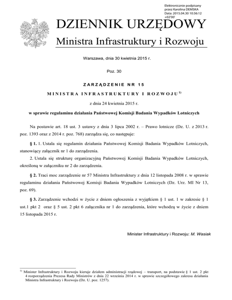 Elektronicznie podpisany przez Karolina DEMSKA Data: 2015.04.30 10:36:12 +02'00' DZIENNIK URZĘDOWY Ministra Infrastruktury i Rozwoju Warszawa, dnia 30 kwietnia 2015 r. Poz. 30 ZARZĄDZENIE NR 15 M I N I S T R A I N F R A S T R U K T U R Y I R O Z W O J U 1) z dnia 24 kwietnia 2015 r. w sprawie regulaminu działania Państwowej Komisji Badania Wypadków Lotniczych Na postawie art. 18 ust. 3 ustawy z dnia 3 lipca 2002 r. – Prawo lotnicze (Dz. U. z 2013 r. poz. 1393 oraz z 2014 r. poz. 768) zarządza się, co następuje: § 1. 1. Ustala się regulamin działania Państwowej Komisji Badania Wypadków Lotniczych, stanowiący załącznik nr 1 do zarządzenia. 2. Ustala się strukturę organizacyjną Państwowej Komisji Badania Wypadków Lotniczych, określoną w załączniku nr 2 do zarządzenia. § 2. Traci moc zarządzenie nr 57 Ministra Infrastruktury z dnia 12 listopada 2008 r. w sprawie regulaminu działania Państwowej Komisji Badania Wypadków Lotniczych (Dz. Urz. MI Nr 13, poz. 69). § 3. Zarządzenie wchodzi w życie z dniem ogłoszenia z wyjątkiem § 1 ust. 1 w zakresie § 1 ust.1 pkt 2 oraz § 5 ust. 2 pkt 6 załącznika nr 1 do zarządzenia, które wchodzą w życie z dniem 15 listopada 2015 r. Minister Infrastruktury i Rozwoju: M. Wasiak 1) Minister Infrastruktury i Rozwoju kieruje działem administracji rządowej – transport, na podstawie § 1 ust. 2 pkt 4 rozporządzenia Prezesa Rady Ministrów z dnia 22 września 2014 r. w sprawie szczegółowego zakresu działania Ministra Infrastruktury i Rozwoju (Dz. U. poz. 1257). Dziennik Urzędowy Ministra Infrastruktury i Rozwoju –2– Poz. 30 Załączniki do zarządzenia nr 15 Ministra Infrastruktury i Rozwoju z dnia 24 kwietnia 2015 r. Załącznik nr 1 REGULAMIN DZIAŁANIA PAŃSTWOWEJ KOMISJI BADANIA WYPADKÓW LOTNICZYCH Postanowienia ogólne § 1. 1. Państwowa Komisja Badania Wypadków Lotniczych, zwana dalej „Komisją”, wykonuje zadania na podstawie: 1) rozporządzenia Parlamentu Europejskiego i Rady (UE) nr 996/2010 z dnia 20 października 2010 r. w sprawie badania wypadków i incydentów w lotnictwie cywilnym oraz zapobiegania im oraz uchylającego dyrektywę 94/56/WE (Dz. Urz. UE L 295 z 12.11.2010, str. 35, z późn. zm.), zwanego dalej „rozporządzeniem nr 996/2010”; 2) rozporządzenia Parlamentu Europejskiego i Rady (UE) nr 376/2014 z dnia 3 kwietnia 2014 r. w sprawie zgłaszania i analizy zdarzeń w lotnictwie cywilnym oraz podejmowanych w związku z nimi działań następczych, zmiany rozporządzenia Parlamentu Europejskiego i Rady (UE) nr 996/2010 oraz uchylenia dyrektywy 2003/42/WE Parlamentu Europejskiego i Rady i rozporządzeń Komisji (WE) nr 1321/2007 i (WE) nr 1330/2007 (Dz. Urz. UE L 122 z 24.04.2014, str. 18), zwanego dalej „rozporządzeniem nr 376/2014”; 3) ustawy z dnia 3 lipca 2002 r. – Prawo lotnicze (Dz. U. z 2013 r. poz. 1393 oraz z 2014 r. poz. 768), zwanej dalej „ustawą”; 4) aktów wykonawczych do ustawy; 5) Załącznika nr 13 do Konwencji o międzynarodowym lotnictwie cywilnym, ogłoszonego w obwieszczeniu nr 12 Prezesa Urzędu Lotnictwa Cywilnego z dnia 1 czerwca 2012 r. w sprawie ogłoszenia tekstu Załącznika 13 do Konwencji o międzynarodowym lotnictwie cywilnym, sporządzonej w Chicago dnia 7 grudnia 1944 r. (Dz. Urz. ULC poz. 49), zwanego dalej „Załącznikiem nr 13”; 6) niniejszego regulaminu. 2. Komisja stosuje się do porozumień dotyczących współpracy, w szczególności zawartych na podstawie art. 12 ust. 3 rozporządzenia nr 996/2010. 3. Komisja realizuje swoje zadania przy wykorzystaniu przyjętych procedur wewnętrznych Komisji. Dziennik Urzędowy Ministra Infrastruktury i Rozwoju –3– Poz. 30 4. W celu wymiany doświadczeń i podniesienia jakości systemu badania zdarzeń lotniczych oraz stanu bezpieczeństwa w lotnictwie Komisja organizuje szkolenia, konferencje i spotkania. § 2. 1. Działaniami Komisji kieruje Przewodniczący Komisji, zwany dalej „Przewodniczącym”. 2. W razie nieobecności Przewodniczącego działaniami Komisji kieruje wskazany przez niego Zastępca. Jeżeli Zastępcy Przewodniczącego nie zostali wyznaczeni lub są nieobecni, działaniami Komisji kieruje Sekretarz Komisji lub wskazany przez Przewodniczącego Członek Komisji. § 3. 1. Komisja działa poprzez: 1) biuro Komisji z siedzibą w Warszawie, w urzędzie obsługującym ministra właściwego do spraw transportu, zwanym dalej „Ministerstwem”; 2) przedstawicielstwa terenowe Komisji. 2. W przedstawicielstwie terenowym Członek Komisji wykonuje swoje zadania w ramach oddelegowania, o którym mowa w art. 17a ust. 10 ustawy. 3. W uzasadnionych przypadkach Członek Komisji może zostać oddelegowany w miejsce wskazane przez Przewodniczącego, w celu umożliwienia podjęcia natychmiastowych działań związanych z zabezpieczeniem dowodów i informacji niezbędnych do przeprowadzenia badania w przypadku zaistnienia zdarzenia lotniczego. § 4. 1. Do obowiązków Członka Komisji, w tym Przewodniczącego, Zastępców Przewodniczącego, Sekretarza Komisji należą w szczególności: 1) badanie zdarzeń lotniczych; 2) pozostawanie w gotowości do natychmiastowego podjęcia czynności podczas pełnionych dyżurów; 3) uczestniczenie w spotkaniach zespołów badawczych i posiedzeniach Komisji; 4) pełnienie funkcji akredytowanego przedstawiciela na podstawie upoważnienia wydanego przez Przewodniczącego; 5) zapoznawanie się z materiałami krajowymi i zagranicznymi z zakresu badań zdarzeń lotniczych; 6) uczestniczenie w szkoleniach i konferencjach zgodnie z decyzją Przewodniczącego; 7) stosowanie procedur przyjętych w Komisji i zgłaszanie propozycji ich zmian uzasadnionych poprawą jakości prowadzonych badań i działania Komisji. 2. Członek Komisji ma prawo wnioskowania o wykonanie ekspertyz niezbędnych do realizacji powierzonych mu zadań. 3. Członek Komisji ma prawo ubiegać się o finansowanie lub współfinansowanie ze środków przeznaczonych na prowadzenie działalno