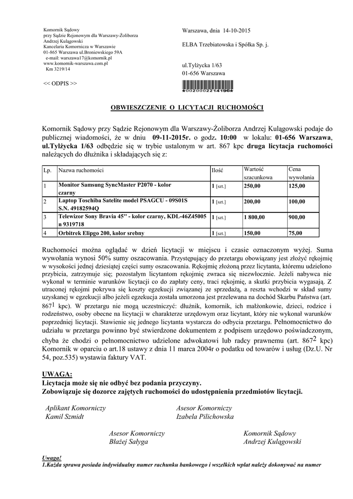 Komornik Sądowy przy Sądzie Rejonowym dla Warszawy-Żoliborza Andrzej Kulągowski Kancelaria Komornicza w Warszawie 01-865 Warszawa ul.Broniewskiego 59A e-mail: [email protected] www.komornik-warszawa.com.pl Km 3219/14 Warszawa, dnia 14-10-2015 << ODPIS >> *0020002214196* ELBA Trzebiatowska i Spółka Sp. j. ul.Tylżycka 1/63 01-656 Warszawa OBWIESZCZENIE O LICYTACJI RUCHOMOŚCI Komornik Sądowy przy Sądzie Rejonowym dla Warszawy-Żoliborza Andrzej Kulągowski podaje do publicznej wiadomości, że w dniu 09-11-2015r. o godz. 10:00 w lokalu: 01-656 Warszawa, ul.Tylżycka 1/63 odbędzie się w trybie ustalonym w art. 867 kpc druga licytacja ruchomości należących do dłużnika i składających się z: 1 [szt.] Wartość szacunkowa 250,00 Cena wywołania 125,00 1 [szt.] 200,00 100,00 1 [szt.] 1 800,00 900,00 1 [szt.] 150,00 75,00 Lp. Nazwa ruchomości Ilość 1 Monitor Samsung SyncMaster P2070 - kolor czarny Laptop Toschiba Satelite model PSAGCU - 09S01S S.N. 49182594Q Telewizor Sony Bravia 45'' - kolor czarny, KDL-46Z45005 n 9319718 Orbitrek Elipgo 200, kolor srebny 2 3 4 Ruchomości można oglądać w dzień licytacji w miejscu i czasie oznaczonym wyżej. Suma wywołania wynosi 50% sumy oszacowania. Przystępujący do przetargu obowiązany jest złożyć rękojmię w wysokości jednej dziesiątej części sumy oszacowania. Rękojmię złożoną przez licytanta, któremu udzielono przybicia, zatrzymuje się; pozostałym licytantom rękojmię zwraca się niezwłocznie. Jeżeli nabywca nie wykonał w terminie warunków licytacji co do zapłaty ceny, traci rękojmię, a skutki przybicia wygasają. Z utraconej rękojmi pokrywa się koszty egzekucji związanej ze sprzedażą, a reszta wchodzi w skład sumy uzyskanej w egzekucji albo jeżeli egzekucja została umorzona jest przelewana na dochód Skarbu Państwa (art. 8671 kpc). W przetargu nie mogą uczestniczyć: dłużnik, komornik, ich małżonkowie, dzieci, rodzice i rodzeństwo, osoby obecne na licytacji w charakterze urzędowym oraz licytant, który nie wykonał warunków poprzedniej licytacji. Stawienie się jednego licytanta wystarcza do odbycia przetargu. Pełnomocnictwo do udziału w przetargu powinno być stwierdzone dokumentem z podpisem urzędowo poświadczonym, chyba że chodzi o pełnomocnictwo udzielone adwokatowi lub radcy prawnemu (art. 8672 kpc) Komornik w oparciu o art.18 ustawy z dnia 11 marca 2004r o podatku od towarów i usług (Dz.U. Nr 54, poz.535) wystawia faktury VAT. UWAGA: Licytacja może się nie odbyć bez podania przyczyny. Zobowiązuje się dozorce zajętych ruchomości do udostępnienia przedmiotów licytacji. Aplikant Komorniczy Kamil Szmidt Asesor Komorniczy Izabela Pilichowska Asesor Komorniczy Błażej Sałyga Komornik Sądowy Andrzej Kulągowski Uwaga! 1.Każda sprawa posiada indywidualny numer rachunku bankowego i wszelkich wplat należy dokonywać na numer konta przypisany do konkretnej sprawy . 2. Jeżeli dłużnik posiada kilka spraw wpłat można dokonywać na dowolne ze wskazanych w pismach kont. 3.Punkt 2 nie dotyczy wpłat zaliczek od wierzycieli . Przyjęcia interesantów poniedziałek 15:00-18:00 czwartek 9:00-12:00 Telefony: 1. sekretariat: 22 498-9696, 22 8397125, 2. Kmp: 22 4231142, 3. Kms: 22 4231350, 4. Km: 22 4231143, 22 4231349, 5. nieruchomości: 22 3945149 Fax 22 8694792 w/w telefony czynne są codziennie w godz. 12:00 - 14:00. 5. Kontakt drogą elektroniczną dla spraw alimentacyjnych : [email protected], dla spraw KMS : [email protected] Adresat oryginału: Sąd Rejonowy dla Warszawy Żoliborza w Warszawie Oddział Administracyjny Do wiadomości: 1. ELBA Trzebiatowska i Spółka Sp. j., 01-656 Warszawa 2. Elwira Trzebiatowska, 01-656 Warszawa 3. Marek Trzebiatowski, 02-018 Warszawa 4. ONE SPORT SP. Z O.O., 01-656 Warszawa 5. r.pr. Maciej Panfil Kancelaria Prawnicza Maciej Panfil i Partnerzy Sp. K., 02-017 Warszawa 6. Radca Prawny Jakub Janeta Kancelaria Radcy Prawnego, 95-200 Pabianice 7. a/a