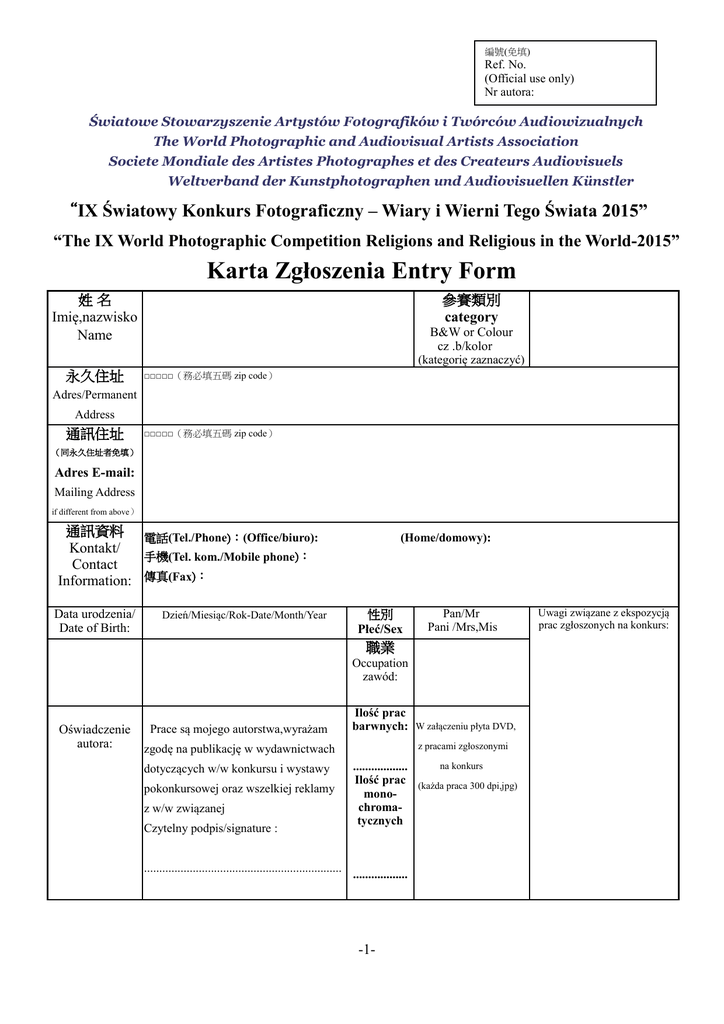 編號(免填) Ref. No. (Official use only) Nr autora: Światowe Stowarzyszenie Artystów Fotografików i Twórców Audiowizualnych The World Photographic and Audiovisual Artists Association Societe Mondiale des Artistes Photographes et des Createurs Audiovisuels Weltverband der Kunstphotographen und Audiovisuellen Künstler “IX Światowy Konkurs Fotograficzny – Wiary i Wierni Tego Świata 2015” “The IX World Photographic Competition Religions and Religious in the World-2015” Karta Zgłoszenia Entry Form 姓名 Imię,nazwisko Name 永久住址 參賽類別 category B&W or Colour cz .b/kolor (kategorię zaznaczyć) □□□□□(務必填五碼 zip code) Adres/Permanent Address 通訊住址 □□□□□(務必填五碼 zip code) (同永久住址者免填) Adres E-mail: Mailing Address if different from above) 通訊資料 電話(Tel./Phone):(Office/biuro): Kontakt/ 手機(Tel. kom./Mobile phone): Contact Information: 傳真(Fax): Data urodzenia/ Date of Birth: Dzień/Miesiąc/Rok-Date/Month/Year (Home/domowy): 性別 Płeć/Sex Pan/Mr Pani /Mrs,Mis 職業 Occupation zawód: Oświadczenie autora: Prace są mojego autorstwa,wyrażam Ilość prac barwnych: z pracami zgłoszonymi zgodę na publikację w wydawnictwach dotyczących w/w konkursu i wystawy pokonkursowej oraz wszelkiej reklamy z w/w związanej Czytelny podpis/signature : ................................................................. W załączeniu płyta DVD, .................. Ilość prac monochromatycznych .................. -1- na konkurs (każda praca 300 dpi,jpg) Uwagi związane z ekspozycją prac zgłoszonych na konkurs:
