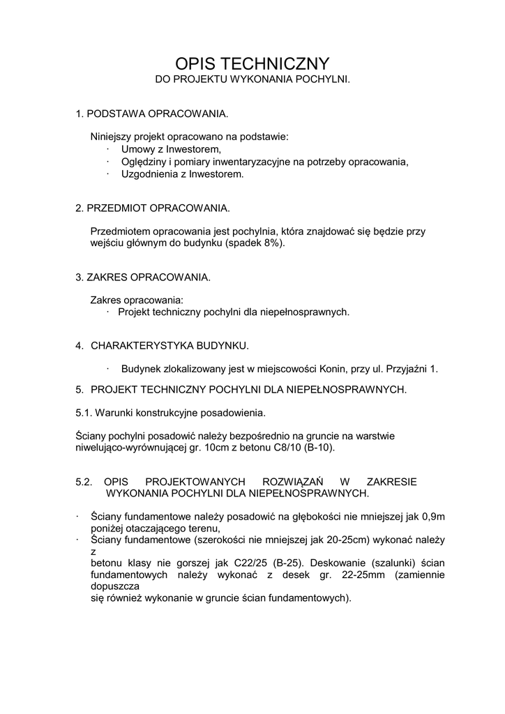 OPIS TECHNICZNY DO PROJEKTU WYKONANIA POCHYLNI. 1. PODSTAWA OPRACOWANIA. Niniejszy projekt opracowano na podstawie: · Umowy z Inwestorem, · Oględziny i pomiary inwentaryzacyjne na potrzeby opracowania, · Uzgodnienia z Inwestorem. 2. PRZEDMIOT OPRACOWANIA. Przedmiotem opracowania jest pochylnia, która znajdować się będzie przy wejściu głównym do budynku (spadek 8%). 3. ZAKRES OPRACOWANIA. Zakres opracowania: · Projekt techniczny pochylni dla niepełnosprawnych. 4. CHARAKTERYSTYKA BUDYNKU. · Budynek zlokalizowany jest w miejscowości Konin, przy ul. Przyjaźni 1. 5. PROJEKT TECHNICZNY POCHYLNI DLA NIEPEŁNOSPRAWNYCH. 5.1. Warunki konstrukcyjne posadowienia. Ściany pochylni posadowić należy bezpośrednio na gruncie na warstwie niwelująco-wyrównującej gr. 10cm z betonu C8/10 (B-10). 5.2. · · OPIS PROJEKTOWANYCH ROZWIĄZAŃ W ZAKRESIE WYKONANIA POCHYLNI DLA NIEPEŁNOSPRAWNYCH. Ściany fundamentowe należy posadowić na głębokości nie mniejszej jak 0,9m poniżej otaczającego terenu, Ściany fundamentowe (szerokości nie mniejszej jak 20-25cm) wykonać należy z betonu klasy nie gorszej jak C22/25 (B-25). Deskowanie (szalunki) ścian fundamentowych należy wykonać z desek gr. 22-25mm (zamiennie dopuszcza się również wykonanie w gruncie ścian fundamentowych). · · · · · · · · · · · · Po usunięciu deskowania należy wykonać izolację pionową w postaci dwóch warstw masy typu Abizol; Ściany powyżej terenu wykonać należy z policzków betonowych o gr. 12cm na zaprawie cementowej 7 MPa, Część wystającą ponad poziom terenu należy otynkować zaprawą cementowowapienną, a następnie 2-krotnie pomalować farbą silikatową we wskazanym kolorze przez Inwestora, Powierzchnię należy wykończyć kostka betonową gr. 8cm w kolorze czerwonym na podsypce piaskowo-cementowej gr. 12cm po zagęszczeniu (podsypkę piaskowo cementową układamy na izolacji z papy zgrzewalnej), Dolna część pochyli powinna mieć szerokość nie mniejszą jak 1,20m, Dolny krawężnik powinien się znajdować na wys. nie mniejszej jak 7,0cm nad poziomem posadzki pochylni, Słupki balustrady wykonane ze stali nierdzewnej ( rura kwadratowa 30x30x4mm powinny mieć wysokość nie mniejszą jak 1,10m) Poręcze powinny znajdować się po obu stronach pochyli w dwóch poziomach: pierwsza na wys. 75cm, druga na wys. 90cm od poziomu posadzki, Odległość między poręczami znajdujących się po obu stronach pochylni powinna wynosić od 1,0 do 1,10m; Poręcze pochylni należy wykonać ze stali nierdzewnej o średnicy 20 x 2mm; Poręcze przy końcach pochylni przedłużyć o 30 cm i zakończyć w sposób gwarantujący bezpieczne użytkowanie Dodatkowo należy wyłożyć nową kostkę brukową (gr. 8cm w kolorze czerwonym) przed pochylnią w ilości ok. 4,3m2. 5.3. KOLORYSTYKA. Elementy surowe należy otynkować (policzki betonowe), a następnie pomalować dwukrotnie farbą silikatową w kolorze uzgodnionym z Inwestorem. Należy przyjąć do wyceny II grupę cenową. Kostka betonowa gr. 8cm – kolor czerwony. INFORMACJA W ZAKRESIE BEZPIECZEŃSTWA I OCHRONY ZDROWIA. 1. Lokalizacja inwestycji: 62-510 Konin, ul. Przyjaźni 1. 1.1. Inwestor: Państwowa Wyższa Szkoła Zawodowa w Koninie. 1.2. Projektanci: Przemysław Seyda. 2. Podstawa prawna: Rozporządzenie Ministra Infrastruktury z dnia 23.06.2003 r. w sprawie informacji dotyczącej bezpieczeństwa i ochrony zdrowia oraz planu bezpieczeństwa i ochrony zdrowia – Dz.U. Nr 120 poz. 1126. 3. · 4. Zakres projektowanych robót obejmuje: Wykonanie pochylni dla niepełnosprawnych. Zagrożenia występujące podczas realizacji inwestycji: · Prace ziemne (do 1,0m głębokości) – możliwość wpadnięcia do wykopu, · Zrzucenie narzędzi, sprzętu lub materiałów budowlanych na ciągi komunikacyjne z wysokości, 5. Instruktaż pracowników: · Pracownicy powinni posiadać aktualne dopuszczenia i badania lekarskie do prowadzonych prac, · Wszyscy pracownicy zatrudnieni przy pracach powinni być przystąpieniem do robót przeszkoleni w zakresie BHP, · Przed przystąpieniem do prac montażowych i budowlanych na wysokości należy sprawdzić stan techniczny konstrukcji i urządzeń, na których będą one wykonywane w tym ich stabilność, wytrzymałość, na przewidywane obciążenia oraz zabezpieczenie przed nieprzewidzianą zmianą położenia, · Należy zwrócić uwagę na zachowanie ostrożności przy prowadzonych robotach budowlanych, tak, aby elementy istniejącego obiektu nie uległy uszkodzeniu lub zniszczeniu. 6. Zabezpieczenie placu budowy: · W trakcie wykonywania prac występuje konieczność wygrodzenia i zabezpieczenia placu budowy przed dostępem osób postronnych, · Materiały transportowane zabezpieczyć przed pyleniem i roznoszeniem po terenie, · Miejsce prowadzonych prac wydzielić i ogrodzić taśmą zabezpieczającą. 7. Zabezpieczenie placu budowy: · W trakcie wykonywania prac występuje konieczność wygrodzenia i zabezpieczenia placu budowy przed dostępem osób postronnych, · Materiały transportowane zabezpieczyć przed pyleniem i roznoszeniem po terenie, · Miejsce prowadzonych prac wydzielić i ogrodzić taśmą zabezpieczającą. 8. Osoba odpowiedzialna za opracowanie planu BIOZ na budowie: Zgodnie z postanowieniami w/w ustawy osoba przejmująca obowiązki Kierownika Budowy jest zobowiązana do opracowania planu BIOZ przed rozpoczęciem budowy i umieszczeniem go w widocznym miejscu.