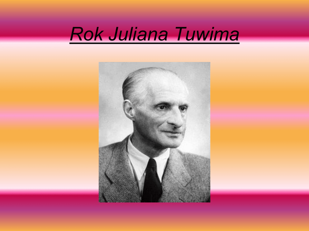 Rok Juliana Tuwima Biografia • Julian Tuwim (ur. 13 września 1894 w Łodzi, zm. 27 grudnia 1953 w Zakopanem) – polski poeta żydowskiego pochodzenia, najpopularniejszy pisarz dwudziestolecia międzywojennego. • Współzałożyciel kabaretu literackiego „Pod Picadorem”. • Współzałożyciel grupy poetyckiej „Skamander”. • Tłumacz poezji rosyjskiej, francuskiej, niemieckiej oraz łaciny. • Podpisywał się ponad czterdziestoma pseudonimami m.in. Oldlen, Tuvim, Schyzio Frenik, Wim, J. Wim, Pikador, Roch Pekiński. Lata młodości (1894–1916) • W latach 1904–1914 uczęszczał do Męskiego Gimnazjum Rządowego w Łodzi. Na początku uczył się słabo, nie okazywał zainteresowania przedmiotami ścisłymi, zwłaszcza matematyką, przez co powtarzał szóstą klasę. • Zadebiutował w 1911 przekładem na esperanto wierszy Leopolda Staffa. • W roku 1913 miał miejsce jego właściwy debiut poetycki, wiersz Prośba opublikowany został w „Kurierze Warszawskim”. Utwór poeta podpisał inicjałami St. M., poznanej w 1912, swojej przyszłej żony Stefanii Marchwiówny. Pobyt w Warszawie (1916–1939) • Studiował prawo i filozofię na Uniwersytecie Warszawskim (1916–1918), ukończył jedynie po jednym semestrze. • W trakcie studiów rozpoczął współpracę z czasopismem Pro Arte et Studio. • Był jednym z założycieli grupy poetyckiej Skamander w 1919. • 30 kwietnia 1919 poślubił Stefanię Marchew. • W czasie wojny polsko-bolszewickiej pracował w Biurze Prasowym Wodza Naczelnego Józefa Piłsudskiego. • W młodości inspirował się twórczością Leopolda Staffa. • Członek założyciel Związku Artystów i Kompozytorów Scenicznych (Zaiks). Ławeczka Tuwima Pomnik przedstawia naturalnej wielkości Juliana Tuwima siedzącego w pozie sprawiającej wrażenie, jakby poeta słuchał kogoś siedzącego obok niego. Miejsce na ławeczce obok Tuwima jest wolne, co umożliwia widzowi zajęcie obok niego miejsca i wczucie się w rolę osoby z nim rozmawiającej. Nos rzeźby jest wytarty z powodu miejskiej legendy mówiącej, że potarcie nosa Juliana Tuwima przynosi szczęście. Popiersie Juliana Tuwima znajduje się przed gmachem Związku Młodzieży Chrześcijańskiej Polska YMCA. Autorami popiersia są Elwira i Jerzy Mazurczyk. Pomnik jest wpisany do ewidencji zabytków Łodzi. Życie na obczyźnie (1939–1946) • W 1939 wyemigrował przez Rumunię, Włochy do Francji. Wspólnie z Janem Lechoniem, Antonim Słonimskim, Kazimierzem Wierzyńskim oraz Mieczysławem Grydzewskim . • Tuwim, razem z Lechoniem, udali się przez Hiszpanię do Lizbony, a następnie do Rio de Janeiro (Brazylia), gdzie dołączył do nich Kazimierz Wierzyński. Ostatecznie wspólnie też wyjechali do Nowego Jorku, gdzie poeta mieszkał przez blisko pięć lat (1942–1946). • Tuwim z Oskarem Lange pisali dla pism „Nowa Polska” oraz „Robotnik”. Członkowie grupy poetyckiej Skamander stanowili pierwszą, wielką falę emigracji polskich literatów i poetów. Ostatnie lata w Polsce (1946-1953) • Do Polski Tuwim wrócił w czerwcu 1946 roku. Został okrzyknięty poetą państwowym. • W 1946 roku Tuwimowie adoptowali córkę Ewę. • W latach 1947–1950 pełnił funkcję kierownika artystycznego Teatru Nowego. • W ostatnich latach życia Tuwim stworzył niewiele wierszy; czasami tylko ulegał prośbom zaprzyjaźnionych redaktorów, potrzebujących wierszy na rocznicowe okazje. • Zajmował się tłumaczeniami i zbieraniem kuriozów literackich, które publikował w miesięczniku „Problemy” w cyklu „Cicer cum Caule”. Rodzina • Ojciec poety, Izydor Tuwim (ur. 22 lipca 1858 w Kalwarii, zm. 1935), ukończył szkołę w Królewcu, następnie studiował w Paryżu, znał kilka języków obcych. • Matka, Adela z Krukowskich (ur. 9 stycznia 1872 w Mariampolu, zm. 1942), była córką właściciela drukarni, pochodziła z rodziny inteligenckiej. • Żonę, Stefanię Marchew (1894–1991), poślubił 30 kwietnia 1919 w Wielkiej Synagodze w Łodzi. • W 1946 roku, po powrocie z emigracji adoptowali córkę Ewę. Fundacja Córka Ewa w 2006 założyła „Fundację im. Juliana Tuwima i Ireny Tuwim” • Celem Fundacji jest udzielanie pomocy niepełnosprawnym i nieuleczalnie chorym dzieciom oraz niepełnosprawnej i nieuleczalnie chorej młodzieży, a także sprawowanie opieki nad dorobkiem artystycznym poety oraz jego siostry. Stan zdrowia Julian Tuwim przez znaczną część swego życia cierpiał na zaburzenia nerwicowe (agorafobia, nerwica wegetatywna) i depresję, które ograniczały jego normalne funkcjonowanie i pracę. Twórczość • Autor tekstów kabaretowych, rewiowych, librecista oraz autor tekstów politycznych. • Współautor i redaktor pism literackich i satyrycznych. • Tłumacz literatury rosyjskiej. • Autor popularnych wierszy dla dzieci. • Bibliofil i kolekcjoner kuriozów. • Znany ze swojego specyficznego humoru objawiającego się bystrością i świeżością umysłu. Odznaczenia, nagrody i wyróżnienia • Order Sztandaru Pracy I klasy (1949) • Złoty Wawrzyn Akademicki (1935) • Nagroda Literacka miasta Łodzi – dwukrotnie (1928, 1949) • Nagroda polskiego PEN Clubu (1935) • Nagroda Państwowa I stopnia (1952) • Doktorat honoris causa Uniwersytetu Łódzkiego (1949) Najważniejsze dzieła • Juwenilia (1911–1918) – wczesne próby poetyckie, sam Tuwim nigdy ich nie wydał. • Czyhanie na Boga (1918) • Sokrates tańczący (1920) • Siódma jesień (1921) • Pogrzeb prezydenta Narutowicza(1922) • Wierszy tom czwarty (1923) • Czary i czarty polskie (1924) • Wypisy czarnoksięskie (1924) • A to pan zna? (1925) • Czarna msza (1925) • Tysiąc dziwów prawdziwych (1925) • Słowa we krwi (1926) Śmierć Zmarł 27 grudnia 1953 roku, w pensjonacie Zaiks-u „Halama” w Zakopanem na atak serca. Pochowany został na Powązkach w Warszawie. Najlepszy moim zdaniem wiersz Murzynek Bambo w Afryce mieszka, 