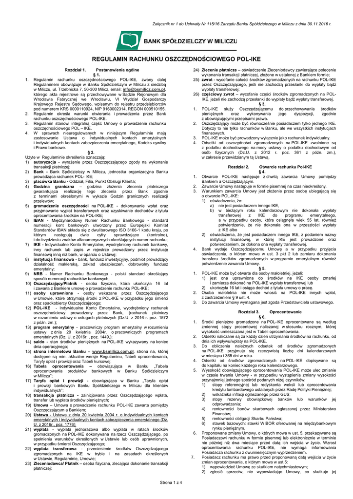 Załącznik nr 1 do Uchwały Nr 115/16 Zarządu Banku Spółdzielczego w Miliczu z dnia 30.11.2016 r. REGULAMIN RACHUNKU OSZCZĘDNOŚCIOWEGO POL-IKE Rozdział 1. Postanowienia ogólne § 1. 1. Regulamin rachunku oszczędnościowego POL-IKE, zwany dalej Regulaminem obowiązuje w Banku Spółdzielczym w Miliczu z siedzibą w Miliczu, ul. Trzebnicka 7, 56-300 Milicz, email: [email protected], którego akta rejestrowe są przechowywane w Sądzie Rejonowym dla Wrocławia Fabrycznej we Wrocławiu, VI Wydział Gospodarczy Krajowego Rejestru Sądowego, wpisanym do rejestru przedsiębiorców pod numerem KRS 0000110924, NIP 9160002314, REGON 000510155. 2. Regulamin określa warunki otwierania i prowadzenia przez Bank rachunku oszczędnościowego POL-IKE. 3. Regulamin stanowi integralną część Umowy o prowadzenie rachunku oszczędnościowego POL – IKE. 4. W sprawach nieuregulowanych w niniejszym Regulaminie mają zastosowanie Ustawa o indywidualnych kontach emerytalnych i indywidualnych kontach zabezpieczenia emerytalnego, Kodeks cywilny i Prawo bankowe. § 2. Użyte w Regulaminie określenia oznaczają: 1) autoryzacja - wyrażenie przez Oszczędzającego zgody na wykonanie transakcji płatniczej; 2) Bank - Bank Spółdzielczy w Miliczu, jednostka organizacyjna Banku prowadząca rachunek POL- IKE; 3) placówka Banku - Oddział, Filia, Punkt Obsługi Klienta; 4) Godzina graniczna – godzina złożenia zlecenia płatniczego gwarantująca realizację tego zlecenia przez Bank zgodnie z terminami określonymi w wykazie Godzin granicznych realizacji przelewów; 5) gromadzenie oszczędności na POL-IKE - dokonywanie wpłat oraz przyjmowanie wypłat transferowych oraz uzyskiwanie dochodów z tytułu oprocentowania środków na POL-IKE; 6) IBAN - Międzynarodowy Numer Rachunku Bankowego - standard numeracji kont bankowych utworzony przez Europejski Komitet Standardów IBAN składa się z dwuliterowego ISO 3166-1 kodu kraju, po którym następują dwie cyfry sprawdzające (kontrolne), i do trzydziestu znaków alfanumerycznych określających numer rachunku; 7) IKE - Indywidualne Konto Emerytalne, wyodrębniony rachunek bankowy, inny rachunek lub zapis w rejestrze prowadzony przez instytucję finansową inną niż bank, w oparciu o Ustawę; 8) instytucja finansowa - bank, fundusz inwestycyjny, podmiot prowadzący działalność maklerską, zakład ubezpieczeń, dobrowolny fundusz emerytalny; 9) NRB - Numer Rachunku Bankowego - polski standard określający sposób numeracji rachunków bankowych; 10) Oszczędzający/Płatnik - osoba fizyczna, która ukończyła 16 lat i zawarła z Bankiem umowę o prowadzenie rachunku POL-IKE; 11) osoby uprawnione - osoby wskazane przez Oszczędzającego w Umowie, które otrzymają środki z POL-IKE w przypadku jego śmierci oraz spadkobiercy Oszczędzającego; 12) POL-IKE - Indywidualne Konto Emerytalne, wyodrębniony rachunek oszczędnościowy prowadzony przez Bank, (rachunek płatniczy w rozumieniu ustawy o usługach płatniczych (Dz.U. z 2016 r. poz. 1572 z późn. zm.); 13) program emerytalny - pracowniczy program emerytalny w rozumieniu ustawy z dnia 20 kwietnia 2004r. o pracowniczych programach emerytalnych (Dz. U. z 2016r. , poz. 1449,); 14) saldo - stan środków pieniężnych na POL-IKE wykazywany na koniec dnia operacyjnego; 15) strona internetowa Banku – www.bsmilicz.com.pl, strona na, której dostępne są min. aktualne wersje Regulaminu, Tabeli oprocentowania, Taryfy opłat i prowizji oraz Tabeli kursowej; 16) Tabela oprocentowania – obowiązująca w Banku „Tabela oprocentowania produktów bankowych w Banku Spółdzielczym w Miliczu”; 17) Taryfa opłat i prowizji - obowiązująca w Banku „Taryfa opłat i prowizji bankowych Banku Spółdzielczego w Miliczu dla klientów indywidualnych”; 18) transakcja płatnicza - zainicjowana przez Oszczędzającego wpłata, transfer lub wypłata środków pieniężnych; 19) Umowa – Umowa o prowadzenie rachunku POL-IKE zawarta pomiędzy Oszczędzającym a Bankiem; 20) Ustawa - Ustawa z dnia 20 kwietnia 2004 r. o indywidualnych kontach emerytalnych i indywidualnych kontach zabezpieczenia emerytalnego (Dz. U. z 2016r., poz. 1776); 21) wypłata - wypłata jednorazowa albo wypłata w ratach środków gromadzonych na POL-IKE dokonywana na rzecz Oszczędzającego, po spełnieniu warunków określonych w Ustawie lub osób uprawnionych, w przypadku śmierci Oszczędzającego; 22) wypłata transferowa - przeniesienie środków Oszczędzającego zgromadzonych na IKE w trybie i na zasadach określonych w Ustawie, Regulaminie, Umowie; 23) Zleceniodawca/ Płatnik – osoba fizyczna, zlecająca dokonanie transakcji płatniczej; Strona 1 z 4 24) Zlecenie płatnicze – oświadczenie Zleceniodawcy zawierające polecenie wykonania transakcji płatniczej, złożone w ustalonej z Bankiem formie; 25) zwrot - wycofanie całości środków zgromadzonych na rachunku POL-IKE przez Oszczędzającego, jeśli nie zachodzą przesłanki do wypłaty bądź wypłaty transferowej; 26) częściowy zwrot – wycofanie części środków zgromadzonych na POLIKE, jeżeli nie zachodzą przesłanki do wypłaty bądź wypłaty transferowej. § 3. 1. POL-IKE służy Oszczędzającemu do przechowywania środków pieniężnych oraz wykonywania jego dyspozycji, zgodnie z obowiązującymi przepisami prawa. 2. Oszczędzający może być równocześnie posiadaczem tylko jednego IKE. Dotyczy to nie tylko rachunków w Banku, ale we wszystkich instytucjach finansowych. 3. POL-IKE może być prowadzony wyłącznie jako rachunek indywidualny. 4. Odsetki od oszczędności zgromadzonych na POL-IKE zwolnione są z podatku dochodowego na mocy ustawy o podatku dochodowym od osób fizycznych (Dz.U. z 2012 r. poz. 361 z późn. zm.), w zakresie przewidzianym tą Ustawą. Rozdział 2. 1. 2. 3. 4. 1. 2. 3. 1. 2. 3. 4. 5. 6. 7. Otwarcie rachunku Pol-IKE § 4. Otwarcie POL-IKE następuje z chwilą zawarcia Umowy pomiędzy Bankiem a Oszczędzającym. Zawarcie Umowy nastę