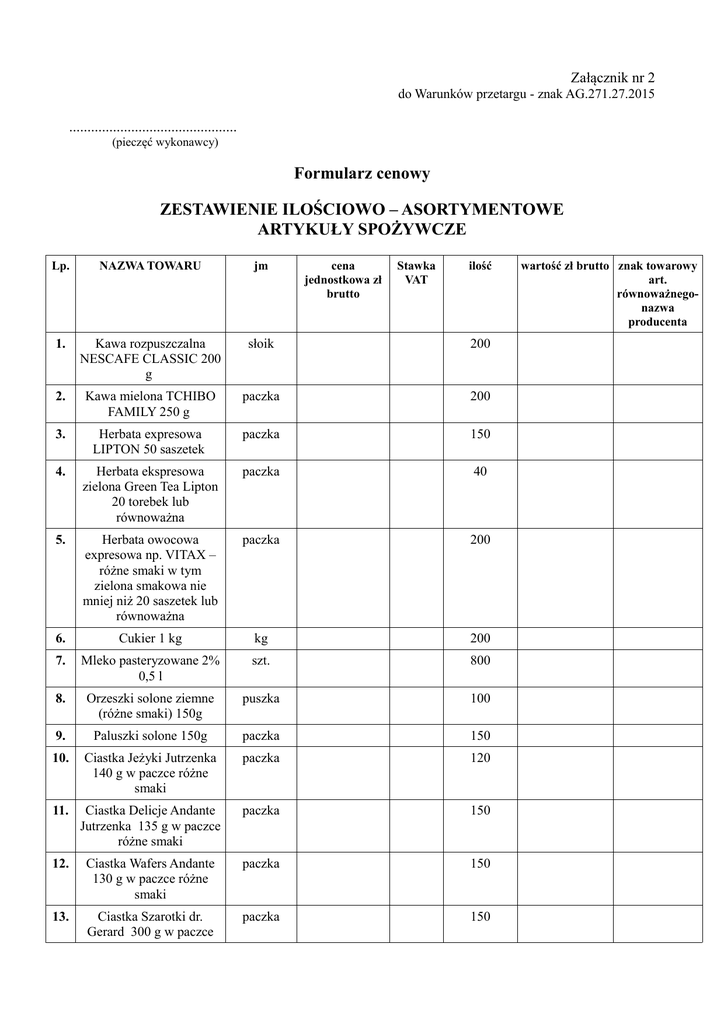 Załącznik nr 2 do Warunków przetargu - znak AG.271.27.2015 .............................................. (pieczęć wykonawcy) Formularz cenowy ZESTAWIENIE ILOŚCIOWO – ASORTYMENTOWE ARTYKUŁY SPOŻYWCZE Lp. NAZWA TOWARU jm cena jednostkowa zł brutto Stawka VAT ilość 1. Kawa rozpuszczalna NESCAFE CLASSIC 200 g słoik 200 2. Kawa mielona TCHIBO FAMILY 250 g paczka 200 3. Herbata expresowa LIPTON 50 saszetek paczka 150 4. Herbata ekspresowa zielona Green Tea Lipton 20 torebek lub równoważna paczka 40 5. Herbata owocowa expresowa np. VITAX – różne smaki w tym zielona smakowa nie mniej niż 20 saszetek lub równoważna paczka 200 6. Cukier 1 kg kg 200 7. Mleko pasteryzowane 2% 0,5 l szt. 800 8. Orzeszki solone ziemne (różne smaki) 150g puszka 100 9. Paluszki solone 150g paczka 150 10. Ciastka Jeżyki Jutrzenka 140 g w paczce różne smaki paczka 120 11. Ciastka Delicje Andante Jutrzenka 135 g w paczce różne smaki paczka 150 12. Ciastka Wafers Andante 130 g w paczce różne smaki paczka 150 13. Ciastka Szarotki dr. Gerard 300 g w paczce paczka 150 wartość zł brutto znak towarowy art. równoważnegonazwa producenta różne smaki 14. Ciastka Słodkie Marzena Cukry Niskie 230 g w paczce różne smaki paczka 140 15. Ciastka Kruche dekorowane Artur 175 g w paczce różne smaki paczka 130 16. Ciastka Rogaliki Artura Artur 220 g w paczce różne smaki paczka 130 17. Ciastka Pierniki z nadzieniem Artur 190 g w paczce różne smaki paczka 120 18. Ciastka Markizy Negro dr. Gerard 360 g w paczce różne smaki paczka 150 19. Cukierki czekoladowe mieszane smaki kg 250 20. Czekolada 250 g różne smaki szt. 100 21. Cytryna żółta kg 50 22. Sok owocowy HORTEX smak jabłko1 l lub równoważny szt. 100 23. Sok owocowy HORTEX smak pomarańcza 1 l lub równoważny szt. 100 24. Sok owocowy HORTEX smak jabłko z wiśnią 1 l lub równoważny szt. 100 25. Sok owocowy HORTEX smak grejfrut 1 l lub równoważny szt. 100 26. Sok pomidorowy HORTEX 1 l lub równoważny szt. 40 27. Cukierki ciut ciut lub pudrowe mini mini różne smaki kg 70 28. Wino musujące słodkie białe IGROSTOJE 750 ml szt. 300 29. Woda mineralna niegazowana 1,5 l w butelce plastikowej AQUAREL lub równoważna szt. 2500 30. Woda mineralna gazowana 0,5 l w butelce plastikowej AQUAREL szt. 5000 lub równoważna 31. Woda mineralna niegazowana 0,5 l w butelce plastikowej AQUAREL lub równoważna szt. 5000 32. Coca-cola 1l szt. 40 33. Owoce sezonowe mandarynki kg 50 34. Owoce sezonowe – banany kg 50 35. Owoce sezonowe – winogrono zielone kg 30 36. Kapsułki z kawą NESPRESSO 50 g 10 szt. w opakowaniu różne smaki do ekspresu systemu Nespresso op. 60 37. Kapsułki z kawą NESPRESSO 300 g 50 szt. w opakowaniu różne smaki do ekspresu systemu Nespresso GEMINI CS 100PRO op. 50 38. Herbata DILMAH Pick&Mix 240 torebek – 430g 12 smaków w opakowaniu op. 15 39. Kawa ziarnista Caffe Rizzi V.I.P.100% Arabica 1000 g lub równoważna op. 70 40. Herbata Dilmah Ceylon Gold 200 g (100 x 2 g – 100 szt. opakowanie) lub równoważna op. 10 41. RAZEM 17365 Wszystkie artykuły spełniają wymogi polskich norm. W przypadku oferowanych produktów równoważnych Wykonawca zobowiązany jest wskazać w tabeli normę wyrobu równoważnego oraz producenta. Znak towarowy artykułu Wykonawca określa w przypadku oferowania artykułu równoważnego. Nie określenie znaku towarowego artykułu przez Wykonawcę będzie oznaczać, że oferuje artykuł o znaku towarowym określonym przez Zamawiającego. ............................................... (data i podpis osoby upoważnionej)