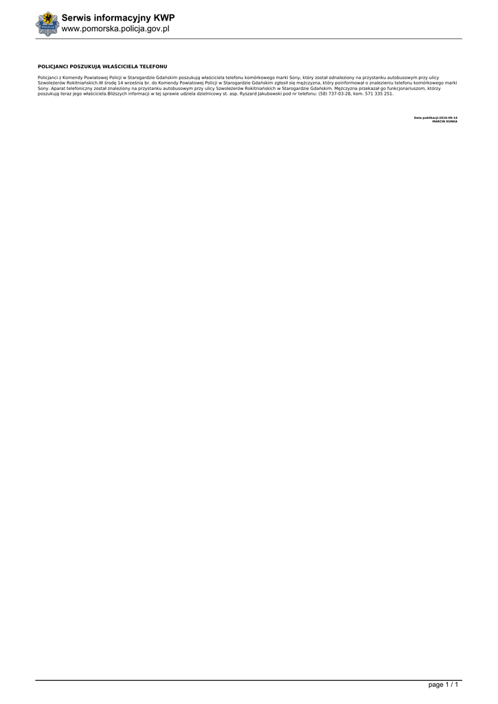 Serwis informacyjny KWP www.pomorska.policja.gov.pl POLICJANCI POSZUKUJĄ WŁAŚCICIELA TELEFONU Policjanci z Komendy Powiatowej Policji w Starogardzie Gdańskim poszukują właściciela telefonu komórkowego marki Sony, który został odnaleziony na przystanku autobusowym przy ulicy Szwoleżerów Rokitniańskich.W środę 14 września br. do Komendy Powiatowej Policji w Starogardzie Gdańskim zgłosił się mężczyzna, który poinformował o znalezieniu telefonu komórkowego marki Sony. Aparat telefoniczny został znaleziony na przystanku autobusowym przy ulicy Szwoleżerów Rokitniańskich w Starogardzie Gdańskim. Mężczyzna przekazał go funkcjonariuszom, którzy poszukują teraz jego właściciela.Bliższych informacji w tej sprawie udziela dzielnicowy st. asp. Ryszard Jakubowski pod nr telefonu: (58) 737-03-28, kom. 571 335 251. Data publikacji:2016-09-14 MARCIN KUNKA page 1 / 1 Powered by TCPDF (www.tcpdf.org)
