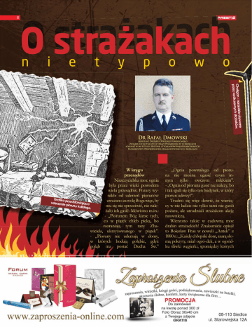 8 I 0TUSBƆBLBDI M A G A Z Y N n i e t y p o w L O K A L N Y o G]LHXİ\ZDQH &KXOLJDQQDU]č \FKVWUDİDNyZ SU]H]ZVyãF]HVQ Dr Rafał Dmowski sekretarz Zarządu Oddziału Powiatowego Związku Ochotniczych Straży Pożarnych RP w Siedlcach adiunkt w Instytucie Historii i Stosunków Międzynarodowych Uniwersytetu Przyrodniczo-Humanistycznego w Siedlcach :NUęJX SU]HVĊGyZ 1LV]F]\FLHOVNDPRFRJQLD E\âD SU]H] ZLHNL SRZRGHP ZLHOXSU]HVĊGyZ3RůDU\Z\QLNâH RG XGHU]Hľ SLRUXQyZ *UDÀNDS XZDůDQR]DZROę%RJDZLęFE\ XGHU]HQLH U]HGVWDZLDMĈFD SLRUXQXN PXVLęQLHVSU]HFLZLýQLHQDOHXOLVWHJR ůDâRLFKJDVLý0yZLRQRPLQ Å3LRUXQHP %yJ NDU]H W\FK FR Z SLĊWHN FKOHE SLHNĊ ER UR]UDQLDMĊ W\P UDQ\ =EDZLFLHOD XNU]\ůRZDQHJR Z SLĊWHNµ Å3LRUXQ\ QLH XGHU]DMĊ Z GRP\ Z NWyU\FK KRGXMĊ JRâęELH JG\ů JRâĊE PD SRVWDý 'XFKD ŒZµ 5 ( . / $ 0 $ Å2JQLD SRZVWDâHJR RG SLRUXQD QLH PRůQD XJDVLý F]\P LQQ\P W\ONR RZF]\P POHNLHPµ Å2JQLDRGSLRUXQDJDVLýQLHQDOHů\ER LWDNVSDOLVLęW\ONRWHQEXG\QHNZNWyU\ SLRUXQXGHU]\âµ 7UXGQR VLę ZLęF G]LZLý ůH ZLHU]ĊF\ZQLHOXG]LHQLHW\ONRVDPLQLHJDVLOL SRůDUX DOH XWUXGQLDOL VWUDůDNRP DNFMę UDWRZQLF]Ċ :LHU]RQR WDNůH Z FXGRZQĊ PRF GUDELQ VWUDůDFNLFK =QDNRPLFLH RSLVDâ WR %ROHVâDZ 3UXV Z QRZHOL Å$QWHNµ ] UÅ.DůG\FKâRSVNLGRPV]DUĊVâRPĊSRNU\W\PLDâRJUyGHNDZRJUyGNXœOLZNLZęJLHUNLVSRPLęG]\NWyU\FK 9 ZLGDý E\âR NRPLQ VDG]Ċ XF]HUQLRQ\ L SRůDUQĊGUDELQNę'UDELQ\WH]DSURZDG]RQRQLHRGGDZQDDOXG]LHP\œOHOLůH RQHOHSLHMFKURQLýEęGĊFKDW\RGRJQLD QLůGDZQLHMERFLDQLHJQLD]GD7RWHůJG\ SâRQĊâMDNLEXG\QHNG]LZLOLVLęEDUG]R DOH JR QLH UDWRZDOL :LGDý ůH QD WHJR JRVSRGDU]D E\â GRSXVW ERVNL PyZLOL PLęG]\VREĊµ 2G XGHU]Hľ SLRUXQD PLDâ\ FKURQLý UyZQLHů œZLHFH SRSXODUQLH ]ZDQH JURPQLFDPLQD]ZDMDNZLGDýQLHSU]\SDGNRZD NWyUH XVWDZLDQR Z RNQDFK Z\FKRG]ĊF\FK QD VWURQę ] NWyUHM V]âD EXU]D,QQ\PVSRVREHPRFKURQ\SU]HG XGHU]HQLHP SLRUXQD E\âR Z\VWDZLHQLH ZRNQLHGRPXREUD]ND]HœZLęW\PSDWURQHP .ROHMQ\PL UHNZL]\WDPL Z\NRU]\VW\ZDQ\PL GR RFKURQ\ GRPX RG XGHU]HľSLRUXQDSRůDUXLZLFKXU\E\â\ JDâĊ]NL ]HUZDQH ] F]ZDUWHJR RâWDU]D Z\EXGRZDQHJRZ%RůH&LDâRLSDOPD :LHONDQRFQD$WDNůH«VyOSRœZLęFRQDOXWHJRZGQLXœZ$JDW\ ŒZLęFL RGSRůDUyZ" PDMD REFKRG]LP\ œZLęWR SDWURQD VWUDůDNyZœZ)ORULDQDQLHMHVWRQMHGQDN ZEUHZ SRZV]HFKQHPX PQLHPDQLX MHG\Q\PSDWURQHPVWUDůDNyZ'RLQQ\FK PQLHM]QDQ\FKSDWURQyZVWUDů\QDOHůĊ œZ:DZU]\QLHFœZ.DWDU]\QD]H6LHQ\ œZ%DUEDUDœZ$JDWDLœZ-y]HI:LDUD Z RUęGRZQLFWZR Z\ůHM Z\PLHQLRQ\FK œZLęW\FK Z SU]HV]âRœFL E\âD QLH]Z\NOH UR]SRZV]HFKQLRQD*G\SRůDUMXůZ\EXFKâ Z MHJR XJDV]HQLX PLDâR SRPyF REHMœFLHSDOĊFHJRVLęPLHMVFH]REUD]HP œZLęWHJRZUęNXLXFLHF]NDZSROH2EUD]PLDâFXGRZQĊPRFSRFLĊJQLęFLD]D VREĊRJQLDE\SRůDURPLQĊâ]DEXGRZDQLD-HGQD]PRLFKUHVSRQGHQWHNSU]\ZRâXMĊFVLęQDZVSRPQLHQLDVZHMEDEFL 5 ( . / $ 0 $ WZLHUG]L ůH SRGF]DV SRůDUX MDNL Z\EXFKâ ZH ZU]HœQLX URNX ZH ZVL 'ĊEUyZND 6WDQ\ NRPXœ NWRSRGF]DVRZHJRSRůDUXRELHJâ ]REUD]HPSâRQĊFĊVWRGRâęFRœVLę QLHXGDâR3RůDURZV]HPV]HGâ]D REUD]HPDOHQLHW\ONRERUyZQLHů SU]HGRVWDâVLęQDGRP\LLQQHEX G\QNLJRVSRGDUVNLHLVSDOLâRVLę JRVSRGDUVWZDF]\OLõZVL &,(.$:267., 675$Ů$&.,( 3RF]\PSR]QDý RFKRWQLND" ']LœJG\VSU]ęWLXPXQGXURZDQLH ZLHOX VWUDůDNyZ RFKRWQLNyZ QLHZLHOHUyůQLVLęRGZ\SRVDůHQLDLXPXQGXURZDQLD VWUDůDNyZ ] SDľVWZRZHM VWUDů\ SRůDUQHM D F]DVDPL QDZHW MHVW OHSV]HWUXGQRQDSLHUZV]\U]XWRNDSR]QDý NWR MHVW NWR 0HWRGD MHVW EDUG]R SURVWDRFKRWQLNyZPRůHP\SR]QDýSR ELDâ\FKKHâPDFK]DZRGRZF\PDMĊERZLHPKHâP\F]HUZRQH 2EUD]ģZ$JDW\ JQLHP KURQLĈFHMSU]HGR LF QN SDWUR MHVRELHVSUDZęůHXPLHV]F]RQRQDQLFK UyůQH ZH]ZDQLD PLQ ÅŒZ )ORULDQLH 3DWURQLH 1DV] %ĊGŭ 1DV]HP 2SLHNXQHPµ Å%RJX QD FKZDâę EOLŭQLHPX QD UDWXQHNµÅ%RJXQDFKZDâęEOLŭQLHPX GRSRPRF\µÅ:MHGQRœFLVLâDµÅ:V]\-HG\Q\FKXOLJDQ VF\ ]D MHGQHJR MHGHQ ]D ZV]\VWNLFKµ JRGQ\]DXIDQLD ÅŒZLęW\ )ORULDQLH PyGO VLę ]D QDPLµ 2G NLONX ODW QD Z\SRVDůHQLX ZLęN- Å%RJXQDFKZDâęOXG]LRPQDUDWXQHNµ V]RœFL MHGQRVWHN 363 L FRUD] ZLęNV]HM Å: VâXůELH %RJX L 2MF]\ŭQLHµ Å%yJ LORœFL263MHVWXU]ĊG]HQLH]ZDQHFKXOL- +RQRU2MF]\]QDµ&]\ÅŒZLęW\)ORULDJDQHP']LęNLMHJR]DVWRVRZDQLXZLHOR- QLHEâRJRVâDZ1DV]HMSRPRF\EOLŭQLPµ NURWQLHXGDâRVLęXUDWRZDýF]\MHœů\FLH OXEPLHQLH7RQLHSR]RUQLHZ\JOĊGDMĊFH QDU]ęG]LH]DVWęSXMH]SRZRG]HQLHPNLO$XWRU VHUGHF]QLH G]LęNXMH 0DJND GRW\FKF]DV Xů\ZDQ\FK PLQ WRSyU GDOHQLH $QGU]HMF]\N 6\OZLL )ODN FLęůNLERVDNLâRP .DWDU]\QLH .DUDELQ %RJXVâDZLH 6SU]ęF]DN 0DULROL L 7RPDV]RZL +DVâDQDV]WDQGDUDFK 6WDľVNLP 0LFKDâRZL )LMRâNRZL L VWUDůDFNLFK -DFNRZL 0LFKDâRZVNLHPX ]D SR.DůG\ ] QDV ZLHORNURWQLH ZLG]LDâ PRFSRGF]DV]ELHUDQLDPDWHULDâyZ V]WDQGDU\VWUDůDFNLHQLHZLHOHRVyE]GD- GRQLQLHMV]HJRDUW\NXâX