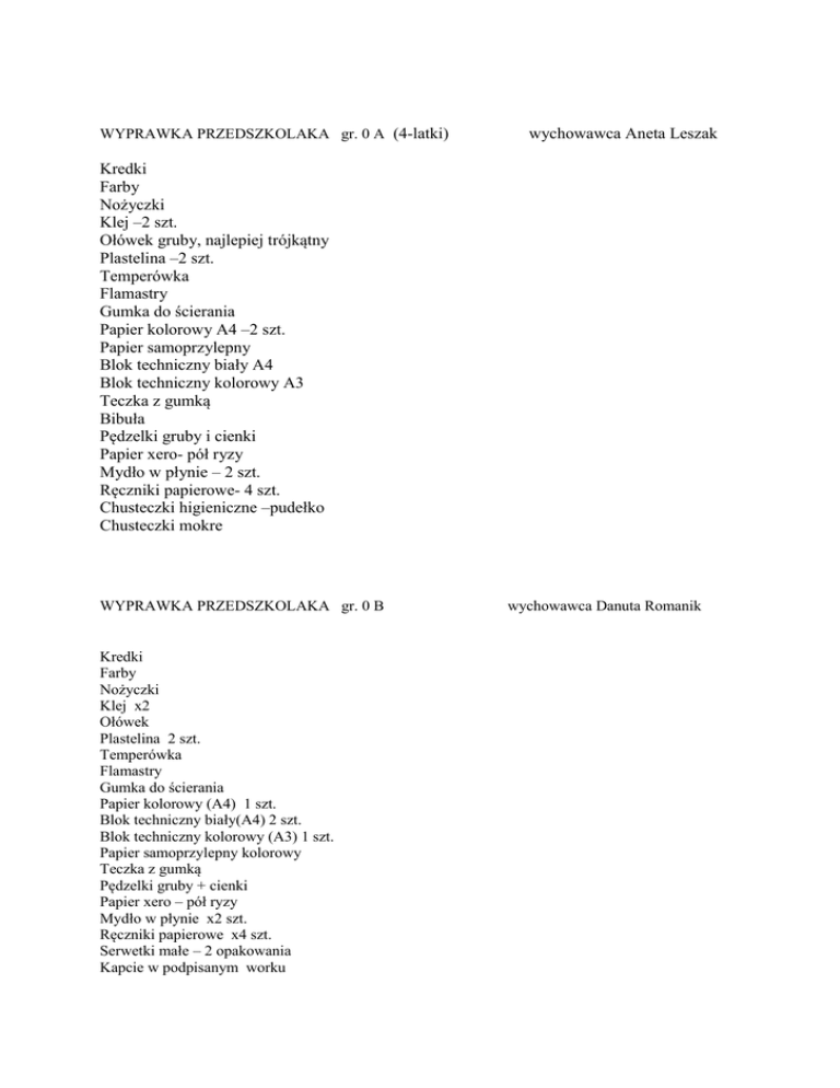 WYPRAWKA PRZEDSZKOLAKA gr. 0 A (4-latki) wychowawca Aneta Leszak Kredki Farby Nożyczki Klej –2 szt. Ołówek gruby, najlepiej trójkątny Plastelina –2 szt. Temperówka Flamastry Gumka do ścierania Papier kolorowy A4 –2 szt. Papier samoprzylepny Blok techniczny biały A4 Blok techniczny kolorowy A3 Teczka z gumką Bibuła Pędzelki gruby i cienki Papier xero- pół ryzy Mydło w płynie – 2 szt. Ręczniki papierowe- 4 szt. Chusteczki higieniczne –pudełko Chusteczki mokre WYPRAWKA PRZEDSZKOLAKA gr. 0 B Kredki Farby Nożyczki Klej x2 Ołówek Plastelina 2 szt. Temperówka Flamastry Gumka do ścierania Papier kolorowy (A4) 1 szt. Blok techniczny biały(A4) 2 szt. Blok techniczny kolorowy (A3) 1 szt. Papier samoprzylepny kolorowy Teczka z gumką Pędzelki gruby + cienki Papier xero – pół ryzy Mydło w płynie x2 szt. Ręczniki papierowe x4 szt. Serwetki małe – 2 opakowania Kapcie w podpisanym worku wychowawca Danuta Romanik WYPRAWKA PRZEDSZKOLAKA gr. 0 C Klej x2 Plastelina 2 szt. Blok techniczny biały(A4) 1 szt. Blok techniczny kolorowy (A4) 2 szt. Papier samoprzylepny kolorowy 2 szt. Teczka z gumką Mydło w płynie x2 szt. Ręczniki papierowe x4 szt. Serwetki małe – 2 opakowania Kapcie w podpisanym worku wychowawca Małgorzata Wierzbowska