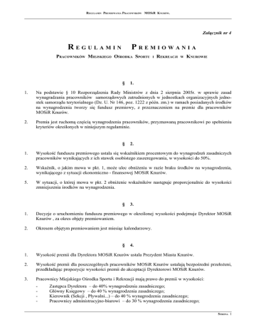 REGULAMIN PREMIOWANIA PRACOWNIKÓW MOSIR KNURÓW. Załącznik nr 4 REGULAMIN PREMIOWANIA PRACOWNIKÓW MIEJSKIEGO OŚRODKA SPORTU § I REKREACJI W KNUROWIE 1. 1. Na podstawie § 10 Rozporządzenia Rady Ministrów z dnia 2 sierpnia 2005r. w sprawie zasad wynagradzania pracowników samorządowych zatrudnionych w jednostkach organizacyjnych jednostek samorządu terytorialnego (Dz. U. Nr 146, poz. 1222 z późn. zm.) w ramach posiadanych środków na wynagrodzenia tworzy się fundusz premiowy, z przeznaczeniem na premie dla pracowników MOSiR Knurów. 2. Premia jest ruchomą częścią wynagrodzenia pracowników, przyznawaną pracownikowi po spełnieniu kryteriów określonych w niniejszym regulaminie. § 2. 1. Wysokość funduszu premiowego ustala się wskaźnikiem procentowym do wynagrodzeń zasadniczych pracowników wynikających z ich stawek osobistego zaszeregowania, w wysokości do 50%. 2. Wskaźnik, o jakim mowa w pkt. 1, może ulec obniżeniu w razie braku środków na wynagrodzenia, wynikającego z sytuacji ekonomiczno - finansowej MOSiR Knurów. 5. W sytuacji, o której mowa w pkt. 2 obniżenie wskaźników następuje proporcjonalnie do wysokości zmniejszenia środków na wynagrodzenia. § 3. 1. Decyzje o uruchomieniu funduszu premiowego w określonej wysokości podejmuje Dyrektor MOSiR Knurów , za okres objęty premiowaniem. 2. Okresem objętym premiowaniem jest miesiąc kalendarzowy. § 4. 1. Wysokość premii dla Dyrektora MOSiR Knurów ustala Prezydent Miasta Knurów. 2. Wysokość premii dla poszczególnych pracowników MOSiR Knurów ustalają bezpośredni przełożeni, przedkładając propozycje wysokości premii do akceptacji Dyrektorowi MOSiR Knurów. 3. Pracownicy Miejskiego Ośrodka Sportu i Rekreacji mają prawo do premii w wysokości: - Zastępca Dyrektora – do 40% wynagrodzenia zasadniczego; Główny Księgowy – do 40 % wynagrodzenia zasadniczego; Kierownik (Sekcji , Pływalni...) – do 40 % wynagrodzenia zasadniczego; Pracownicy administracyjno-biurowi – do 30 % wynagrodzenia zasadniczego; STRONA 1 REGULAMIN PREMIOWANIA PRACOWNIKÓW MOSIR KNURÓW. - Pracownicy obsługi – do 30 % wynagrodzenia zasadniczego. § 5. 1. Pracownik nabywa prawo do premii w wysokości określonej powyżej po spełnieniu warunków premiowania przewidzianych w § 6. 2. W razie niespełnienia warunków premiowania pracownik nie nabywa prawa do premii w całości lub w części. 3. Za okres usprawiedliwionej nieobecności w pracy premia przysługuje tylko w przypadkach określonych w § 8 i w § 9. § 1. Do podstawowych warunków, po spełnieniu których pracownik nabywa prawo do premii w pełnej wysokości, należą: a) b) c) d) e) f) wykonanie zadań związanych z zajmowanym przez pracownika stanowiskiem, pełne wykorzystanie czasu pracy na pracę zawodową, przestrzeganie w procesie pracy przepisów i zasad bezpieczeństwa i higieny pracy oraz przepisów przeciwpożarowych, właściwe i efektywne wykorzystywanie środków pracy, wykonywanie poleceń przełożonych dotyczących pracy, sumienne i staranne wykonywanie pozostałych obowiązków określonych w przepisach prawa pracy i mieszczących się w zakresie czynności pracownika. § 1. 7. Pracownik traci prawo do premii w całości za dany miesiąc w przypadkach: a) b) c) d) e) 2. 6. rozwiązania umowy o pracę bez wypowiedzenia z winy pracownika, tymczasowego aresztowania, zagarnięcia mienia pracodawcy albo umyślnego wyrządzenia szkody zakładowi w inny sposób, stawienia się do pracy w stanie po spożyciu alkoholu lub spożywania alkoholu w czasie pracy bądź w miejscu pracy, innego ciężkiego naruszenia podstawowych obowiązków pracowniczych. Pracownik traci prawo do części premii w przypadku: a) b) c) d) niesumiennego wywiązywania się z powierzonych obowiązków służbowych, odmowy wykonania polecenia służbowego związanego z zakresem powierzonych obowiązków, niewłaściwego stosunku do petentów, współpracowników i przełożonych, naruszenia obowiązków pracowniczych. 3. Zawiadomienie pracownika o nieprzyznaniu mu premii powinno być dokonane na piśmie przed terminem wypłaty premii z uzasadnieniem. 4. Pracownik może w przypadku określonym w ust. 3 wystąpić w ciągu 7 dni ze sprzeciwem w trybie reklamacyjnym do Dyrektora Zakładu. Nieodrzucenie sprzeciwu w ciągu 14 dni od dnia jego wniesienia jest równoznaczne z uwzględnieniem sprzeciwu. STRONA 2 REGULAMIN PREMIOWANIA PRACOWNIKÓW MOSIR KNURÓW. § 8. 1. Podstawowym warunkiem przyznania premii jest przepracowanie przez pracownika nominalnego czasu pracy w danym miesiącu kalendarzowym, rozliczanego w dniach roboczych. 2. Do przepracowanego nominalnego czasu pracy zalicza się jednak okresy niewykonywania pracy z powodu: a) b) c) 3. Nie przepracowanie nominalnego czasu pracy w danym miesiącu z powodu: a) b) c) d) e) 4. urlopu wypoczynkowego; zwolnień od pracy, za które pracownik w myśl powszechnie obowiązujących przepisów zachowuje prawo do wynagradzania, w tym tzw. urlopów okolicznościowych; zwolnień od pracy spowodowanych niezdolnością do pracy wynikłą z: choroby zawodowej; niezdolności do pracy w wyniku wypadku przy pracy oraz niezdolności do pracy z powodu wypadku w drodze do i z pracy bez winy pracownika; choroby przypadającej w okresie ciąży; rozwiązania stosunku pracy w związku z przejściem na emeryturę lub rentę inwalidzką; powołania do zasadniczej lub okresowej służby wojskowej i powrotu do pracy po jej odbyciu; rozpoczęcia urlopu macierzyńskiego i powrotu do pracy po jego zakończeniu; rozpoczęcia urlopu wychowawczego i powrotu do pracy po jego zakończeniu; zmiany zatrudnienia w pełnym wymiarze czasu pracy na zatrudnienie w niepełnym – nie powoduje umniejszenia premii za dany miesiąc. W uzasadnionych przypadkach, na wniosek pracownika, Dyrektor MOSiR Knurów może uznać inne niż wymienione w ust. 2 i 3 okresy niewykonywania pracy za zaliczalne do przepracowanego nominalnego czasu pracy. § 1. Z zastrze