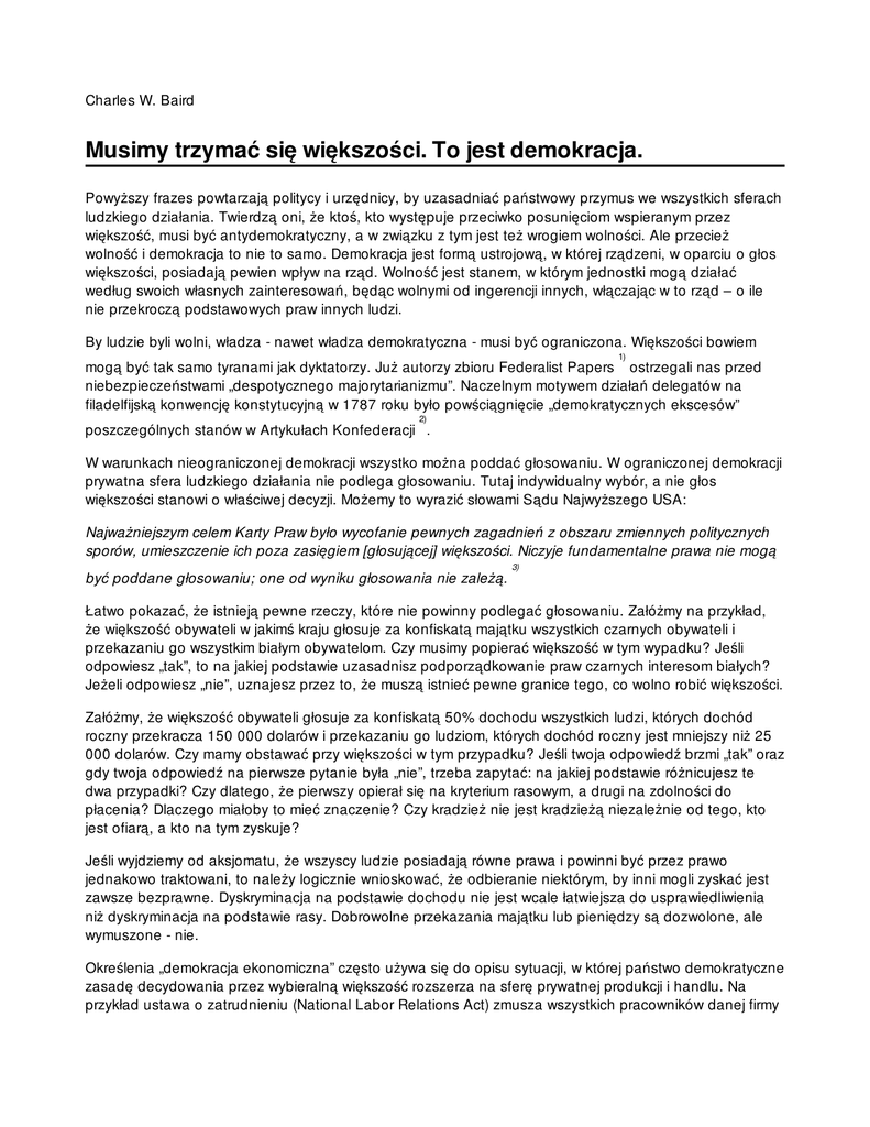 Charles W. Baird Musimy trzymać się większości. To jest demokracja. Powyższy frazes powtarzają politycy i urzędnicy, by uzasadniać państwowy przymus we wszystkich sferach ludzkiego działania. Twierdzą oni, że ktoś, kto występuje przeciwko posunięciom wspieranym przez większość, musi być antydemokratyczny, a w związku z tym jest też wrogiem wolności. Ale przecież wolność i demokracja to nie to samo. Demokracja jest formą ustrojową, w której rządzeni, w oparciu o głos większości, posiadają pewien wpływ na rząd. Wolność jest stanem, w którym jednostki mogą działać według swoich własnych zainteresowań, będąc wolnymi od ingerencji innych, włączając w to rząd – o ile nie przekroczą podstawowych praw innych ludzi. By ludzie byli wolni, władza - nawet władza demokratyczna - musi być ograniczona. Większości bowiem 1) mogą być tak samo tyranami jak dyktatorzy. Już autorzy zbioru Federalist Papers ostrzegali nas przed niebezpieczeństwami „despotycznego majorytarianizmu”. Naczelnym motywem działań delegatów na filadelfijską konwencję konstytucyjną w 1787 roku było powściągnięcie „demokratycznych ekscesów” 2) poszczególnych stanów w Artykułach Konfederacji . W warunkach nieograniczonej demokracji wszystko można poddać głosowaniu. W ograniczonej demokracji prywatna sfera ludzkiego działania nie podlega głosowaniu. Tutaj indywidualny wybór, a nie głos większości stanowi o właściwej decyzji. Możemy to wyrazić słowami Sądu Najwyższego USA: Najważniejszym celem Karty Praw było wycofanie pewnych zagadnień z obszaru zmiennych politycznych sporów, umieszczenie ich poza zasięgiem [głosującej] większości. Niczyje fundamentalne prawa nie mogą być poddane głosowaniu; one od wyniku głosowania nie zależą. 3) Łatwo pokazać, że istnieją pewne rzeczy, które nie powinny podlegać głosowaniu. Załóżmy na przykład, że większość obywateli w jakimś kraju głosuje za konfiskatą majątku wszystkich czarnych obywateli i przekazaniu go wszystkim białym obywatelom. Czy musimy popierać większość w tym wypadku? Jeśli odpowiesz „tak”, to na jakiej podstawie uzasadnisz podporządkowanie praw czarnych interesom białych? Jeżeli odpowiesz „nie”, uznajesz przez to, że muszą istnieć pewne granice tego, co wolno robić większości. Załóżmy, że większość obywateli głosuje za konfiskatą 50% dochodu wszystkich ludzi, których dochód roczny przekracza 150 000 dolarów i przekazaniu go ludziom, których dochód roczny jest mniejszy niż 25 000 dolarów. Czy mamy obstawać przy większości w tym przypadku? Jeśli twoja odpowiedź brzmi „tak” oraz gdy twoja odpowiedź na pierwsze pytanie była „nie”, trzeba zapytać: na jakiej podstawie różnicujesz te dwa przypadki? Czy dlatego, że pierwszy opierał się na kryterium rasowym, a drugi na zdolności do płacenia? Dlaczego miałoby to mieć znaczenie? Czy kradzież nie jest kradzieżą niezależnie od tego, kto jest ofiarą, a kto na tym zyskuje? Jeśli wyjdziemy od aksjomatu, że wszyscy ludzie posiadają równe prawa i powinni być przez prawo jednakowo traktowani, to należy logicznie wnioskować, że odbieranie niektórym, by inni mogli zyskać jest zawsze bezprawne. Dyskryminacja na podstawie dochodu nie jest wcale łatwiejsza do usprawiedliwienia niż dyskryminacja na podstawie rasy. Dobrowolne przekazania majątku lub pieniędzy są dozwolone, ale wymuszone - nie. Określenia „demokracja ekonomiczna” często używa się do opisu sytuacji, w której państwo demokratyczne zasadę decydowania przez wybieralną większość rozszerza na sferę prywatnej produkcji i handlu. Na przykład ustawa o zatrudnieniu (National Labor Relations Act) zmusza wszystkich pracowników danej firmy do zaakceptowania tego, że są reprezentowani przez związek zawodowy wybrany przez większość tych pracowników. Ta sama ustawa zmusza pracodawcę do uznania związku jako wyłącznej strony w sporach z pracownikami. Kiedy związek uzyskuje w głosowaniu prawo reprezentowania, zabrania się wówczas indywidualnym pracownikom, nawet tym, którzy głosowali przeciwko temu związkowi, reprezentowania czy też rozstrzygania sporów indywidualnie. Związki usprawiedliwiają ten przywilej monopolu występowania w imieniu pracowników twierdząc, iż wszyscy pracownicy winni trzymać się większości. Mówią wtedy: „to jest demokracja”. Jednakże negocjowanie sprzedaży własnych usług pracy to sprawa prywatna, a nie państwowa. Wynajęcie prawnika dokonuje się przez jednostkowy wybór spośród tych prawników, którzy mają ochotę podjąć się danej sprawy. Taka decyzja nie wymaga głosowania większości. Związek jest organizacją, która specjalizuje się w reprezentowaniu pracowników podczas sprzedaży ich usług pracy. Wynajęcie związku, by reprezentował pracownika, jest logicznie rzecz biorąc tym samym, co wynajmowanie prawnika, który by reprezentował Ciebie. Powinno to pozostać sprawą twojego indywidualnego wolnego wyboru� spośród tych związków, które mają ochotę Ciebie reprezentować. Kongres wszelako zadeklarował, że wybór związku musi być podobny wyborowi prezydenta, a nie wyborowi prawnika. Twoja praca, głosi Kongres, należy do większości twoich współpracowników. Załóżmy że Kongres ogłosi, iż wybór współmałżonka, czy też wybór kościoła, albo wybór przyjaciela musi dokonać się głosem większości. Jeśli bowiem mamy demokrację ekonomiczną, dlaczego nie demokrację małżeńską, demokrację kościelną czy demokrację przyjacielską? Cóż za różnica? Czy to tylko z powodu 4) 5) Karty Praw ? Pierwsza Poprawka gwarantuje jednostce wolność religii, gwarantuje także indywidualną wolność zrzeszania się. Wybór współmałżonka i przyjaciół podlega ochronie właśnie tej wolności zrzeszania. Czy decyzja dotycząca reprezentacji związkowej nie jest także sprawą woln