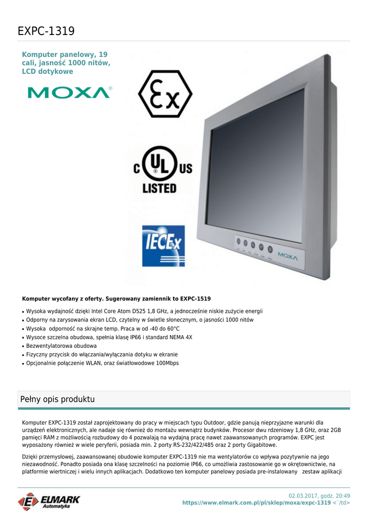 EXPC-1319 Komputer panelowy, 19 cali, jasność 1000 nitów, LCD dotykowe Komputer wycofany z oferty. Sugerowany zamiennik to EXPC-1519 ● Wysoka wydajność dzięki Intel Core Atom D525 1,8 GHz, a jednocześnie niskie zużycie energii ● Odporny na zarysowania ekran LCD, czytelny w świetle słonecznym, o jasności 1000 nitów ● Wysoka odporność na skrajne temp. Praca w od -40 do 60°C ● Wysoce szczelna obudowa, spełnia klasę IP66 i standard NEMA 4X ● Bezwentylatorowa obudowa ● Fizyczny przycisk do włączania/wyłączania dotyku w ekranie ● Opcjonalnie połączenie WLAN, oraz światłowodowe 100Mbps Pełny opis produktu Komputer EXPC-1319 został zaprojektowany do pracy w miejscach typu Outdoor, gdzie panują nieprzyjazne warunki dla urządzeń elektronicznych, ale nadaje się również do montażu wewnątrz budynków. Procesor dwu rdzeniowy 1,8 GHz, oraz 2GB pamięci RAM z możliwością rozbudowy do 4 pozwalają na wydajną pracę nawet zaawansowanych programów. EXPC jest wyposażony również w wiele peryferii, posiada min. 2 porty RS-232/422/485 oraz 2 porty Gigabitowe. Dzięki przemysłowej, zaawansowanej obudowie komputer EXPC-1319 nie ma wentylatorów co wpływa pozytywnie na jego niezawodność. Ponadto posiada ona klasę szczelności na poziomie IP66, co umożliwia zastosowanie go w okrętownictwie, na platformie wiertniczej i wielu innych aplikacjach. Dodatkowo ten komputer panelowy posiada pre-instalowany zestaw aplikacji 02.03.2017, godz. 20:49 https://www.elmark.com.pl/pl/sklep/moxa/expc-1319 <`/td> do samo diagnostyki, i nadzoru zdalnego, który miedzy innymi korzysta z SNMP. Innowacyjna funkcja IHS – Inteligent Heating Solution kontroluje temperaturę wewnątrz obudowy, i gdy spadnie ona poniżej określonego progu to załącza się układ nagrzewający. Komputer 1319 z wbudowanym systemem IHS może pracować w temp. od -40 do 60°C, co stawia go w ścisłej czołówce urządzeń tej klasy. Ekran 1319 jest również warty podkreślenia ponieważ posiada on twardą szklaną powłokę która zapobiega powstawaniu rys, oraz umożliwia czytelność informacji nawet w bardzo słoneczny dzień. Ekran występuje w dwóch wersjach: single touch (jedno punktowy dotyk, technologia rezystancyjna) oraz multi touch (wielopunktowy dotyk, technologia pojemnościowa). Do końca listopada 2013 model ten powinien otrzymać certyfikat Atex Zone 2, co dodatkowo pozwoli na stosowanie go w miejscach zagrożonych wybuchem. Reasumując EXPC-1319 to zaawansowany komputer panelowy który sprawdzi się w nawet bardzo ekstremalnych warunkach, a doświadczenie firmy Moxa gwarantuje najwyższą jakość wykonania. Klip opisujący komputer: Specyfikacja techniczna • Komputer CPU Intel Atom D525 dual core 1.8 GHz OS Windows Embedded Standard 7 Chipset Intel Pineview-D+ ICH8M BIOS 16 Mbit Flash BIOS, SPI type with ACPI Układ graficzny Zintegrowany kontroler graficzny Intel GMA3150 Wyjście wideo VGA, wodoodporne DB-15 (żeńskie) Pamięć RAM 4 GB , 2 GB pre-instalowane: 2 sloty 2 GB DDR3-800 SO-DIMM SDRAM Wbudowany watchdog Wbudowany programowy timer watchdog do resetowania komputera. Możliwa konfiguracja interwału timera od 1 do 255 s. Magistrala rozszerzeń 1 PCI-104 slot, 1 mini PCIe socket USB 2 USB 2.0 host, wododporne okrągłe złąćze typu A Klawiatura/Mysz Złącze PS/2 dla klawiatury i myszki dzięki dołączonemu rozgałęziaczowi, wodoporne złącze (opcjonalnie) • Pamięć masowa Rozbudowa pamięci • wbudowany soket CompactFlash x 1 • jeden dodatkowy interfejs SATA , wspierający RAID 0/1 Pamięć podstawowa Wyjmowany dysk 32 GB SSD (-40 to 85°C) do przechowywania system operacyjnego; wparcie do 256 GB • Wyświetlacz Wielkość 19 cali SXGA, 1000 nit LED, podświetlanie LCD Współczynnik proporcji 5:4 02.03.2017, godz. 20:49 https://www.elmark.com.pl/pl/sklep/moxa/expc-1319 <`/td> Czas reakcji 5 ms Kontrast 1000:1 Kąty widzenia • Poziomo: 170° (od lewej do prawej) • Pionowo: 160° (z góry do dołu) Maks. kolorów 16.7 M Karta graficzna Zintegrowana karta Intel GMA3150 Wyjście karty graf. VGA, złącze DB15 (żeńskie) wodoodporne Rozdzielczości • VGA: 640 x 480 • SVGA: 800 x 600 • XGA: 1024 x 768 • SXGA: 1280 x 1024 • Ekran dotykowy EXPC-1319-STS Rezystancyjny jednopunktowy ekran pokryty szkłem EXPC-1319-MTS Pojemnościowy wielopunktowy ekran (na żądanie) Uwaga Wszystkie ekrany dotykowe komputerów EXPC-1319 są odporne na zarysowania i mają warstwę anty refleksyjną, która ułatwia odczyt z ekranu w pełnym słońcu • Interfejs Ethernet Hardware Wodoodporne złącze RJ45 LAN 2x auto-sensing 10/100/1000 Mbps Światłowód 2x multimodowy, 100Mbps, wodoodporne złącze Q-ODC (na żądanie) WLAN 1 802.11b/g/n (na żądanie) Izolacja magnetyczna 1.5 kV built-in • Interfejs szeregowy Standardy 2 RS-232/422/485 ports, programowo wybieralne Złącze Wodoodporne złącze DB-9 (męskie) Baudrate do 38,400 bps Izolacja optyczna 2 kV • Parametry komunikacji szeregowej Bity danych 5, 6, 7, 8 Bity stopu 1, 1.5, 2 Pażystość None, Even, Odd, Space, Mark Kontrola przepływu RTS/CTS, XON/XOFF, ADDC® (automatyczna kontrola przepływu) dla RS-485 02.03.2017, godz. 20:49 https://www.elmark.com.pl/pl/sklep/moxa/expc-1319 <`/td> Baudrate Do 38,400 bps • Sygnały komunikacji szeregowej RS-232 TxD, RxD, DTR, DSR, RTS, CTS, DCD, GND RS-422 TxD+, TxD-, RxD+, RxD-, GND RS-485-4w TxD+, TxD-, RxD+, RxD-, GND RS-485-2w Data+, Data-, GND • Diody LED i przyciski LEDy zasilanie on/off, ogrzewacz on/off, dysk, LAN x 2, port światłowodowy Przyciski Przycisk uruchomiania, nastawy jasności x 2, kontrola ekranu dotykowego on/off, programowalny GUZIK funkcyjny "Fn" • Charakterystyka mechaniczna Obudowa Aluminium Waga • 10.7 kg (bez system pogrzewania IHS) • 11.9 kg (Z systemem IHS) Wymiary 483 x 408 x 99 mm (19.02 x 16.06 x 3.90 cal) Montowanie Otwory montażowe pod VESA 75/100, jażmo (yoke), i montaż panelowy • Limity środowiskowe Temp prac