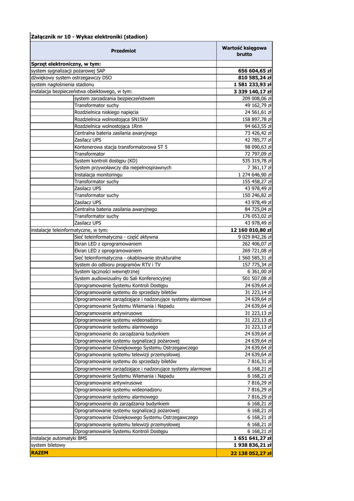 Załącznik nr 10 - Wykaz elektroniki (stadion) Przedmiot Wartość księgowa brutto Sprzęt elektroniczny, w tym: system sygnalizacji pożarowej SAP dźwiękowy system ostrzegawczy DSO system nagłośnienia stadionu instalacja bezpieczeństwa obiektowego, w tym: system zarzadzania bezpieczeństwem Transformator suchy Rozdzielnica niskiego napięcia Rozdzielnica wolnostojąca SN15kV Rozdzielnica wolnostojąca 1Rnn Centralna bateria zasilania awaryjnego Zasilacz UPS Kontenerowa stacja transformatorowa ST 5 Transformator System kontroli dostępu (KD) System przywoławczy dla niepełnosprawnych Instalacja monitoringu Transformator suchy Zasilacz UPS Transformator suchy Zasilacz UPS Centralna bateria zasilania awaryjnego Transformator suchy Zasilacz UPS instalacje teleinformatyczne, w tym: Sieć teleinformatyczna - część aktywna Ekran LED z oprogramowaniem Ekran LED z oprogramowaniem Sieć teleinformatyczna - okablowanie strukturalne System do odbioru programów RTV i TV System łączności wewnętrznej System audiowizualny do Sali Konferencyjnej Oprogramowanie Systemu Kontroli Dostępu Oprogramowanie systemu do sprzedaży biletów Oprogramowanie zarządzające i nadzorujące systemy alarmowe Oprogramowanie Systemu Włamania i Napadu Oprogramowanie antywirusowe Oprogramowanie systemu wideonadzoru Oprogramowanie systemu alarmowego Oprogramowanie do zarządzania budynkiem Oprogramowanie systemu sygnalizacji pożarowej Oprogramowanie Dźwiękowego Systemu Ostrzegawczego Oprogramowanie systemu telewizji przemysłowej Oprogramowanie systemu do sprzedaży biletów Oprogramowanie zarządzające i nadzorujące systemy alarmowe Oprogramowanie Systemu Włamania i Napadu Oprogramowanie antywirusowe Oprogramowanie systemu wideonadzoru Oprogramowanie systemu alarmowego Oprogramowanie do zarządzania budynkiem Oprogramowanie systemu sygnalizacji pożarowej Oprogramowanie Dźwiękowego Systemu Ostrzegawczego Oprogramowanie systemu telewizji przemysłowej Oprogramowanie Systemu Kontroli Dostępu instalacje automatyki BMS system biletowy 656 604,65 zł 810 585,24 zł 1 581 233,93 zł 3 339 140,17 zł 209 008,06 zł 49 162,79 zł 24 561,61 zł 158 897,78 zł 94 663,55 zł 73 426,42 zł 42 785,77 zł 98 090,63 zł 72 797,09 zł 535 319,78 zł 7 361,17 zł 1 274 646,90 zł 155 458,27 zł 43 978,49 zł 150 246,82 zł 43 978,49 zł 84 725,04 zł 176 053,02 zł 43 978,49 zł 12 160 010,80 zł 9 029 842,26 zł 262 406,07 zł 269 721,08 zł 1 560 585,31 zł 157 775,34 zł 6 361,00 zł 501 507,08 zł 24 639,64 zł 31 223,14 zł 24 639,64 zł 24 639,64 zł 31 223,13 zł 31 223,13 zł 31 223,13 zł 24 639,64 zł 24 639,64 zł 24 639,64 zł 24 639,64 zł 7 816,31 zł 6 168,21 zł 6 168,21 zł 7 816,29 zł 7 816,29 zł 7 816,29 zł 6 168,21 zł 6 168,21 zł 6 168,21 zł 6 168,21 zł 6 168,21 zł 1 651 641,27 zł 1 938 836,21 zł RAZEM 22 138 052,27 zł